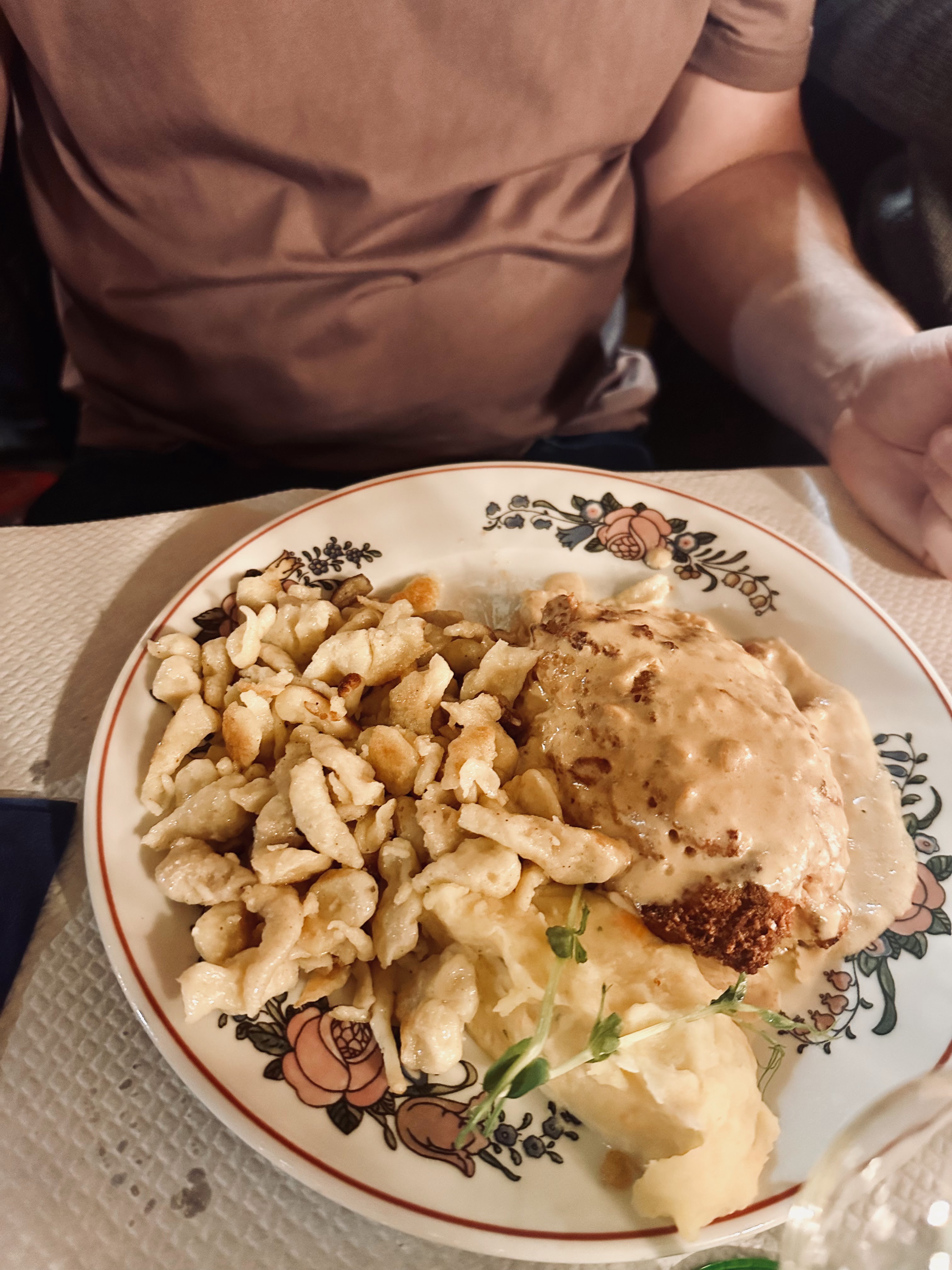 Cordon bleu excellent servi pour moi avec de la choucroute et des spaetzle, plat extrêmement copieux, la serveuse nous a sympathiquement donné une boîte pour prendre les restes avec. Joli resto typique alsacien. J'y retournerais les yeux fermés