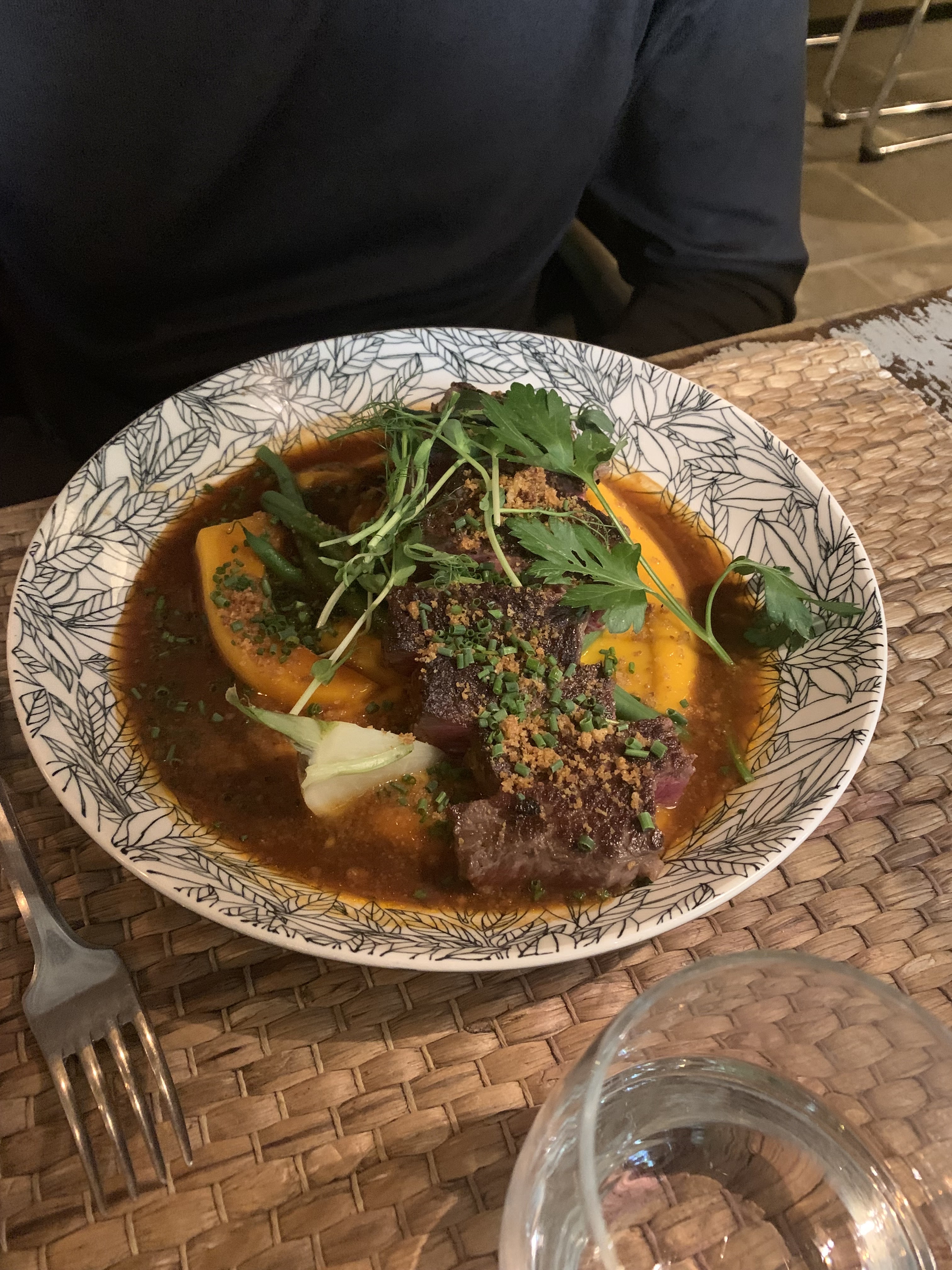 C'est un cadre magnifique et les serveurs étaient tous très gentils. La nourriture est de bonne qualité - elle a un goût très fait maison, les portions sont bonnes, mais les saveurs ne sont pas exceptionnelles pour le prix que vous payez. Nous avons pris le ragoût de bœuf et les côtes de porc comme plat principal et nous l'avons apprécié, mais nous ne pensions pas que cela valait le prix du repas.