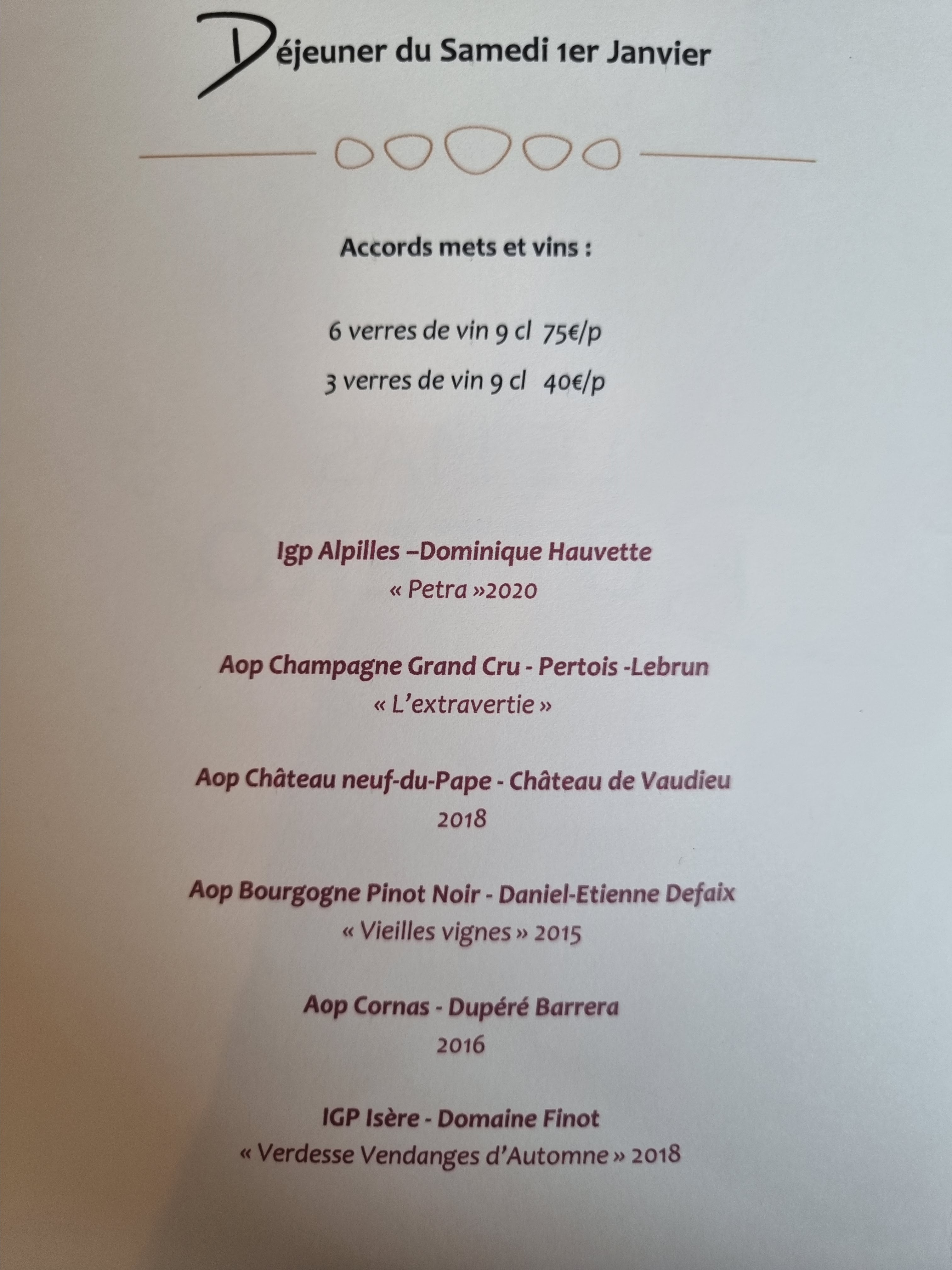 Belle soirée gastronomique parfaitement synchronisée et offrant une variété de saveurs aussi agréables les unes que les autres tout au long de ce menu . Un seul petit mais vraiment petit bémol concerne l'accord mets et vins , le palais des femmes étant un peu diffèrent de celui des hommes , pensez à leur proposer quelque chose de moins puissant . Le point positif , c'est que j'ai terminé les verres de madame mais , chut , ne le dites à personne .