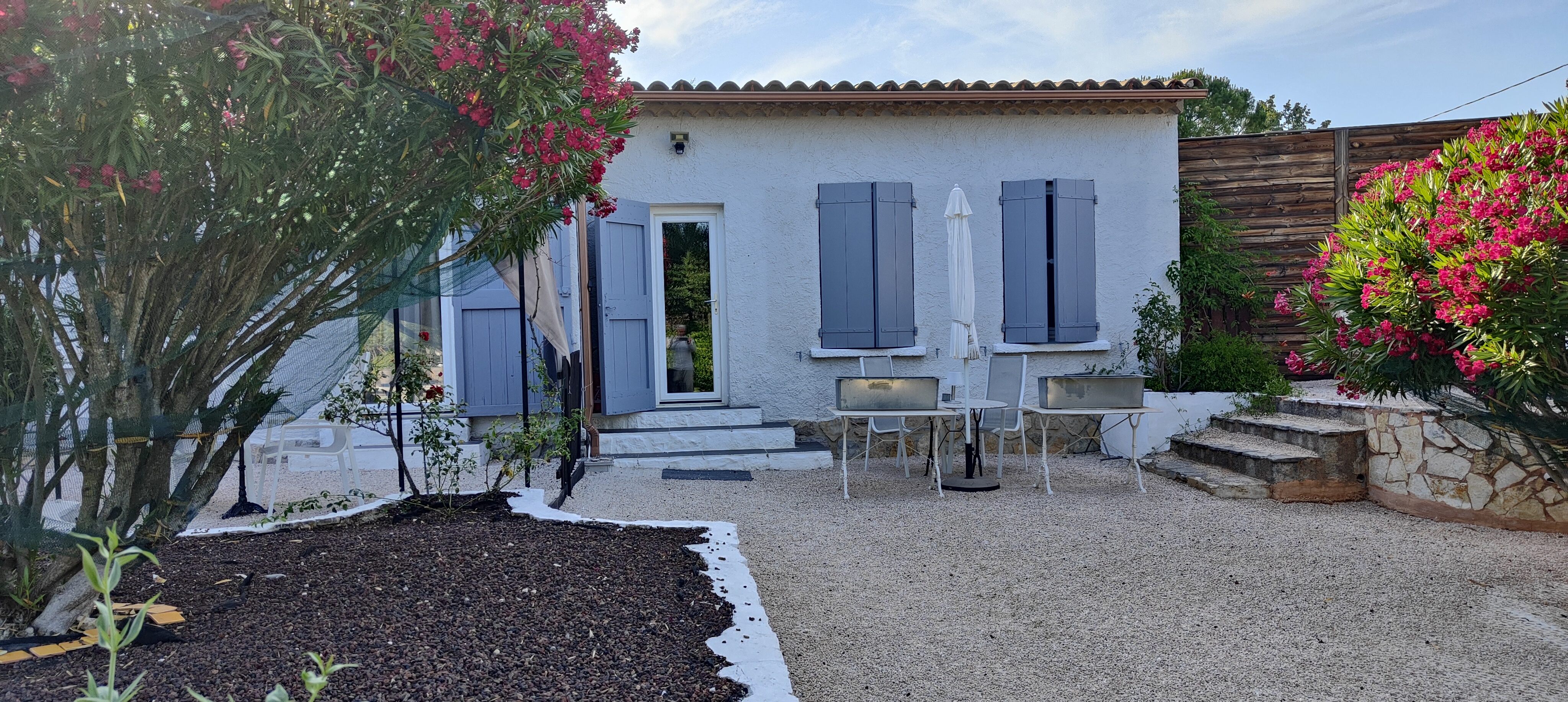 Nous étions invités dans la Maison pendant une semaine fin avril début mai et avions réservé un appartement. L'ensemble de l'installation est magnifique. Les appartements sont tous au rez-de-chaussée dans un jardin très bien entretenu - fleurs/oliviers/piscine/transats et sièges, parking privé et nombreux pots variés d'herbes de Provence. Les deux propriétaires, Denis et Sylvia, s'occupent avec beaucoup d'amour des 10 hôtes maximum de l'établissement. Notre appartement - séjour/chambre - et pas de lits français/salle de bain et toilettes supplémentaires - était entretenu chaque jour par Sylvie. Denis s'occupe du petit-déjeuner - tout ce que votre cœur désire - et son menu du soir à 19h30 était toujours composé de deux entrées plus un plat et deux desserts - un simple « poème » chaque soir. Une carte des vins bien fournie dont les prix sont tout à fait corrects, mais de la bière et de l'eau peuvent également être commandées. La Maison est située à environ 3 km avant Cotignac sur un domaine sécurisé ouvrable par un portail sans fil. Le premier soir, Denis a indiqué sur une carte les endroits qui valaient le détour. Nous avons également visité tout cela au cours de la semaine. Pour nous, c'était la première visite en Provence - mais nous ne pensons pas que ce sera la dernière. Si nous devions revenir une deuxième fois, ce serait certainement un peu plus tard en mai ou pendant les vendanges en automne. Nos remerciements vont à Sylvie et Denis pour leur chaleureux accueil. Christine+Wolf-Dieter d'Erfurt