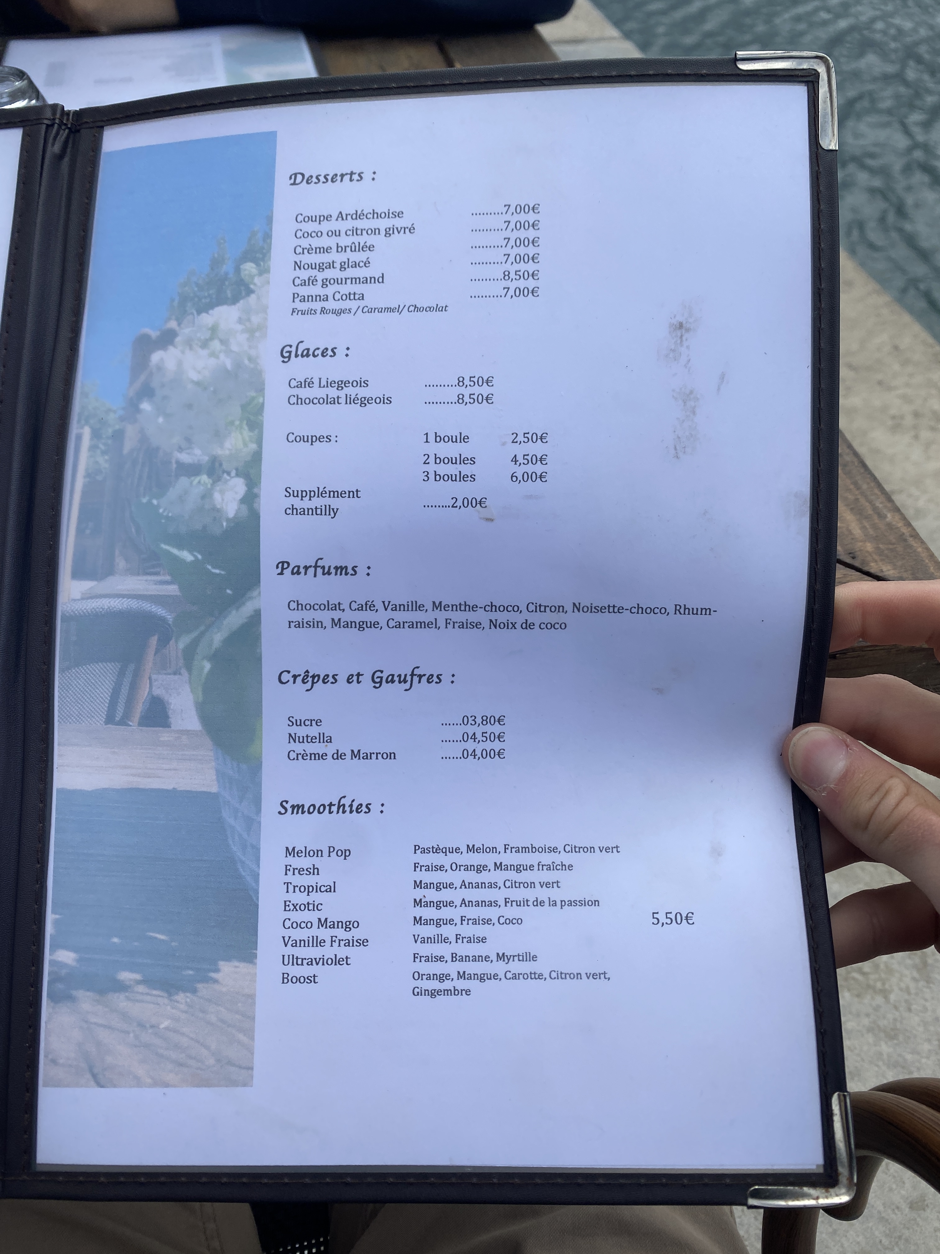 Un peu cher pour ce que c'est. Nous étions très bien placés au bord du Canal. Très belle vue ! Les lasagnes de la mer étaient un peu lourdes et pâteuses. Le dessert choisi était du fromage blanc à la crème de châtaigne, mais nous avons eu de la panna cotta trop gélatineuse et, surtout, on ne nous a pas avertis.