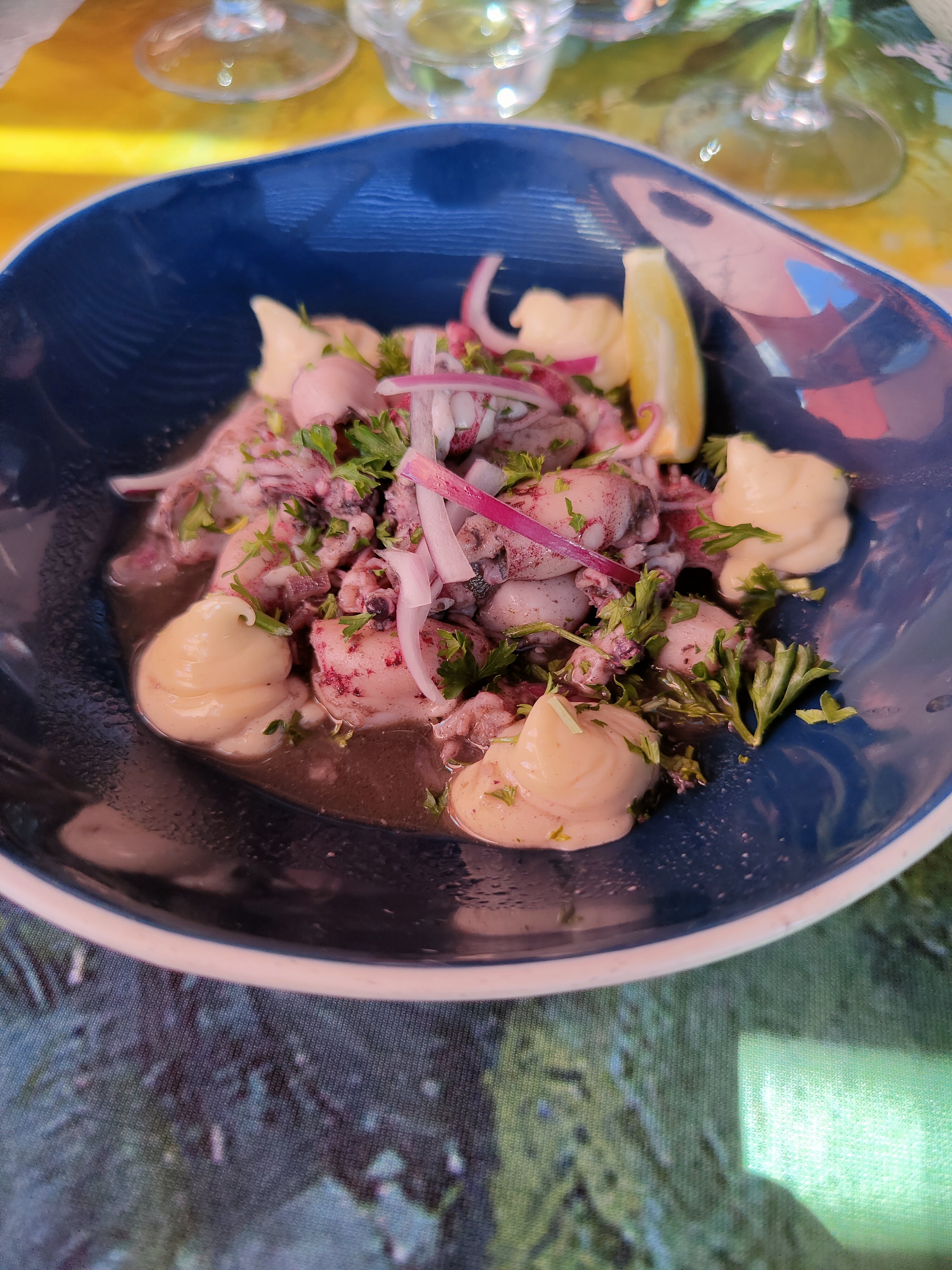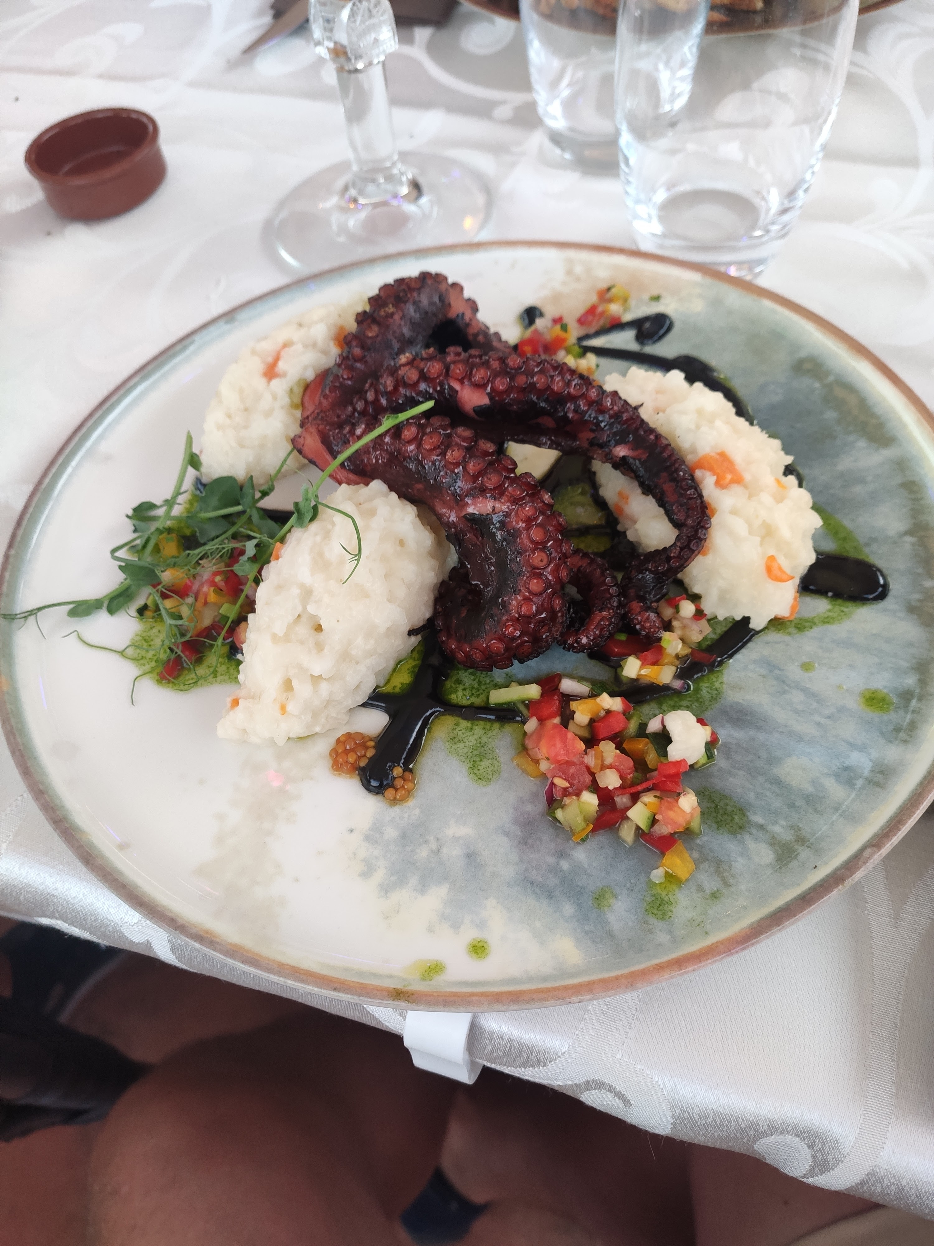 Réservation à l'avance nécessaire. Très bon restaurant avec vue idyllique. J'ai pris l'oeuf parfait et le poulpe. Seul bémol : notre table a été placée en bout de terrasse sous les voiles (et non la pergola) qui ont mal été fixée : elles laissent passer le soleil. Donc j'étais en plein soleil une bonne partie du repas. Heureusement cela ne concernait que ma place !