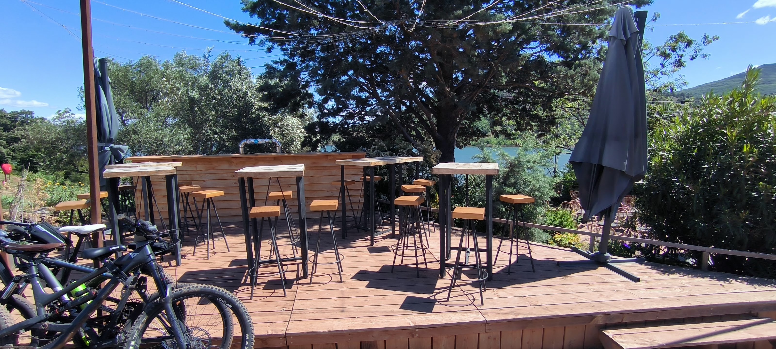 La terasse propose une très belle vue du lac. On a été très bien accueillis. Un concert pour le soir était en préparation .