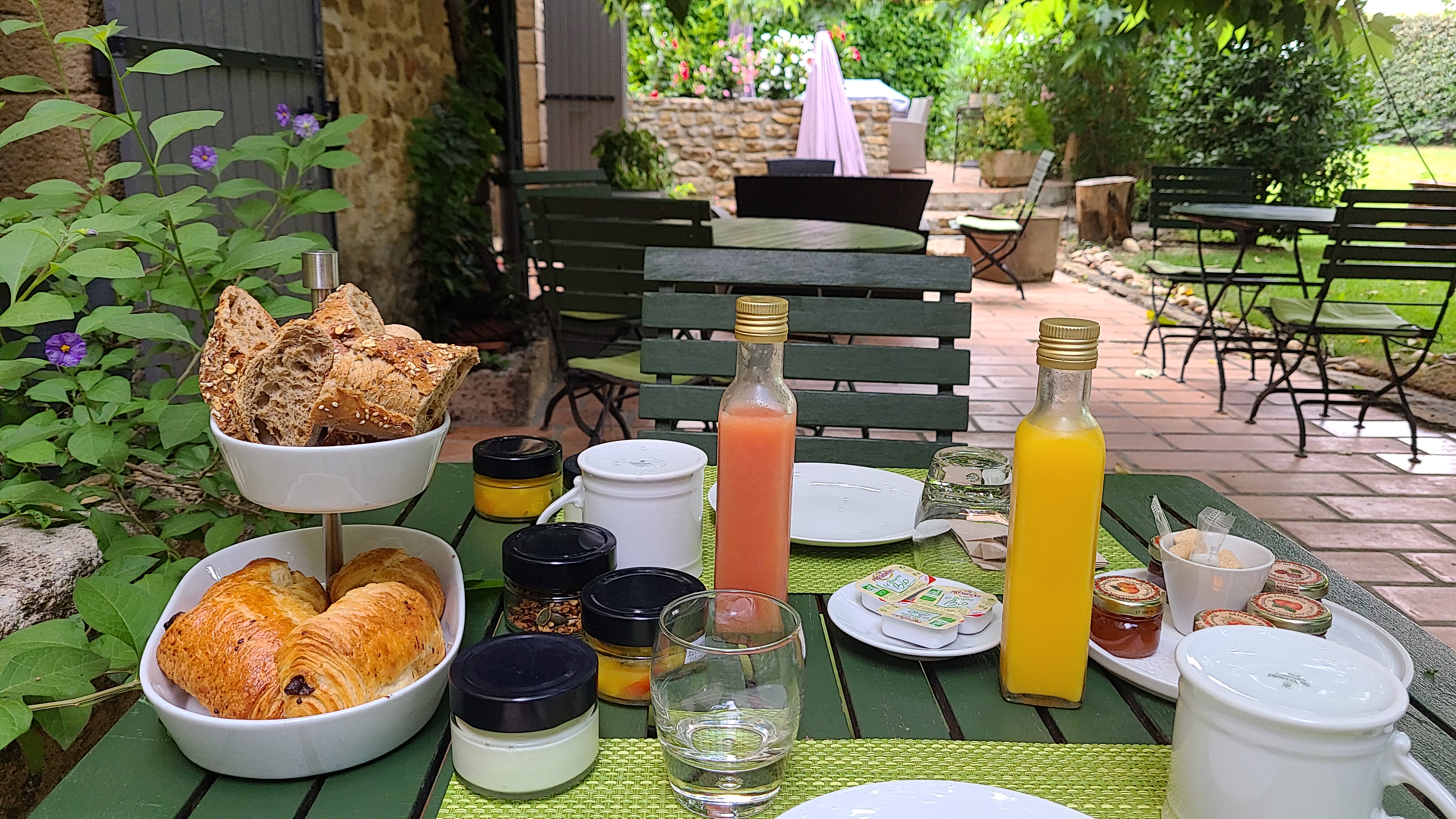 Paisible , Le lieu est très agréable. La Clientèle se glisse dans ce cocon de verdure avec la discrétion qu’inspire l’endroit. J’ai beaucoup apprécié que la famille trop très bruyante à la piscine a été priée par Alain avec tact de diminuer les décibels. Le restaurant est sympa bien que pas assez copieux selon moi . Sans réservation n’y comptez pas , a moins d’avoir de la chance . Le petit dej est quand à lui bien servi . Et l’amabilité de Théo ( le fils) est un bonheur dès le réveil.