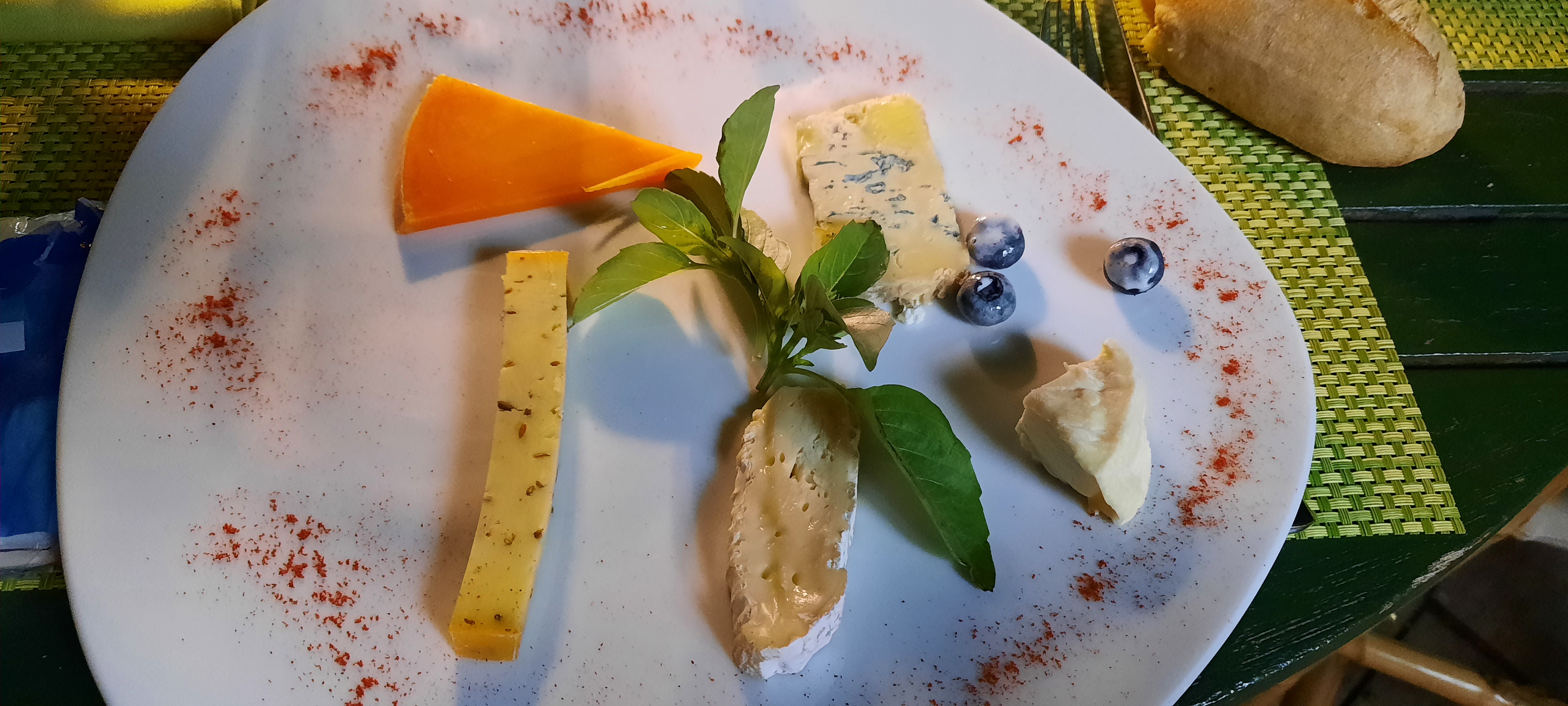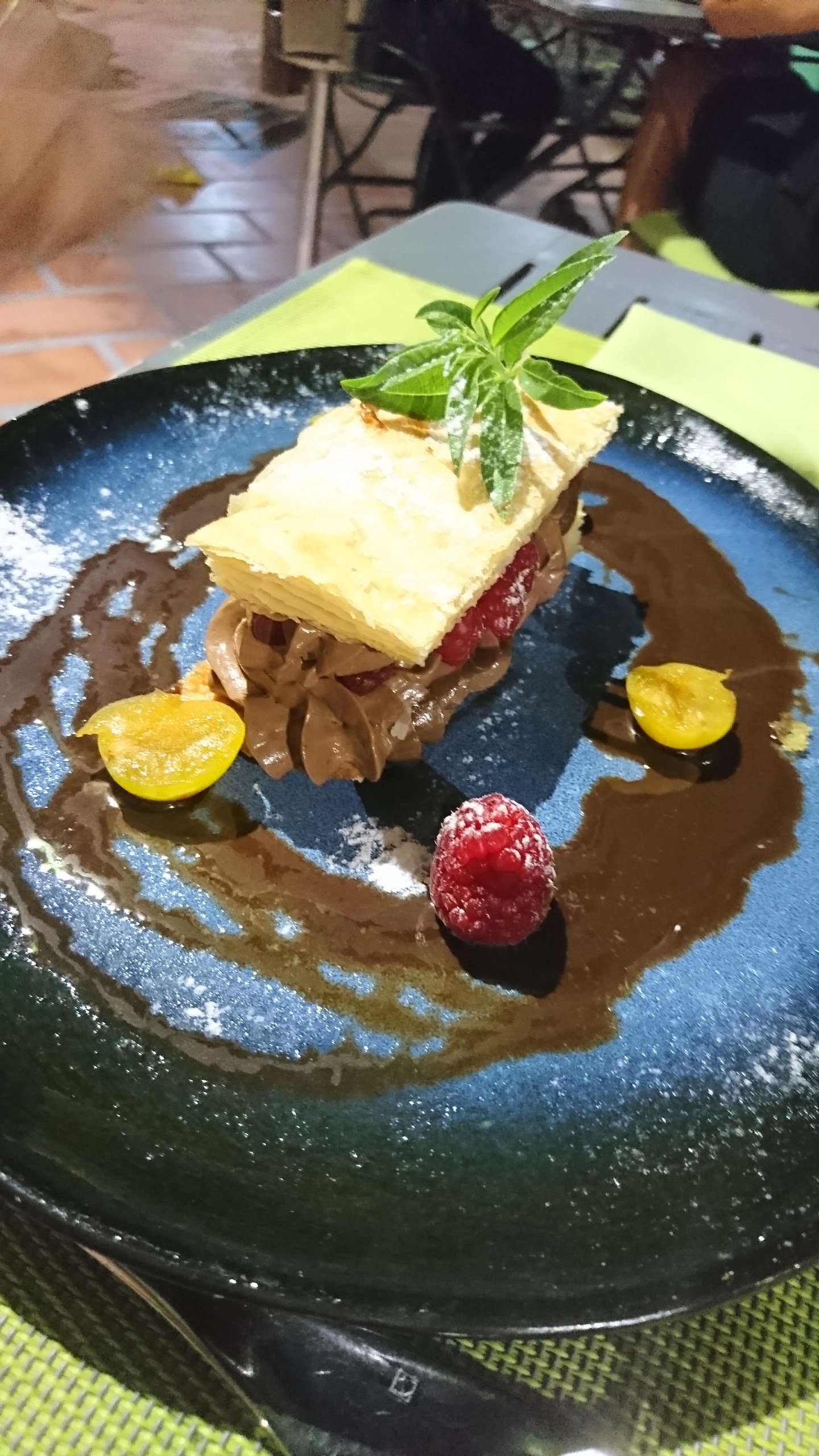 L'endroit est très agréable et calme. Nous y avons passé une nuit. Le restaurant est calme et confortable. Nous nous sommes assis en terrasse. Ils proposent un menu (premier, deuxième et dessert) ou des plats séparés (à la carte). Ils nous ont dit que le plat à la carte était légèrement plus grand. Mon conjoint a commandé un menu, étant enceinte je n'avais pas beaucoup de choix, j'ai donc commandé un seul plat et un dessert, et on a vu la différence : Les plats à la carte ne sont pas plus grands, ce sont les mêmes que ceux de la carte. , mais plus cher . La nourriture était bonne et les desserts étaient très bons aussi.