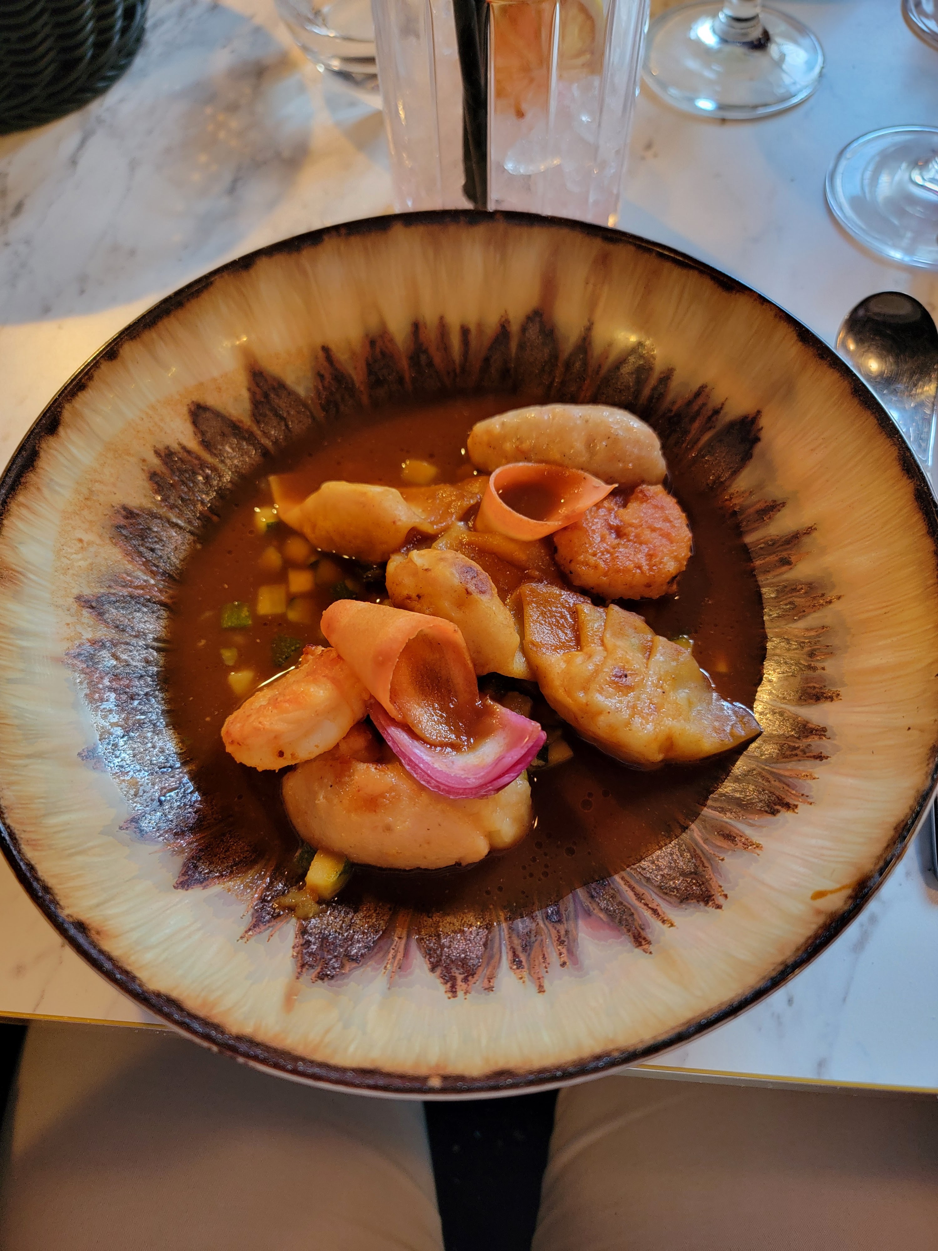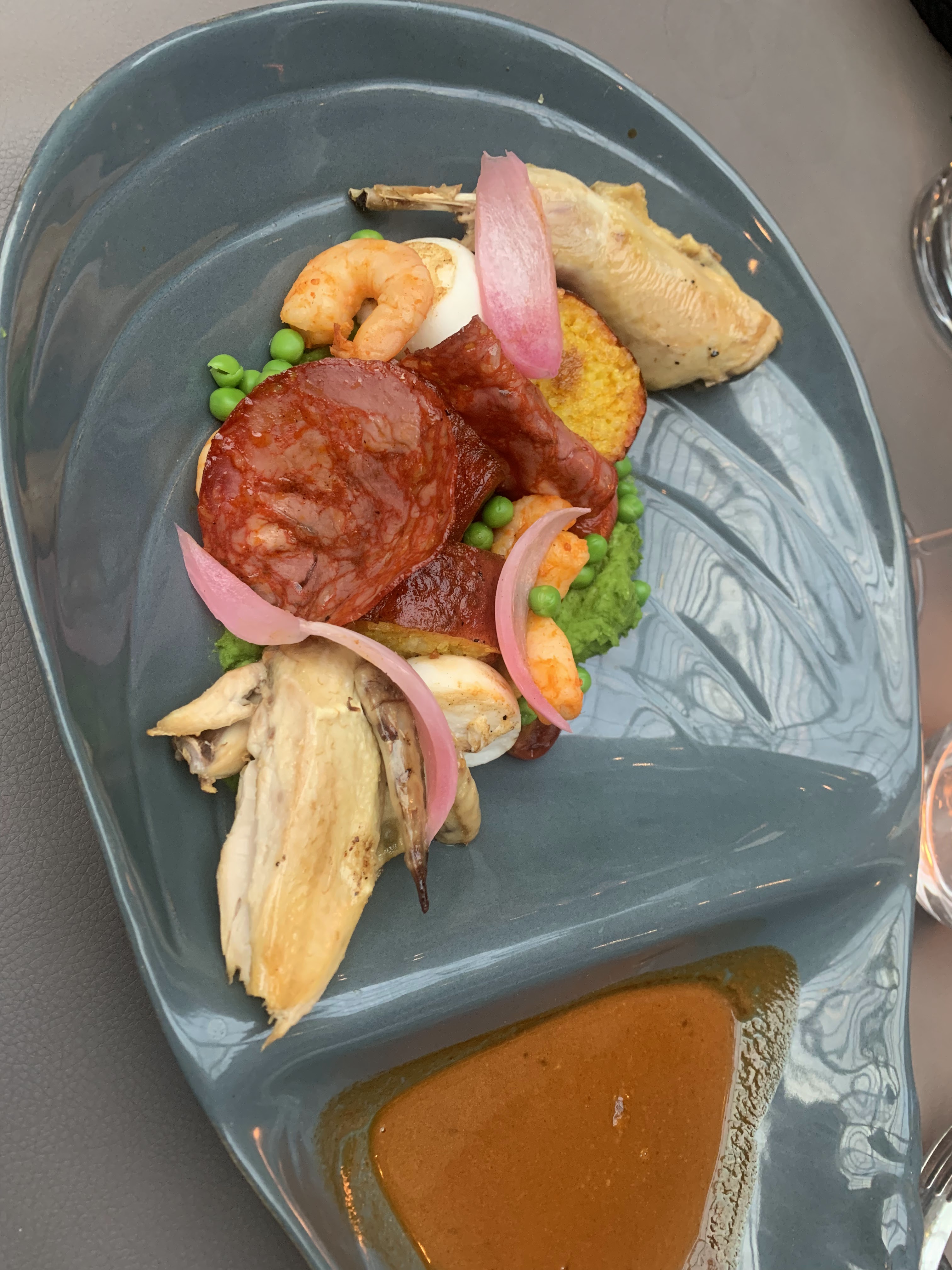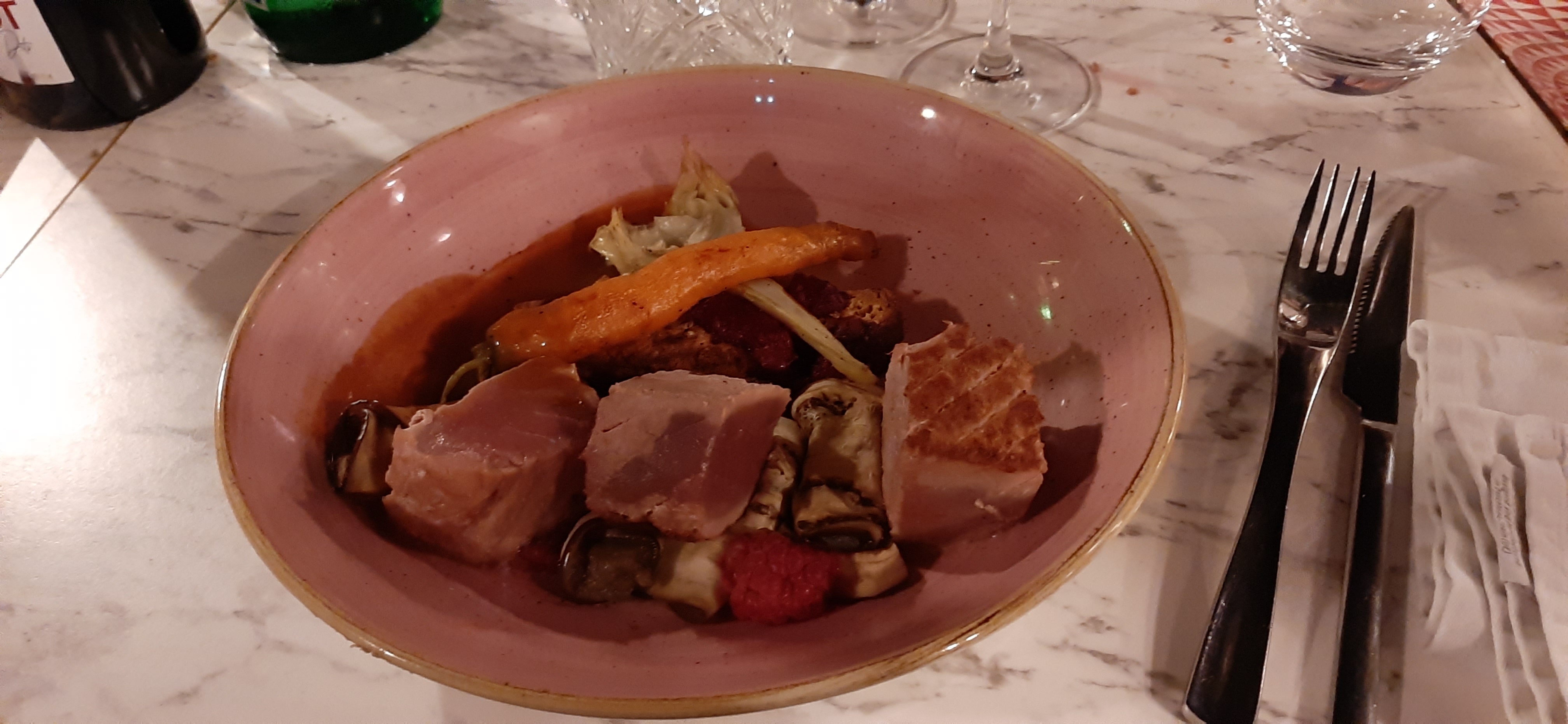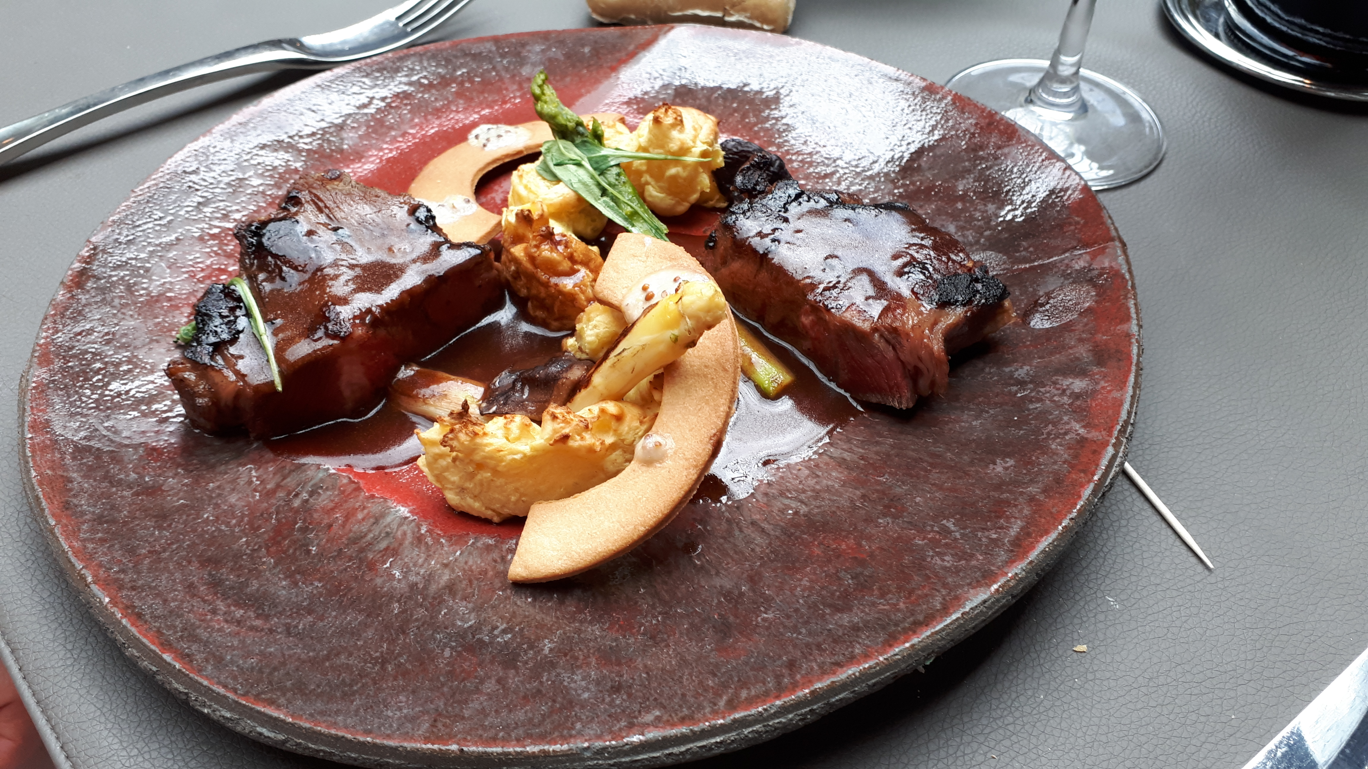 La nourriture était correcte, il y avait beaucoup d'éléments sucrés dans la nourriture que je n'apprécie pas particulièrement... le plat de langoustine avait quelque chose qui me rappelait un pain à hamburger et quelque chose de sucré sur le dessus... le steak avait du pain biscuté Le truc avec de la sauce tomate était un peu étrange (cela m'a rappelé ma première tentative de faire une pizza quand j'étais enfant), les viandes étaient bonnes mais c'était un peu exagéré.