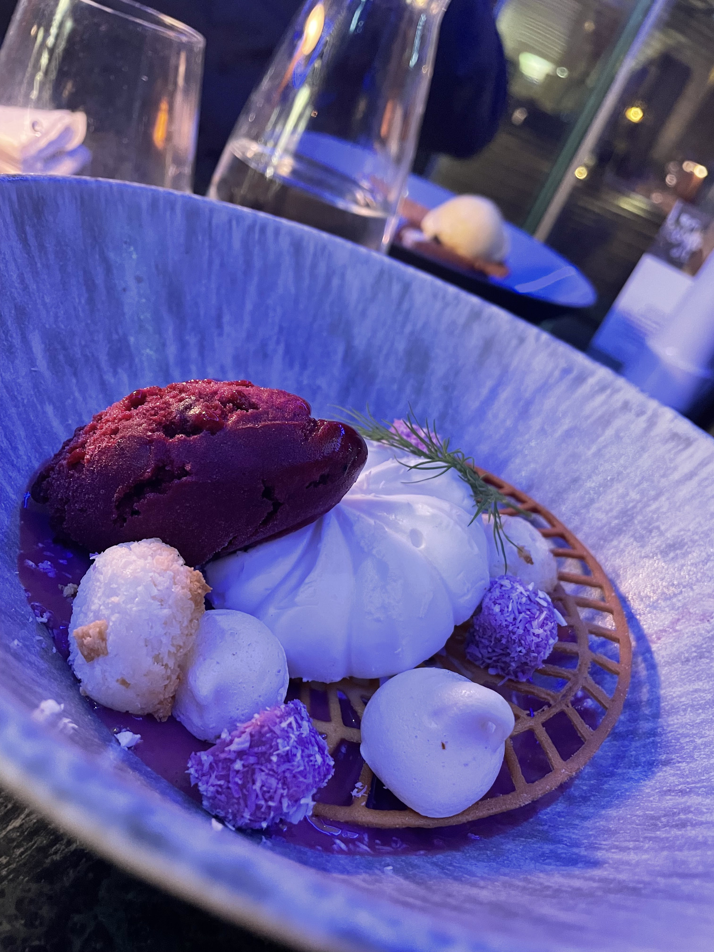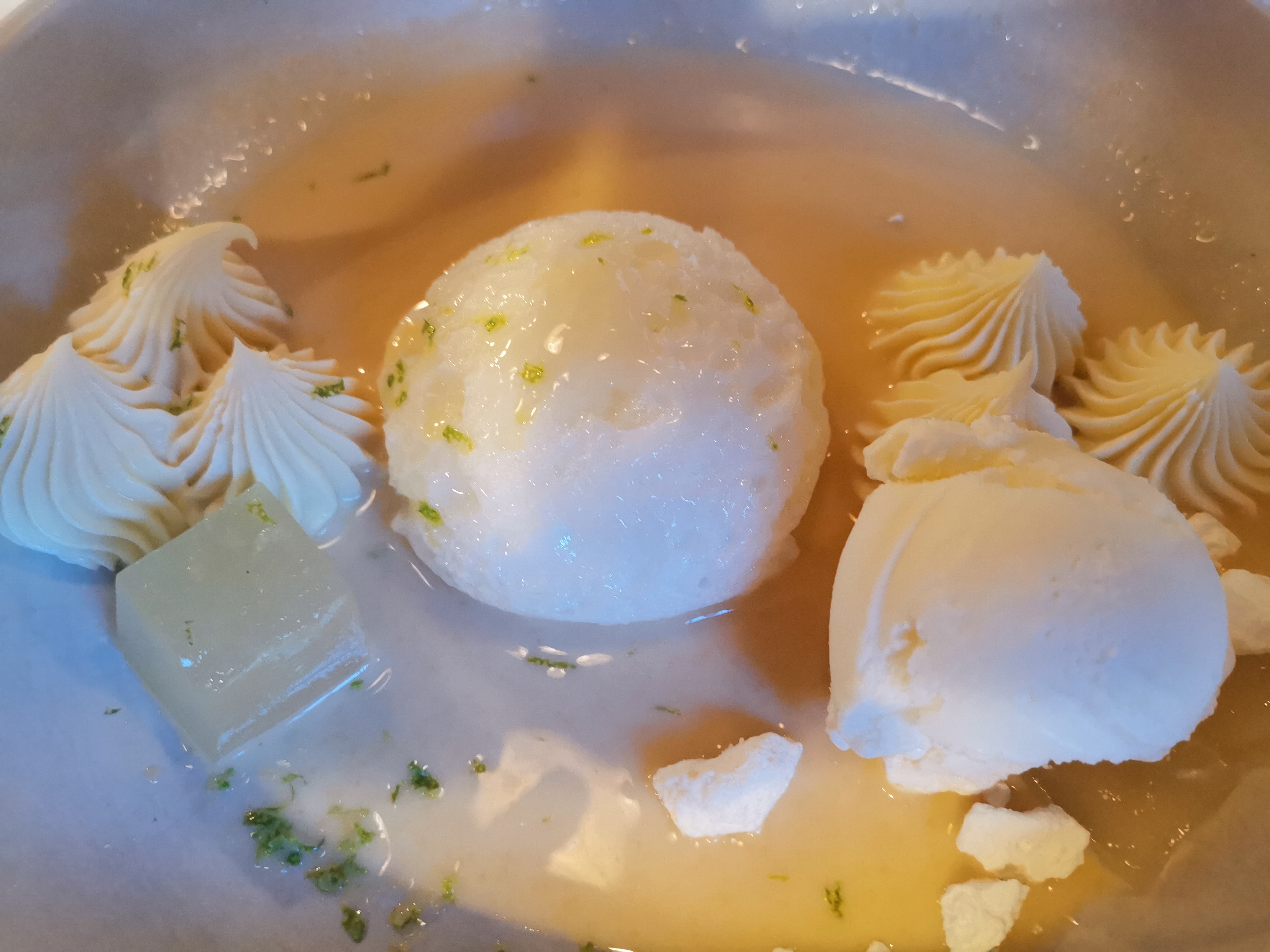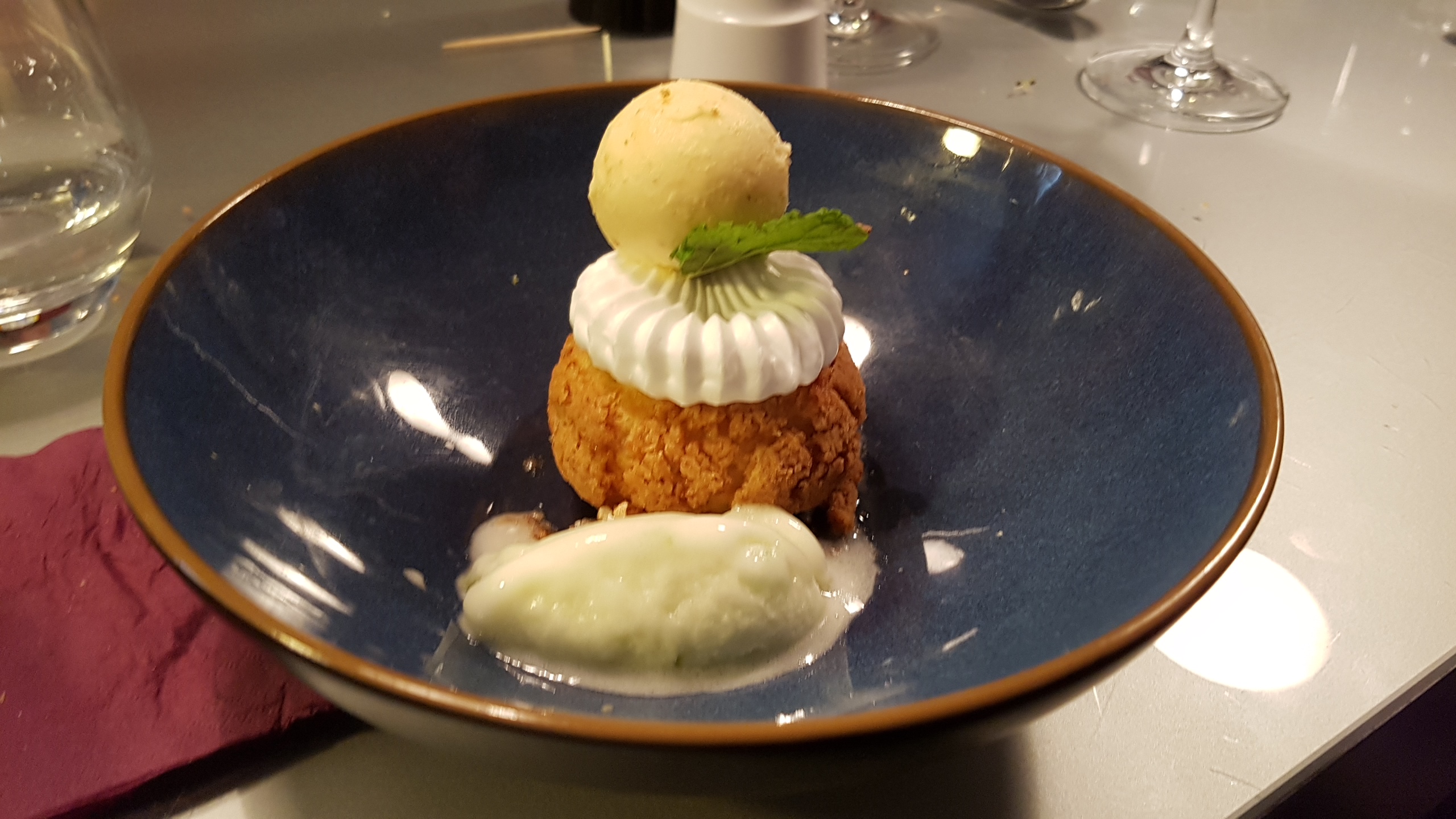 La nourriture était correcte, il y avait beaucoup d'éléments sucrés dans la nourriture que je n'apprécie pas particulièrement... le plat de langoustine avait quelque chose qui me rappelait un pain à hamburger et quelque chose de sucré sur le dessus... le steak avait du pain biscuté Le truc avec de la sauce tomate était un peu étrange (cela m'a rappelé ma première tentative de faire une pizza quand j'étais enfant), les viandes étaient bonnes mais c'était un peu exagéré.