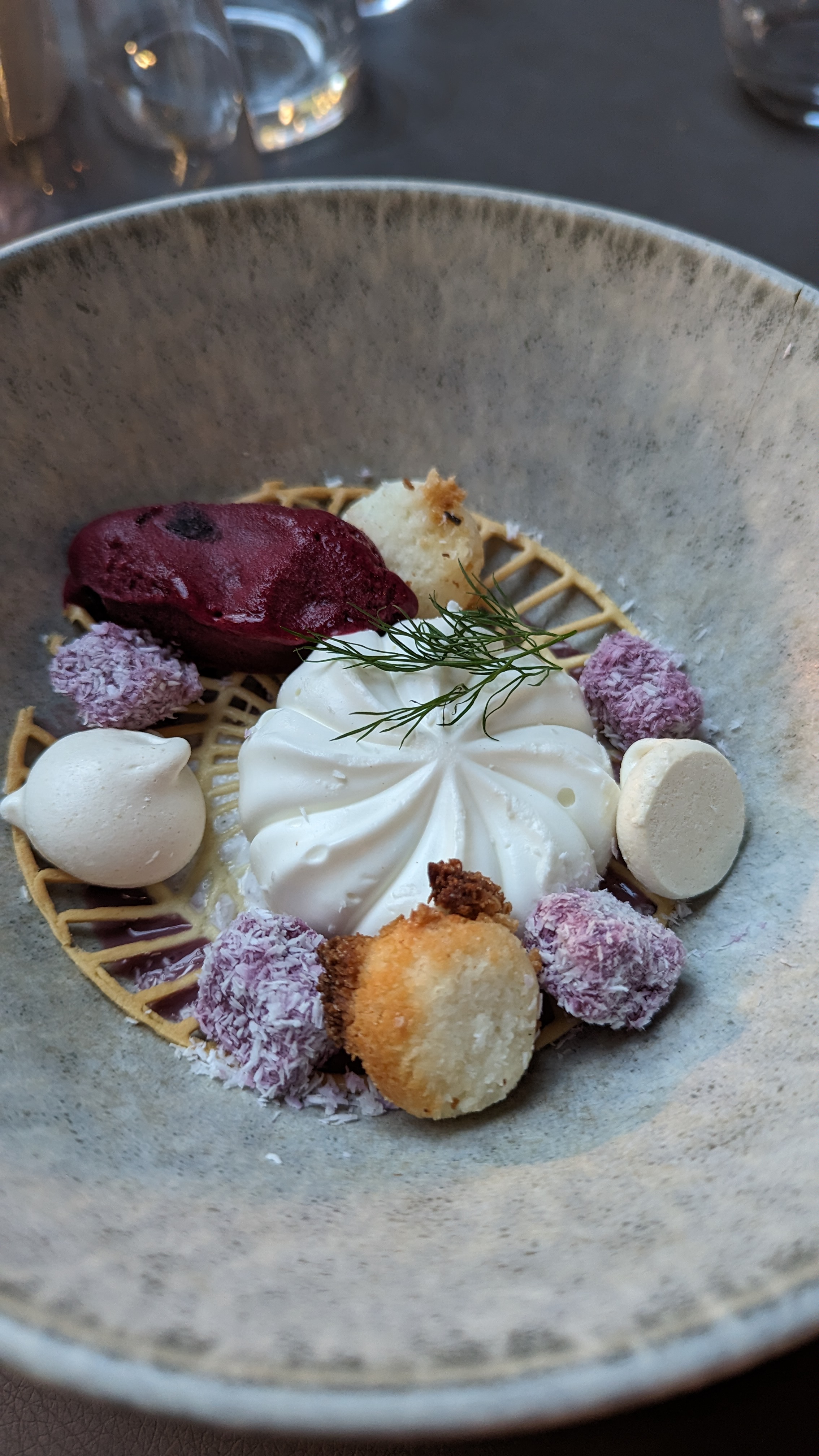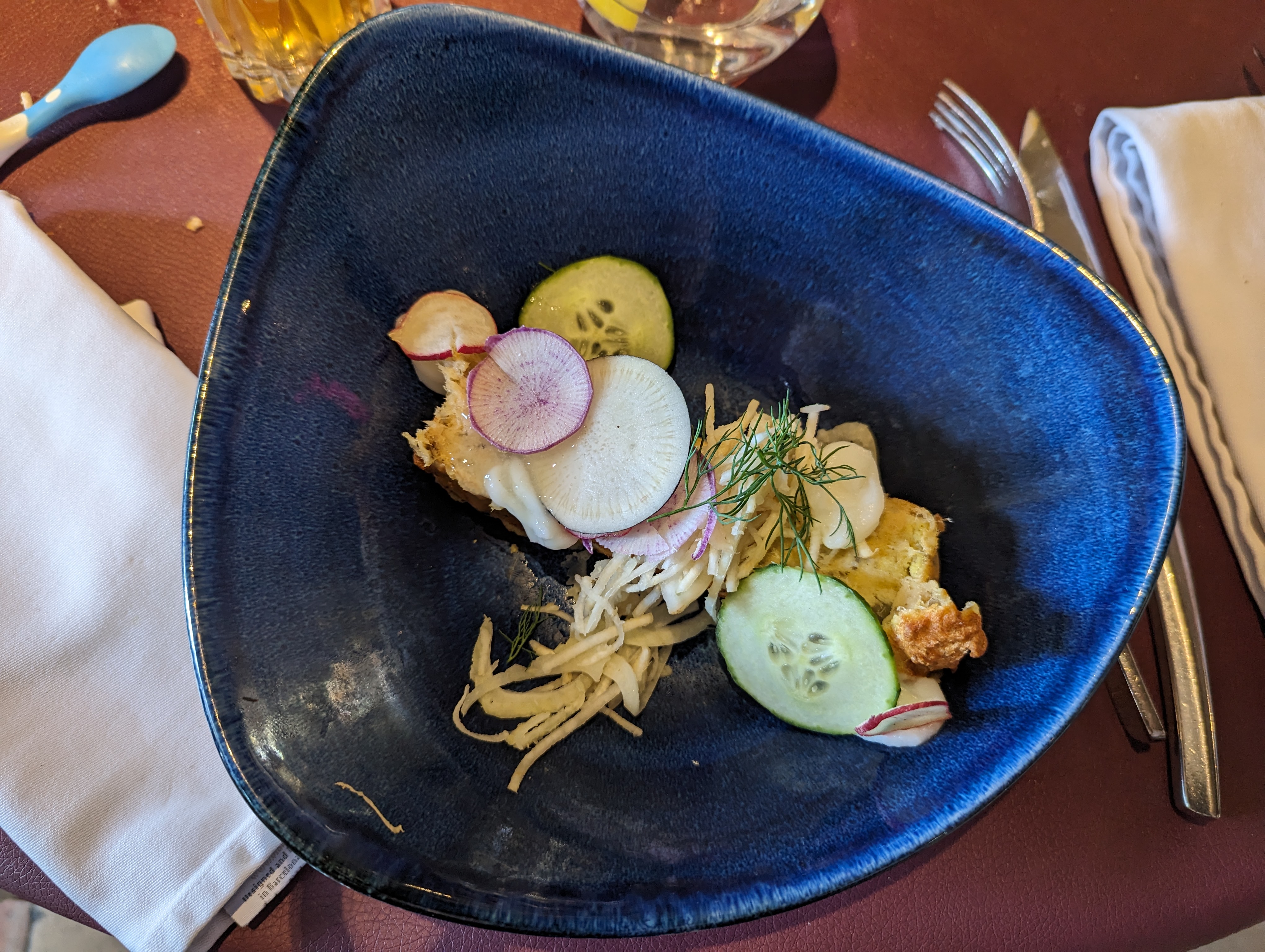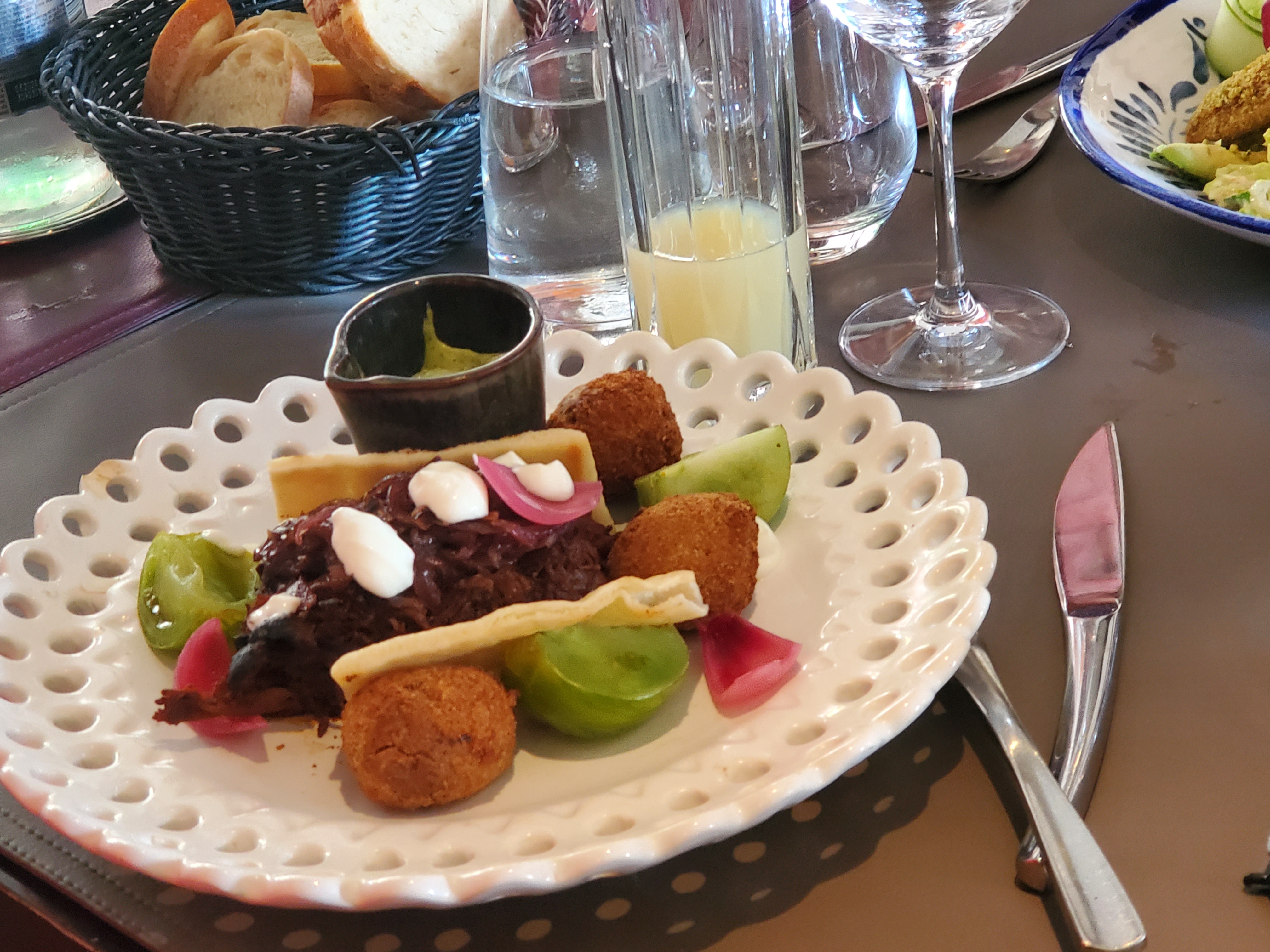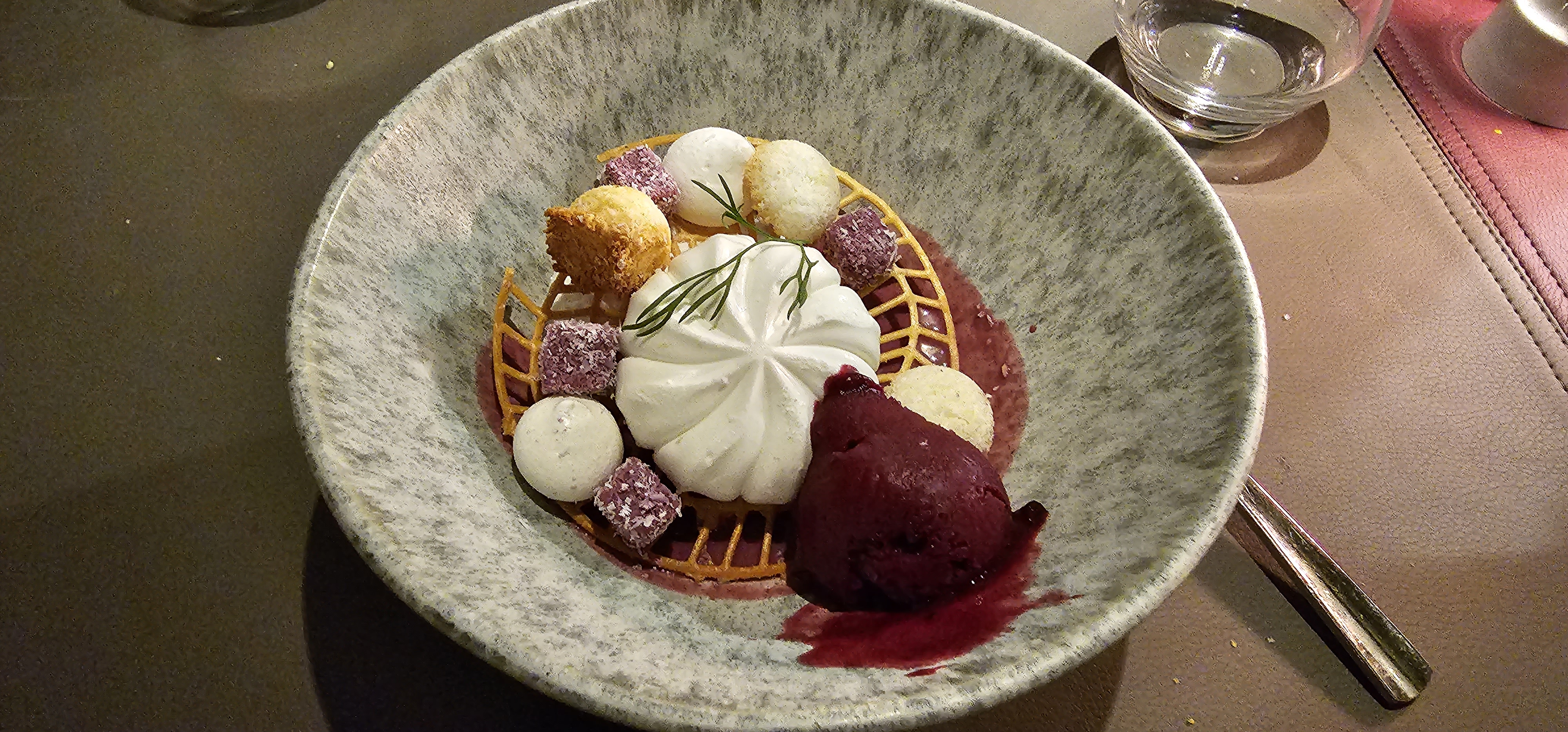 La nourriture était correcte, il y avait beaucoup d'éléments sucrés dans la nourriture que je n'apprécie pas particulièrement... le plat de langoustine avait quelque chose qui me rappelait un pain à hamburger et quelque chose de sucré sur le dessus... le steak avait du pain biscuté Le truc avec de la sauce tomate était un peu étrange (cela m'a rappelé ma première tentative de faire une pizza quand j'étais enfant), les viandes étaient bonnes mais c'était un peu exagéré.