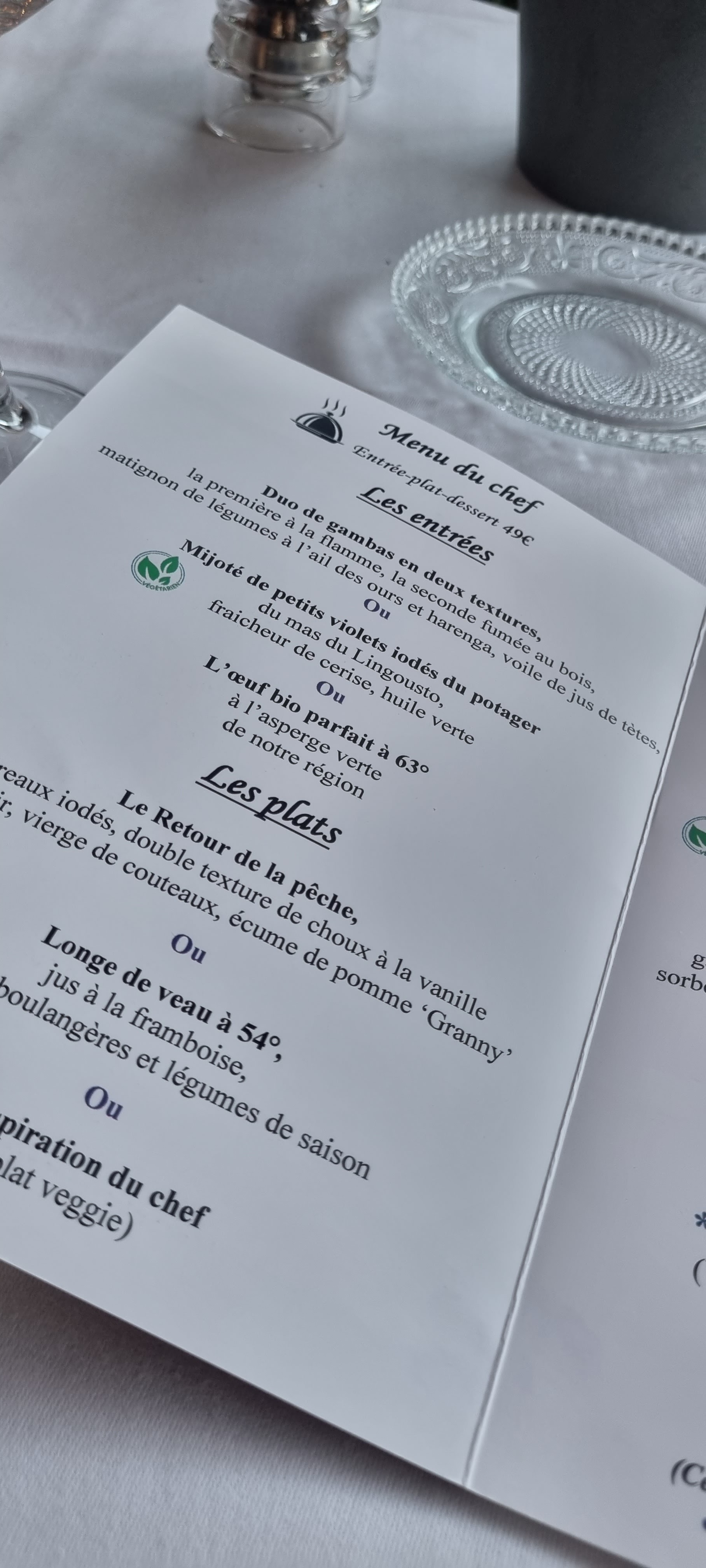 Menu unique pour la St Valentin . Belle carte des vins à des prix adaptés . Service excellent et souriant , pas de flottement . Bons conseils du jeune sommelier . Les plats sont dosés juste ce qu'il faut et souvent agrémentés de pétales de fleurs (comestibles ...) , pain à la demande . Belle expérience pour cette occasion . A faire une autre fois , un midi ... Nous y sommes retournés pour un repas familial autour d'une grande table ronde . Tout y était parfait du chariot de digestifs , aux mets dégustés en passant par le service très attentionné . Une adresse à ultra recommander pour toutes occasions .