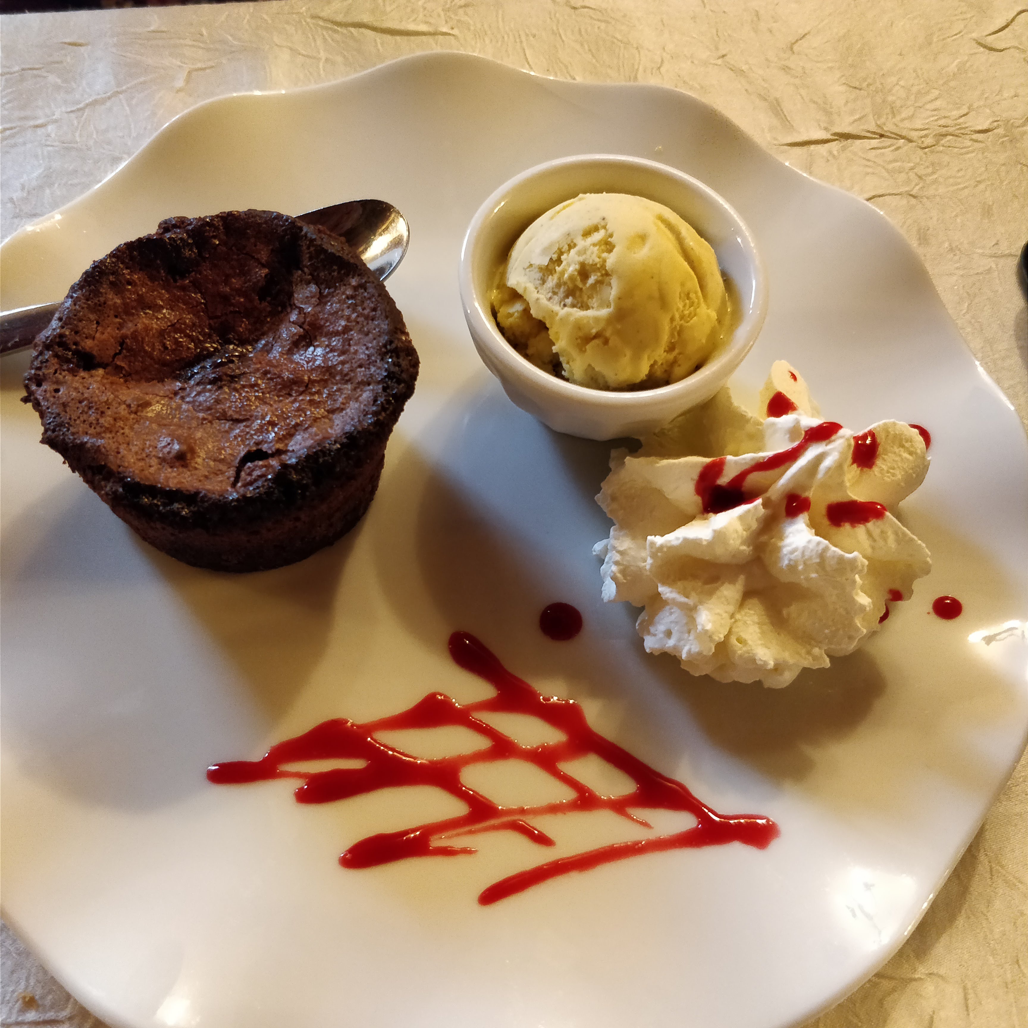 Très bonnes cuisses de grenouilles, excellent gratin dauphinois ! Moelleux au chocolat et vacherin excellents !
