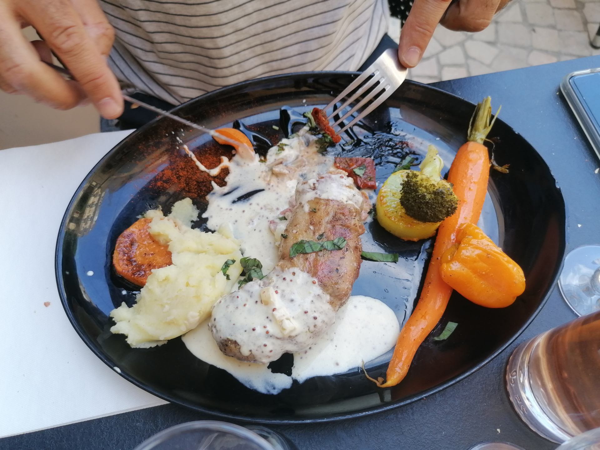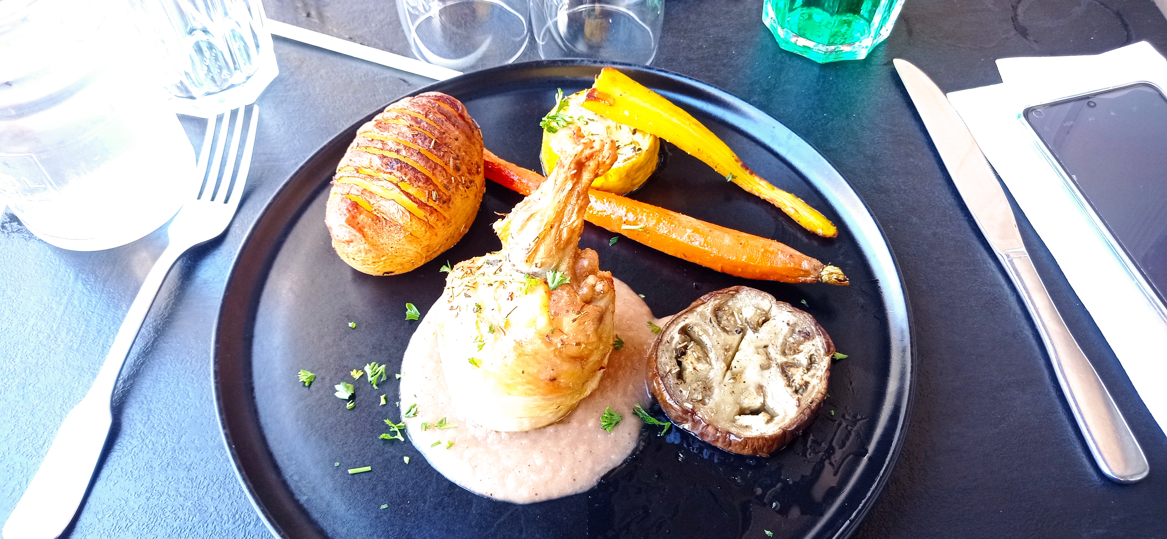 Excellente pintade accompagnée de pomme grenailles, brocolis, carottes ! En plus ils servent à 15H en terrasse ! Je recommande!