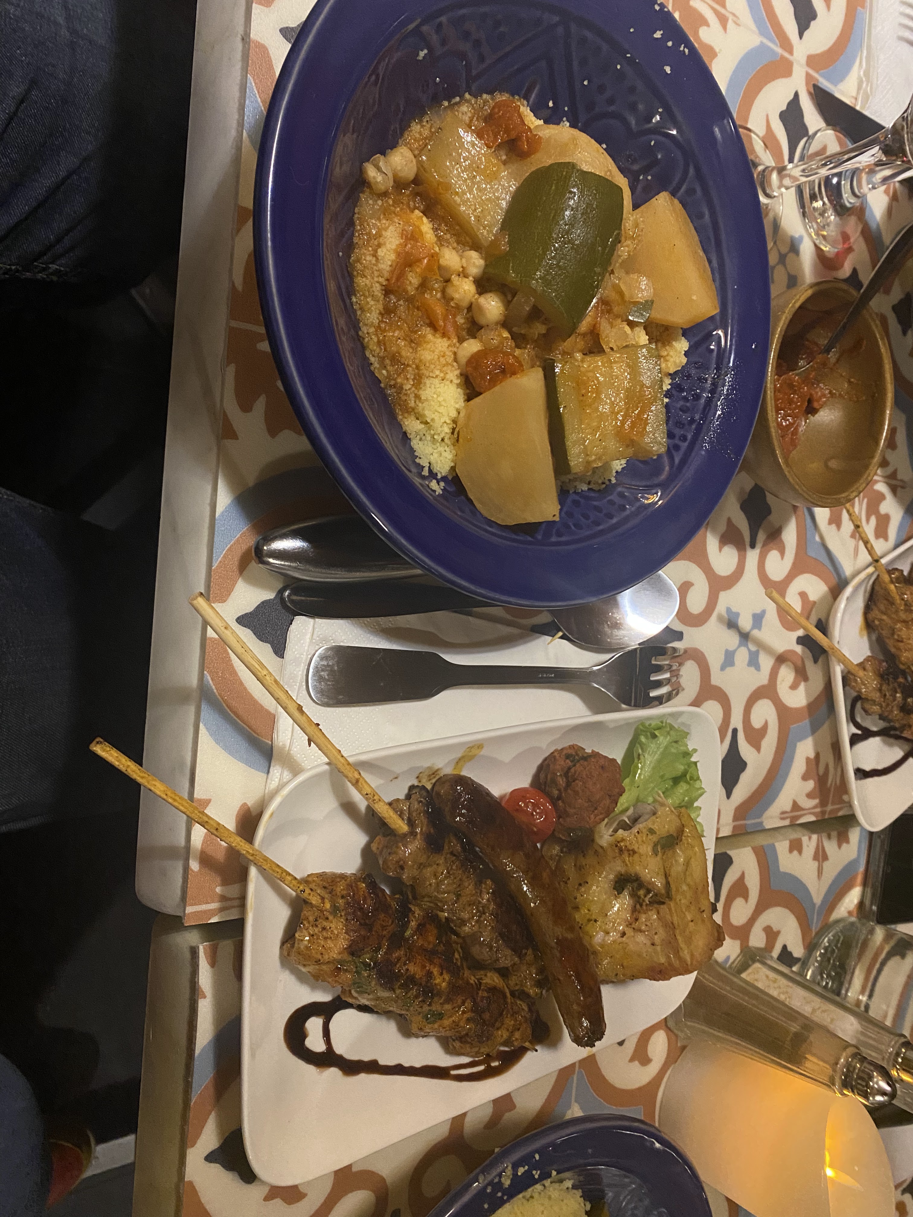 Si vous n'êtes pas un très grand ami du proprio ou un grand consommateur d'alcool venant faire fructifier le chiffre d'affaires du restaurant à éviter !!! Le résumé d'un menu réveillon à 70€ par personne ? Une table de 6 pour 8 personnes, de la semoule accompagnée de pièces d'agneau, des mini assiettes de salade à partager en guise d'entrées et un combat sans fin pour obtenir 3 morceaux de pain...