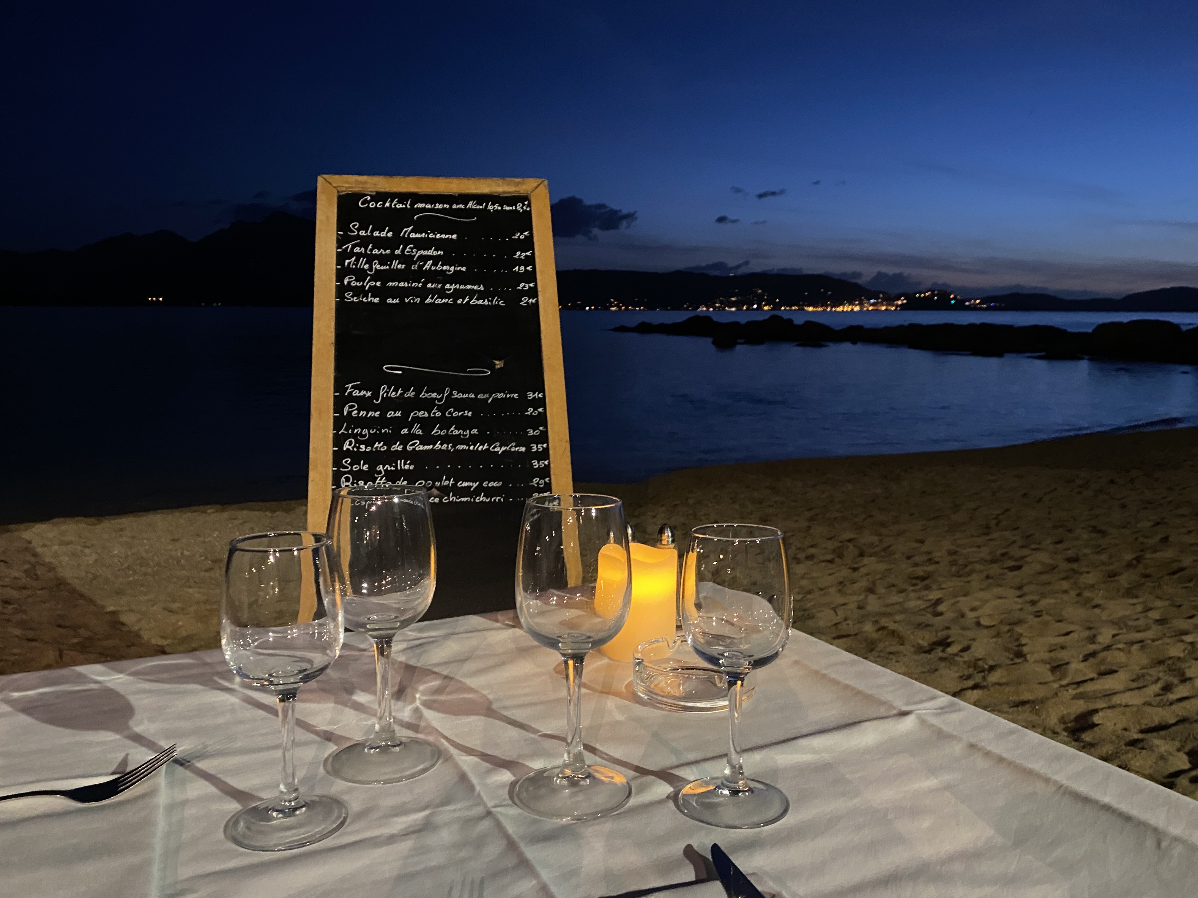 Une adresse de rêve assurément. Le repas les pieds dans le sable, un coucher de soleil sublime, rythmé par le bruit des vagues et avec un personnel très sympathique! Notre hôte Airbnb Ghislaine nous a recommandé ce spot et on a été plus que ravis. Le foie gras, les calamars grillés et les capelloni au brocciu et à la sauge (OMG!)... Tout était délicieux! Jusqu’au mojito et au vin. Notre serveur était adorable et très attentionné! Bref, adresse parfaite. Mais réservez bien en avance, les places sont chères!