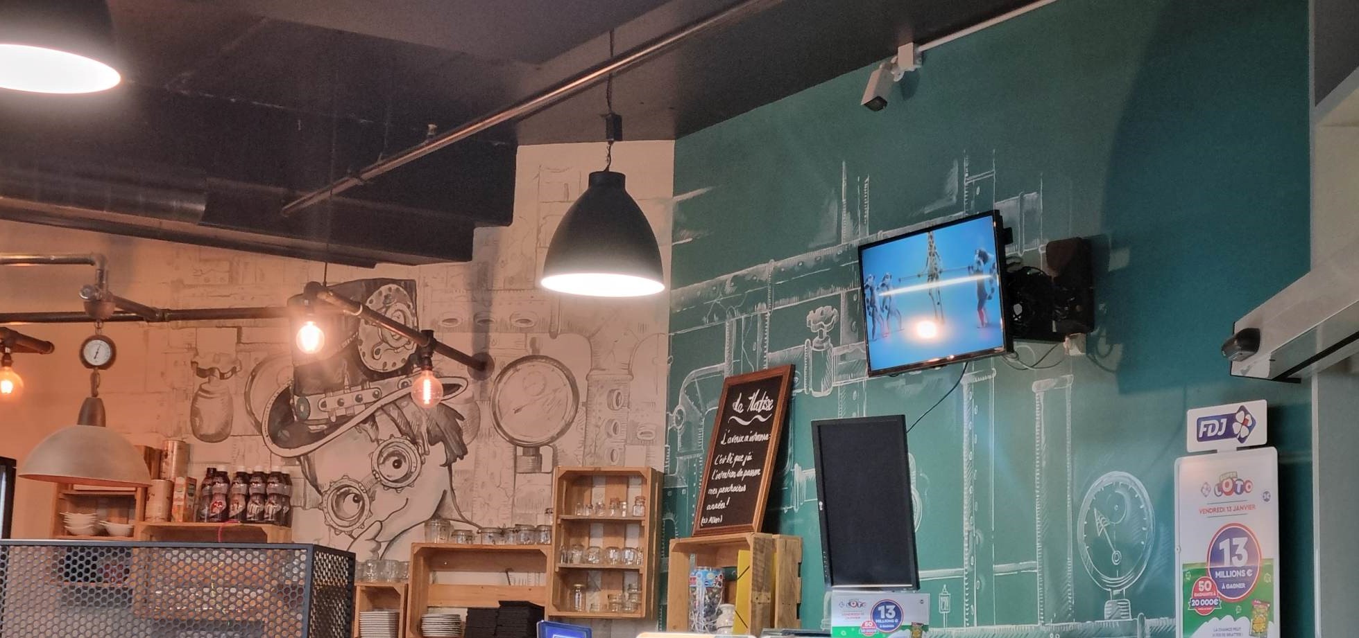 Restaurant testé à l'heure du déjeuner. L'endroit est quasi plein, mais on tente quand même en croisant les doigts pour que le service ne soit pas trop long. On sera pris en charge rapidement pour nous amener à notre table. L'ambiance est plutôt sympa dans le style steam punk. Le service finalement sera plutôt rapide, et l'attente limitée. On hésite entre salade et plats chauds. Finalement, ce sera plats chaud au vu du froid extérieur. L'apéro s'enchaîne vite suivit des plats. Ceux-ci sont copieux, et assez gouteux. Le burger Chicken est un peu sec, ce qui me fait regretter mon hésitation avec une version steak, surtout quand je vois les deux steaks à la bouchère dans l'assiette de mon voisin. Ici, c'est rapide, efficace, bon, et copieux, et prix très correct. L'accueil n'aura rien d'exceptionnel, mais il faut dire que les serveurs courent pour assurer le service. Pour poser sa voiture, pas de soucis, puisque le parking du super U est adjacent. On y reviendra pour boire une bière dans un moment plus calme, et profiter de la petite terrasse pour les beaux jours pour un vrai moment détente.
