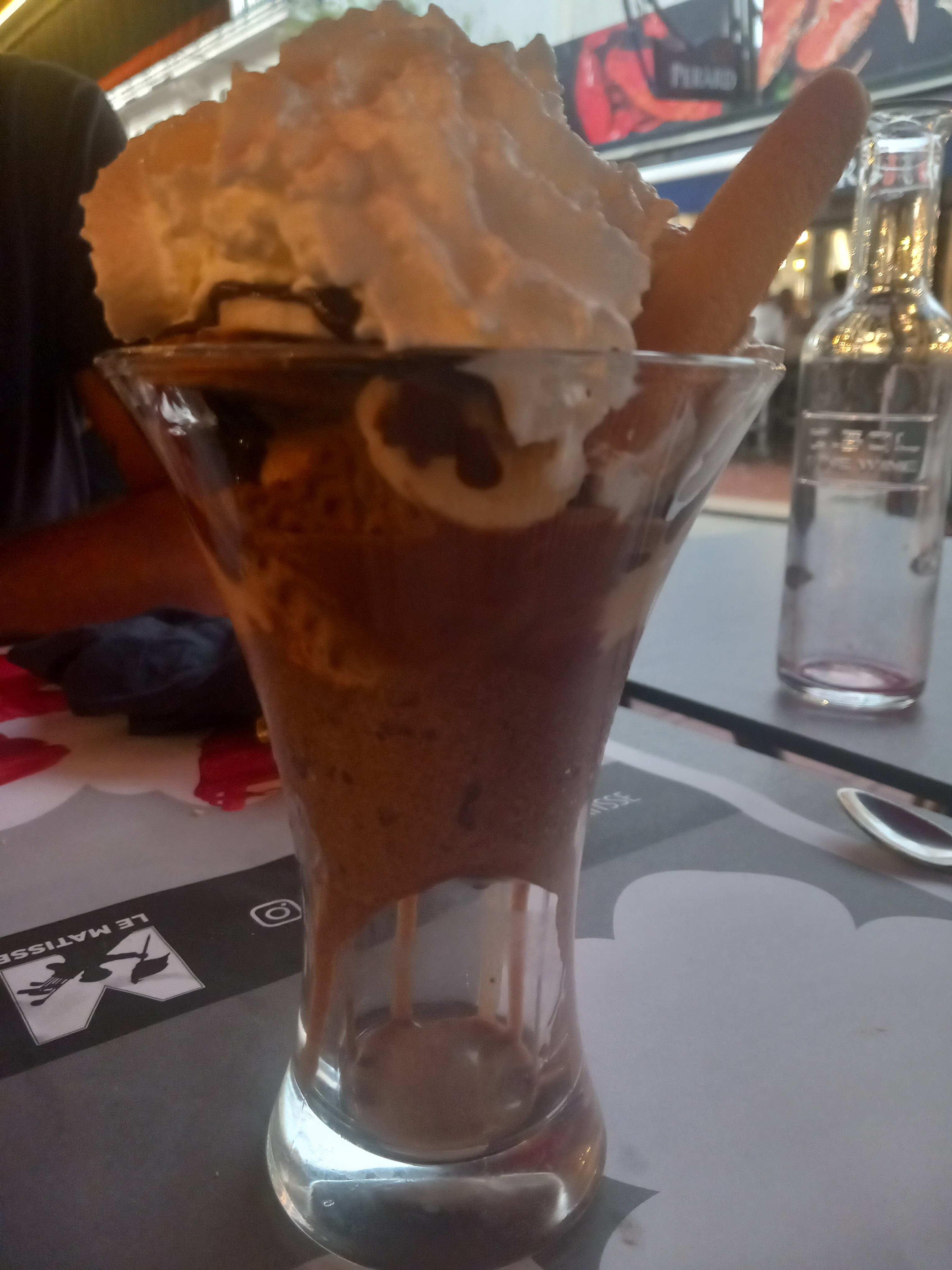 Service correct et rapide J'ai commandé des moules chorizo, j'ai eu de la crème de chorizo qui était fade et qui baigner dans le jus des moules, ma femme a commander une salade césar au cœur du repas elle demande un rab de sauce césar qui n'est jamais arrivé, en dessert crêpe au Nutella pour madame à 6e et 1,50e pour 3 point de chantilly en plus.... Pour ma part le café gourmand était correct 4 petites mignardises, briochette à la pomme, mousse au chocolat, crème brûlée et glace pistache