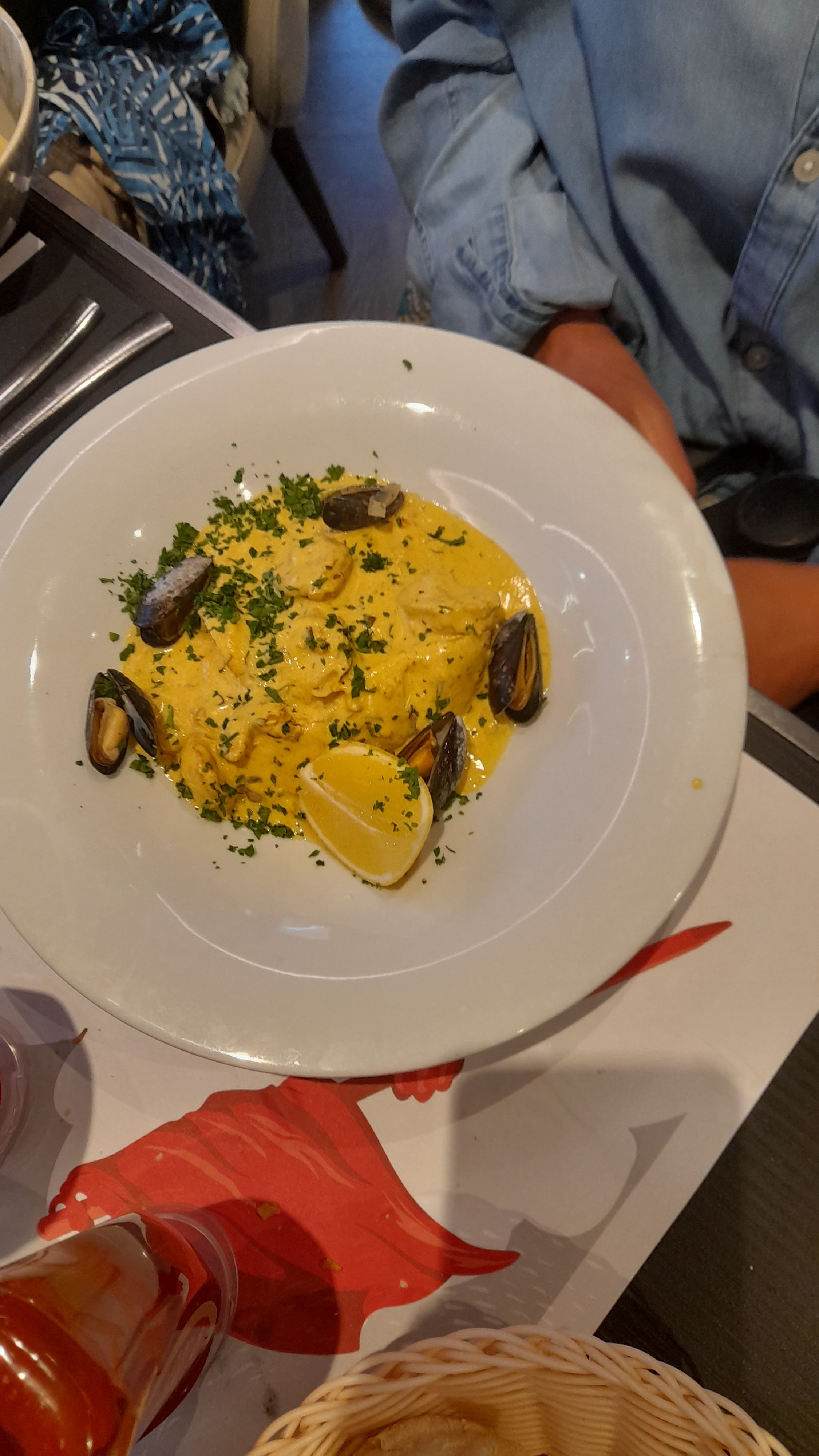 Bon accueil. Nous y sommes allés pour le déjeuner et on a mangé à l'extérieur où la terrasse était remplie et on avait l'impression que les serveurs étaient un peu débordés. Nous avons été déçu par les moules à la crème qui étaient trop petites et une sauce trop légère, pas trop de goût.