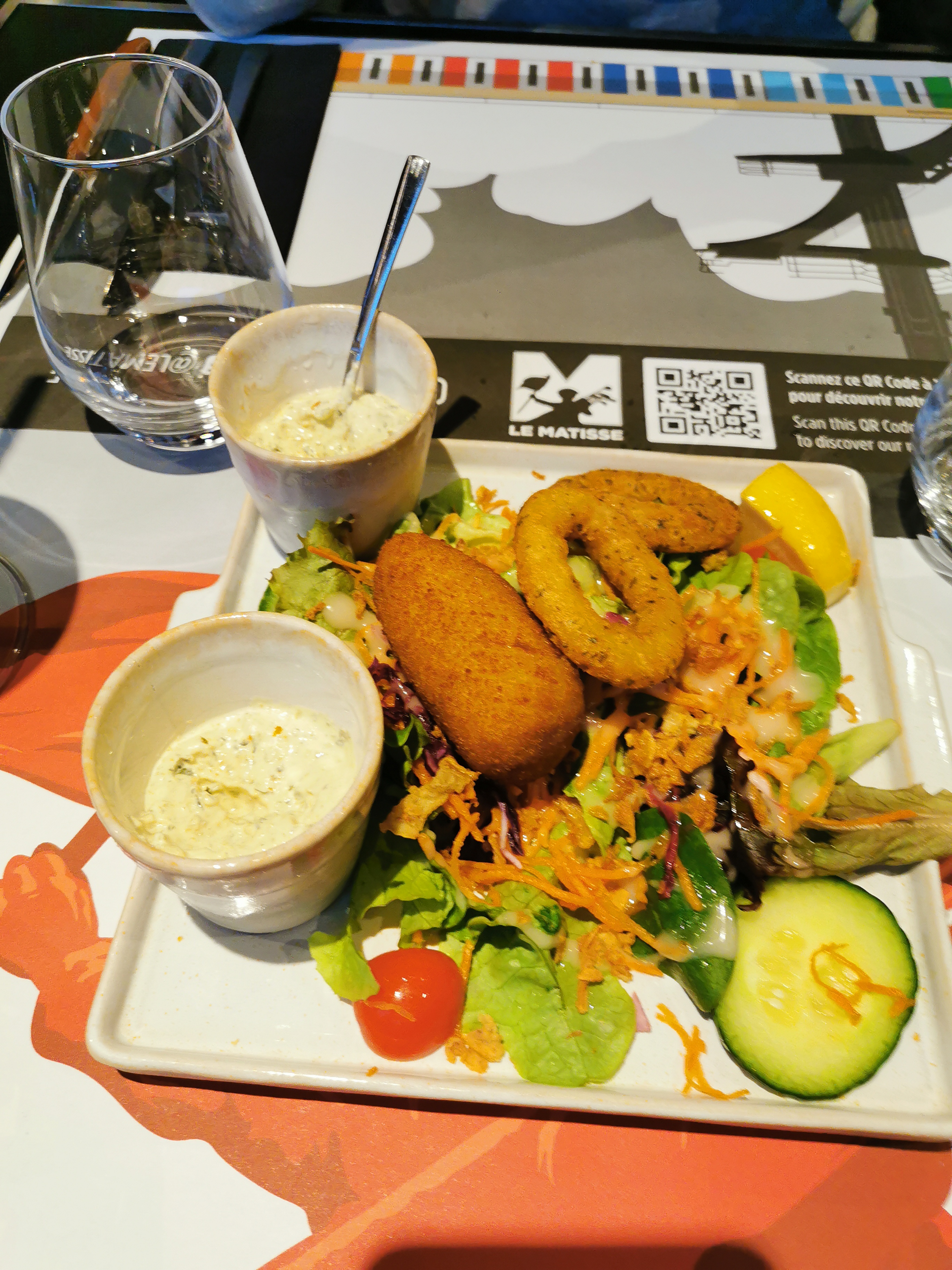 Un bon moment en terrasse avec un beau soleil ce qui permet de « sauver le repas » ceci dit ça reste une brasserie…. Huîtres sur fond de gros sel une première pour moi je connaissais avec de la glace, assiette ébréchée et vinaigre échalotes sans petite cuillère…. Des détails mais qui pour moi ont une grande importance quand je suis dans un restaurant …. Suggestion de la semaine saint Jacques purée potiron Rapport qualité prix élevé et le plus des travaux à la perceuse juste en face. Mais là le matisse n’est pas responsable mais ça gâche un peu le repas.