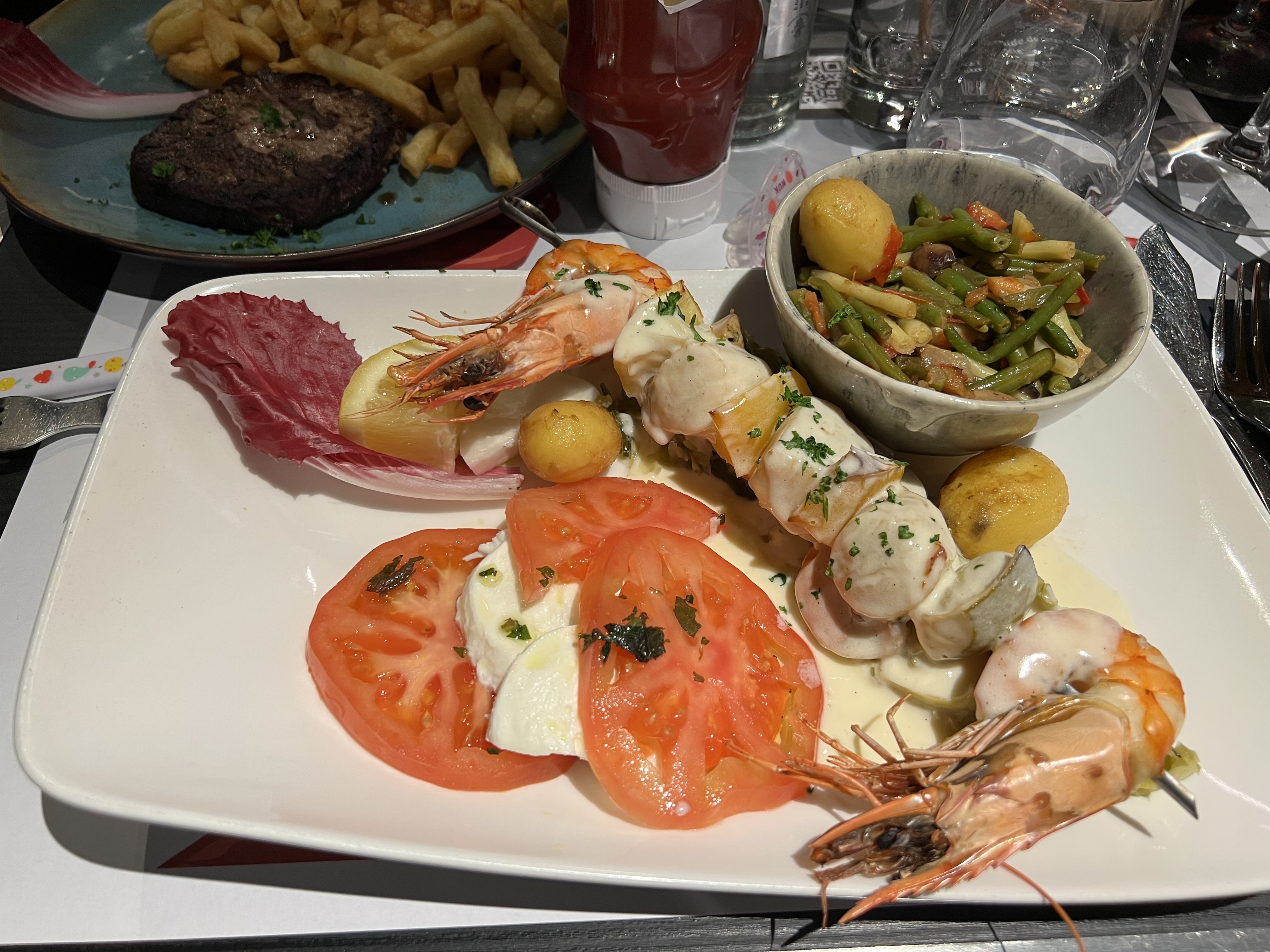 Les crevettes étaient cuites au micro-ondes, probablement depuis quelques jours, les moules n'étaient pas fraîches, petites et contenaient encore des algues. Le saumon était trop cuit, probablement pour que la palette de «l'ancienne génération» soit juste. La morue n'était certainement pas fraîche. J'ai grandi au bord de la mer, donc je sais à quoi ressemble réellement le goût du frais au rance. Vous pouvez obtenir des fruits de mer « plus frais » dans les supermarchés surgelés. Le confi de canard était sec, mais les sauces pour les plats étaient bonnes et préparées avec effort. Le service était typiquement français, mais très sympathique et accueillant. Ils l'ont sauvé d'être 1*. Je pense que les critiques 5* ont été teintées de rose par la journée amusante à la plage. Piège à touristes, c'est sûr.