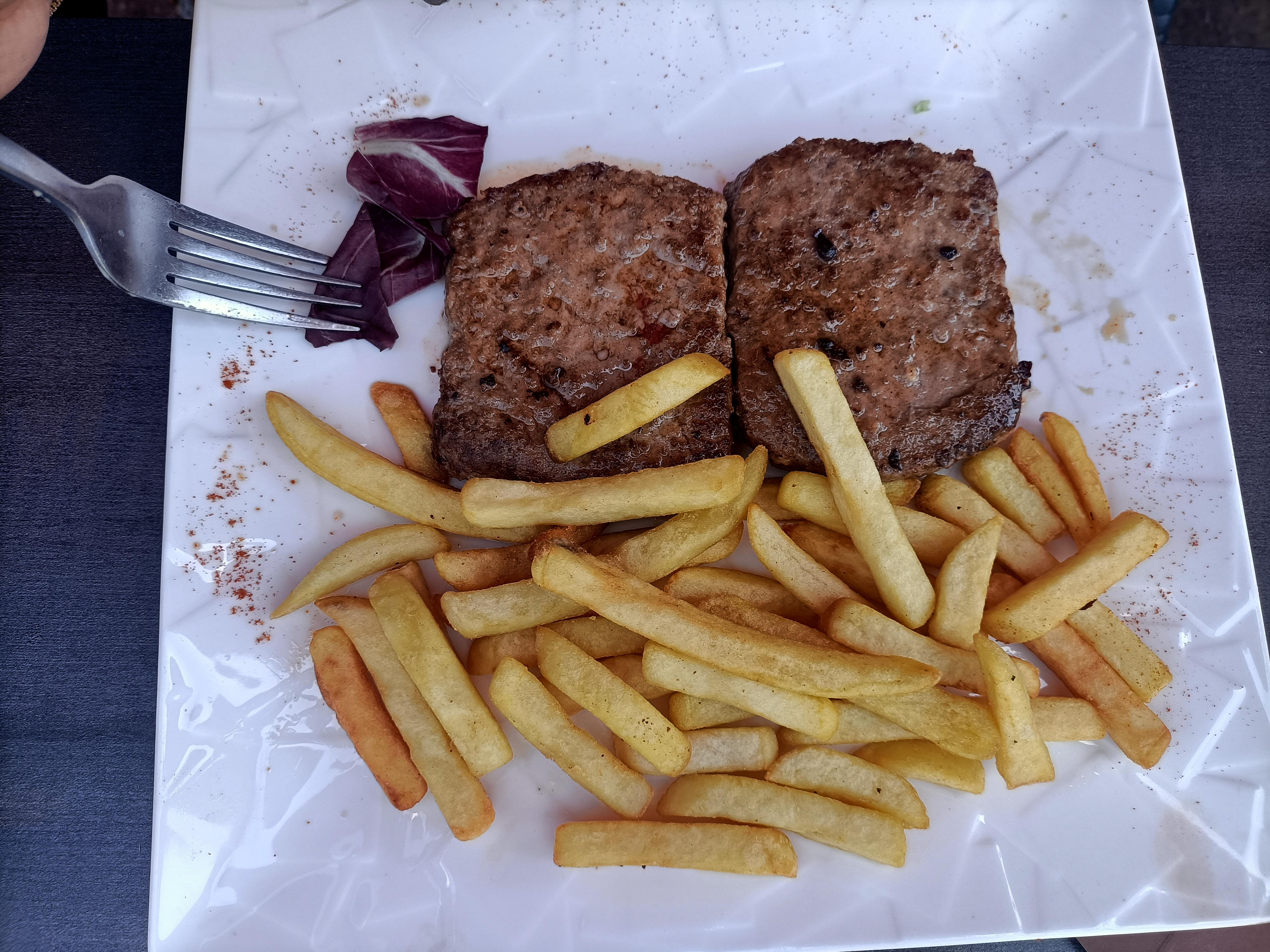Aïe aïe aïe. Si Etchebest vient manger là, ils vont prendre cher…😂😂 pas de « pizzaiolo » mais pas dit à notre installation. De ce fait, on se retrouve avec des hamburgers scandaleux: pains industriels, même pas réchauffés, une tranche de salade avec fromage fondu et ce pauvre steak…13,50€!!!!!!!! Facture totale pour une boisson (4€ le coca), l’hamburger, un supplément frites (4€), et deux cafés :78 balles…😱😱🤬🤬🤬 le plongeur fait sa vaisselle tranquille avec une assiette de frites à côté qu’il se mange tranquillou bilou. Et le serveur va aider en cuisine tellement ils sont à la ramasse. Vous aurez compris que je ne conseille pas.