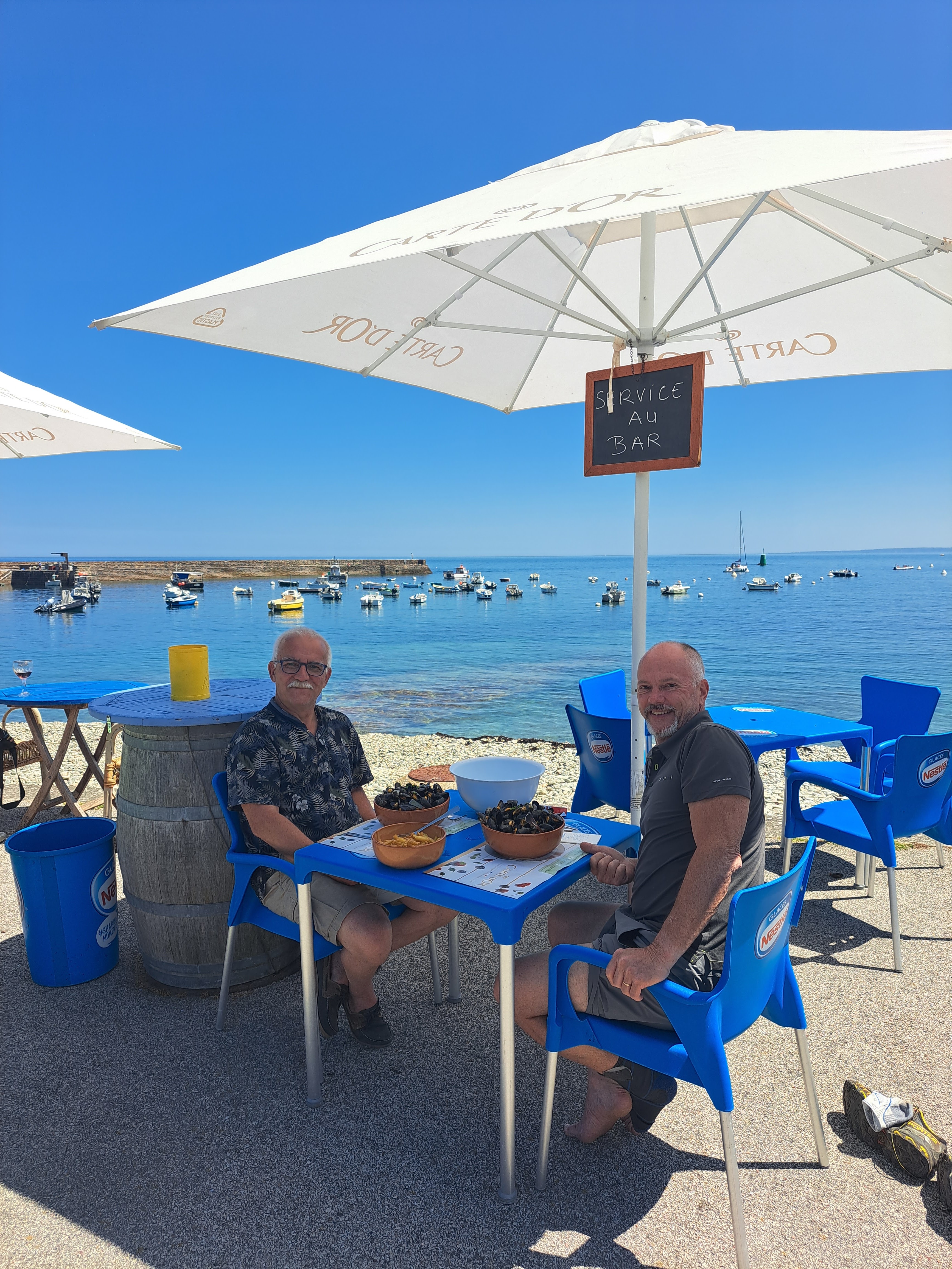 Nous avons pu manger sur le port et profiter du soleil. Allez y. Nous avons pris un moule frite. Rien à dire.c'était très bon. On y retournera et ce n'est pas la première fois non plus. Attention à l'humeur du patron...cela fait son charme. On y est habitué. Une bémol sur le service en terrasse la journée, il faut aller au bar pour se servir. C'est dommage.