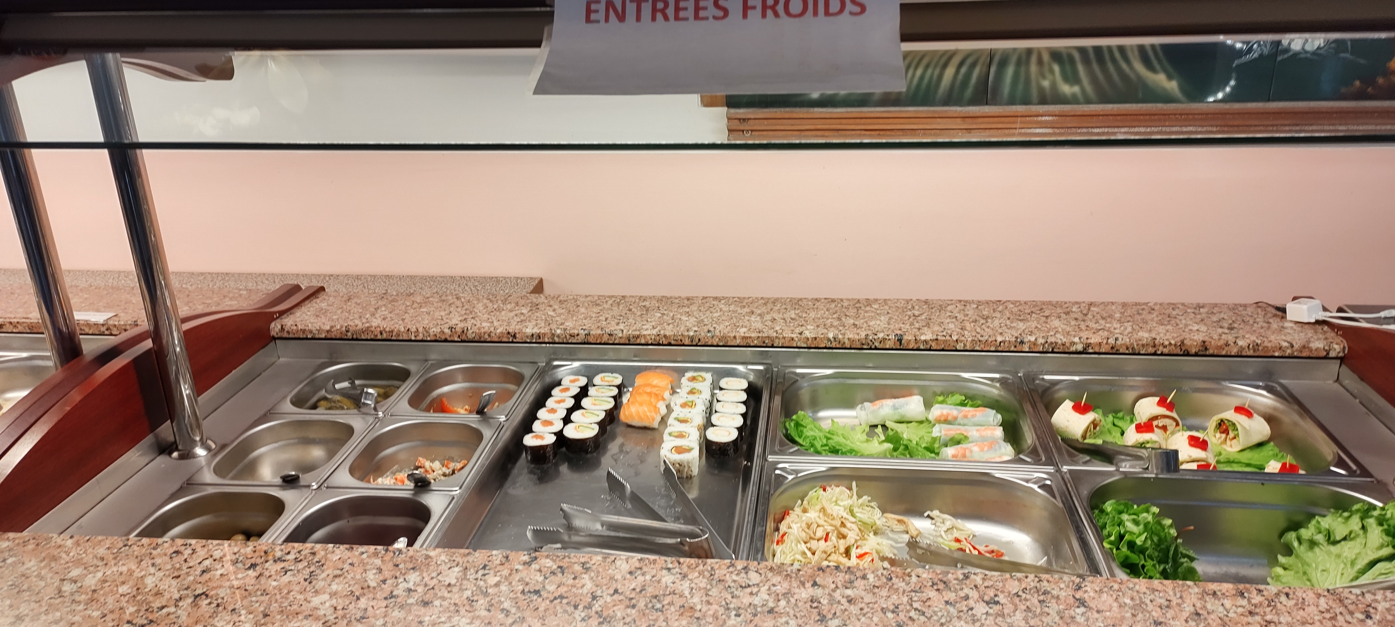 Buffet bien présenté et suffisant.choix correct,fraicheur nems frits au fur et à mesure,tres goutus...wok et grill rapides avec sourire en prime,que du bonheur.merci au personnel et à la direction.