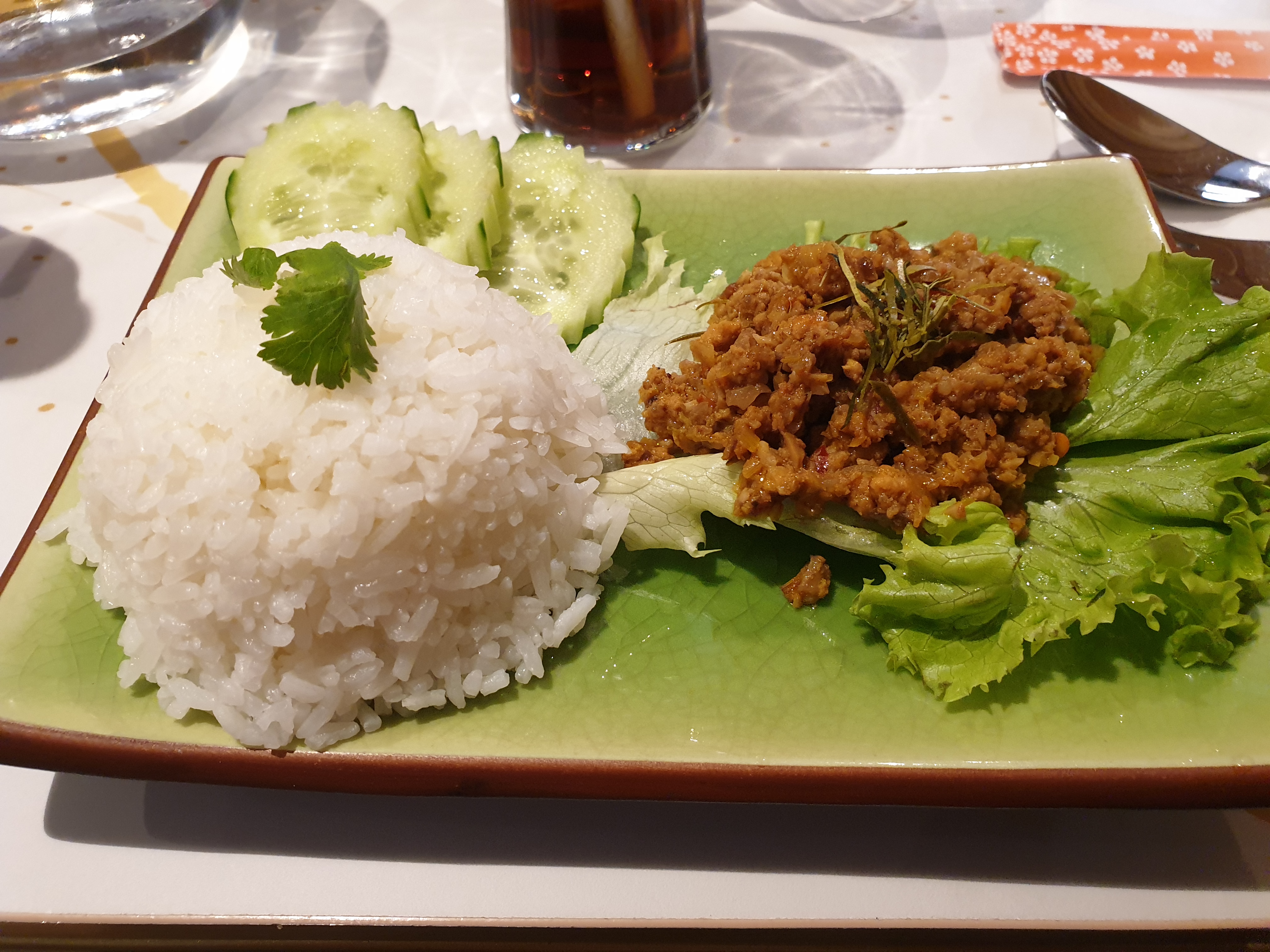 Un accueil très sympathique et souriant, une salle magnifiquement agencée. Côté assiette, des couleurs et des parfums, une petite réserve concernant le porc haché (en entrée ou en plat) très goûtu dans les deux cas mais qui ne permet pas de s'assurer de la qualité du produit utilisé. Un dessert Cambodgien très bourratif (au total trois fois du riz) mais je reviendrai très certainement, en faisant des choix quelque peu différents.