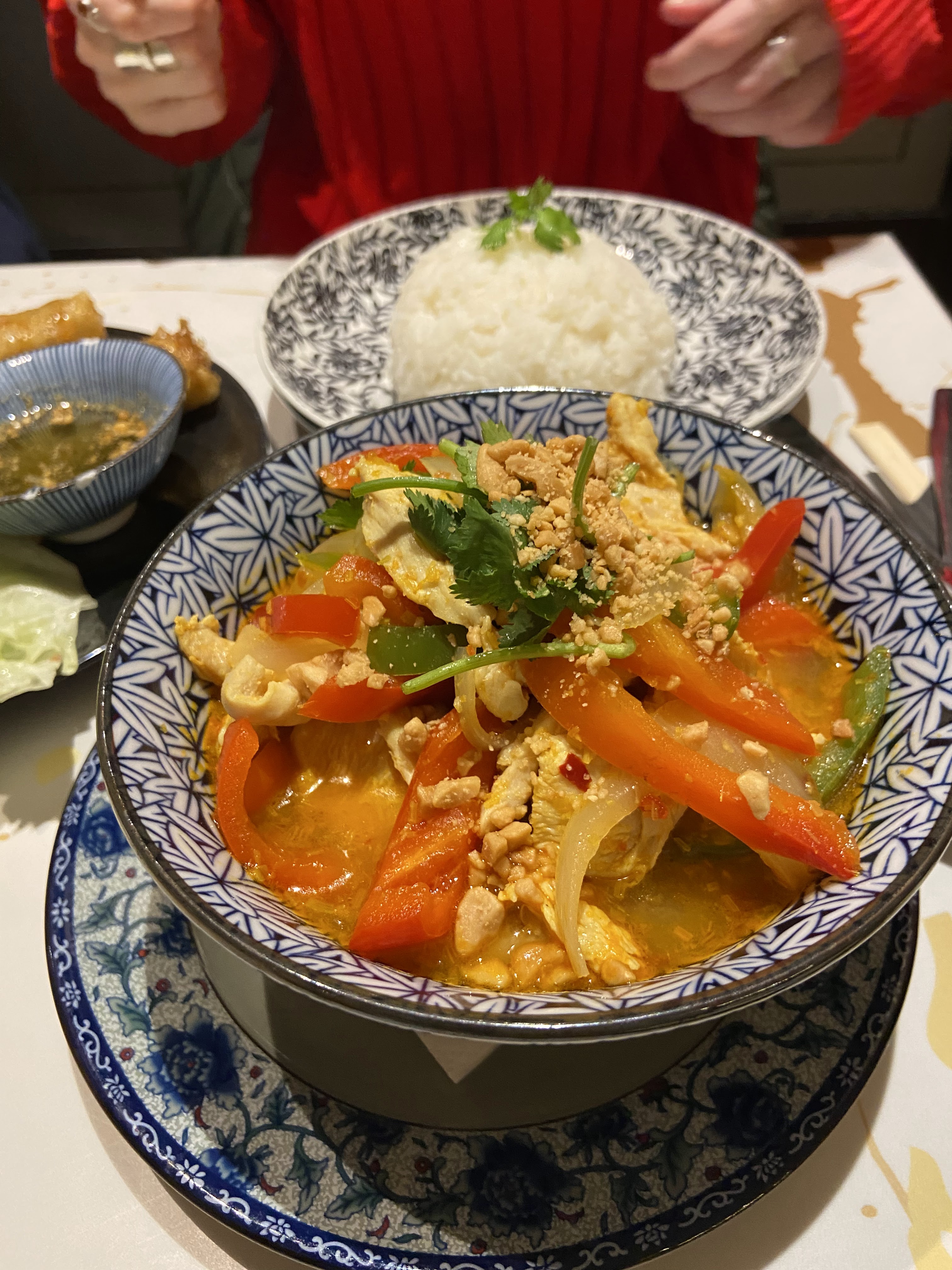 Curry de poulet très savoureux. Les rouleaux de printemps étaient super aussi