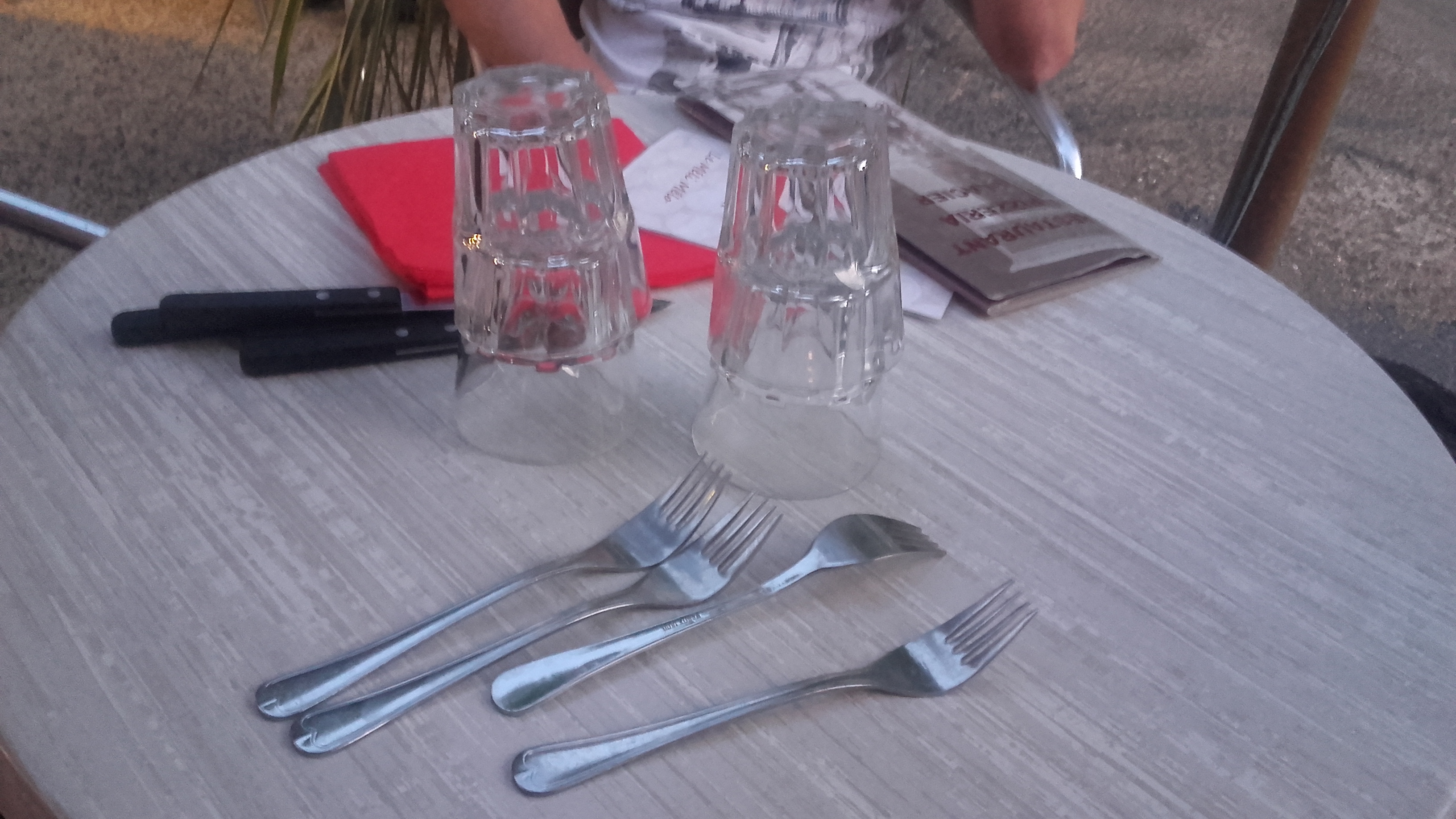 La photo parle d'elle même :voici comment le serveur met la table aux clients. Il pose tout devant et débrouillez vous. Nous avons eu une carte pour 4 à faire passer. Et une fois le choix fait il vous dit qu' il y a beaucoup d'attente pour les pizzas. On en avait pris 4. C'est la 1 ère fois que l'on est parti d'un restaurant sans manger.
