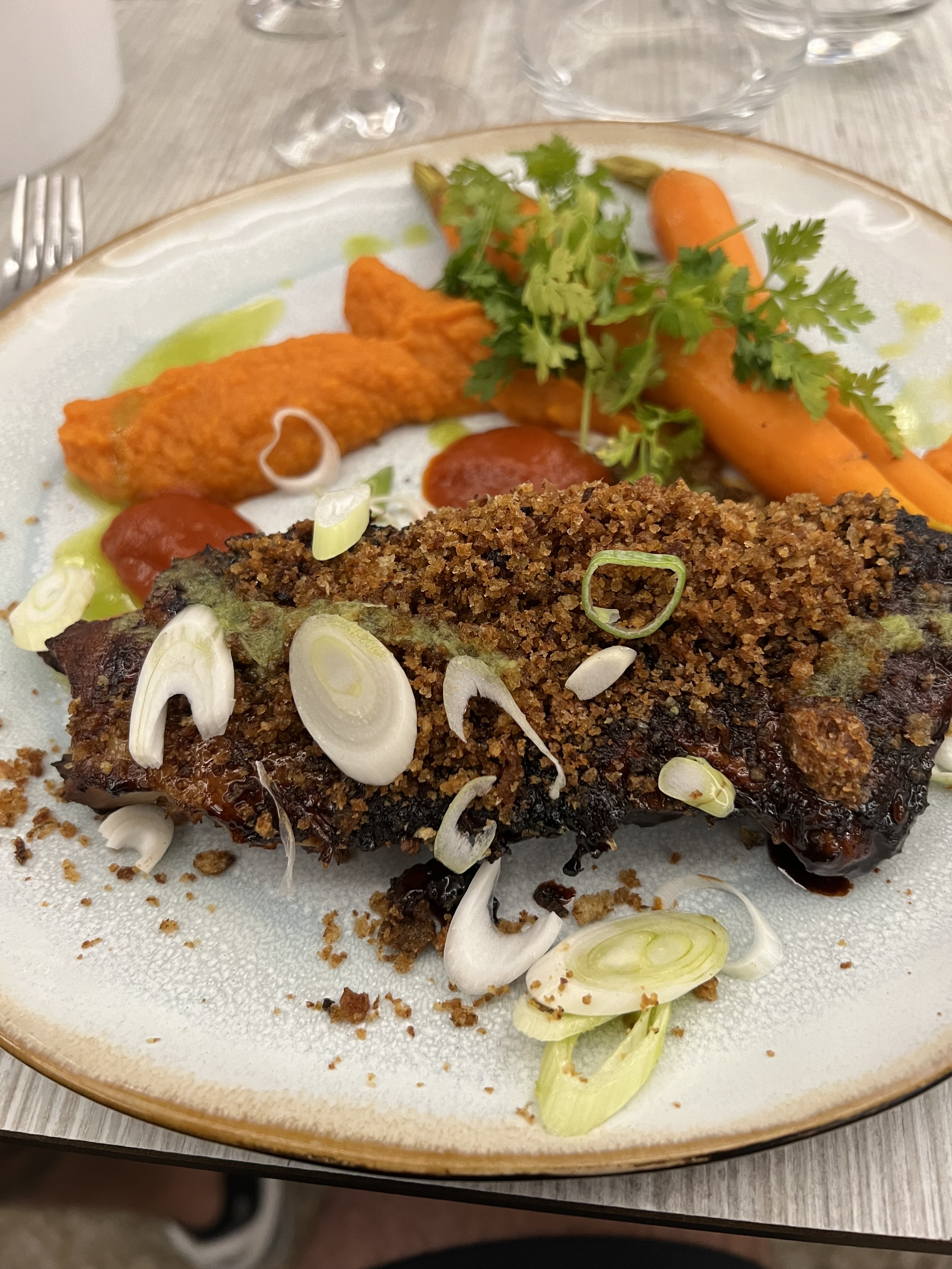 Déjeuner ce midi avec un client. Superbe côté de veau juteuse accompagné d'une purée de panais et d'une compotée d'oignons. Viande de qualité avec une cuisson parfaite. Petit bémol : serveur le vin au verre avec la bouteille devant le client en lui présentant le vin.