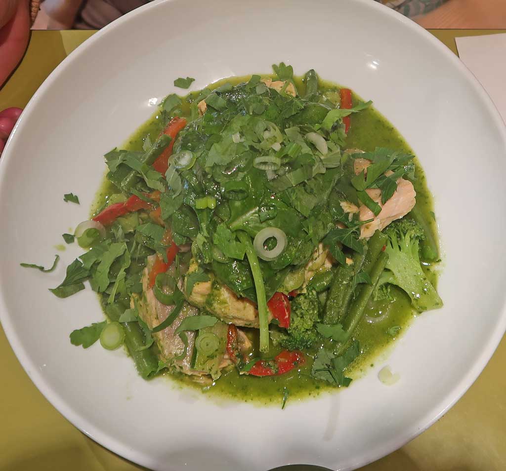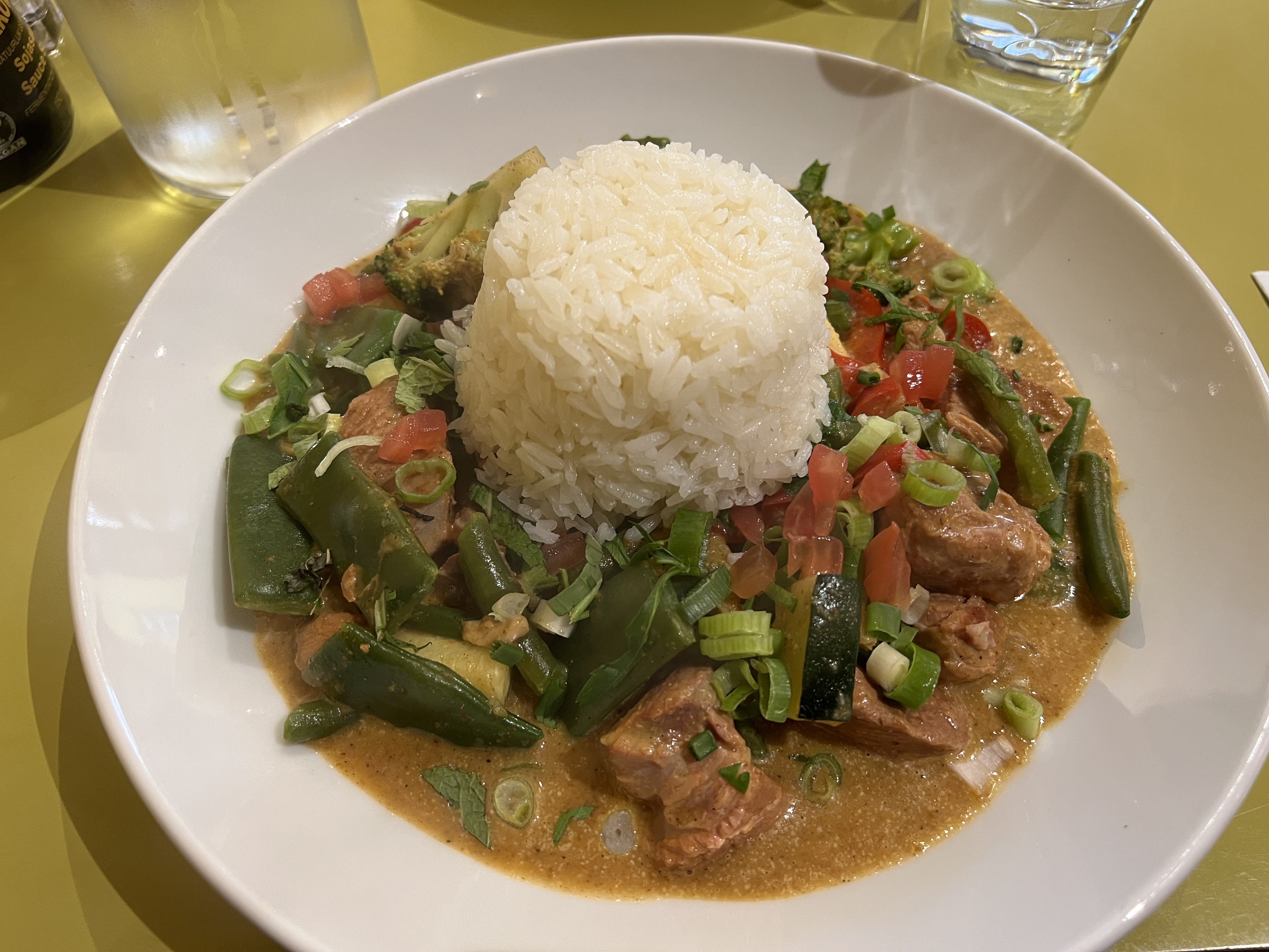 Lieu très agréable avec une des plats délicieux et généreux. Nous avons beaucoup aimé notre repas dans ce restaurant. Au menu : saumon au curry vert, légumes divers (haricots verts et fèves croquants) accompagné de riz thaï ; poulet satay cacahuète avec riz thaï et souris d'agneau et ses pommes de terre. Tout était excellent ! Je recommande :)
