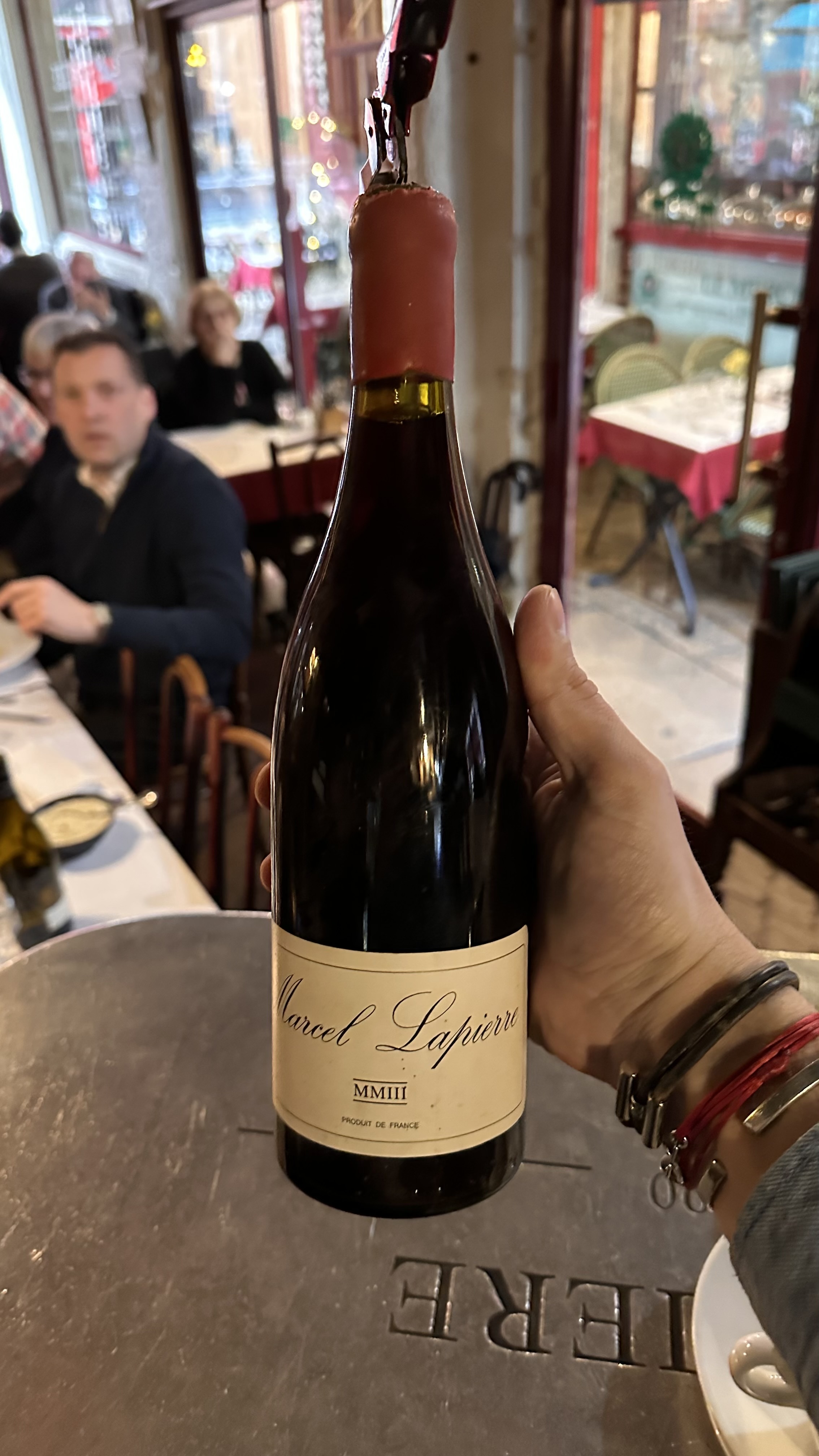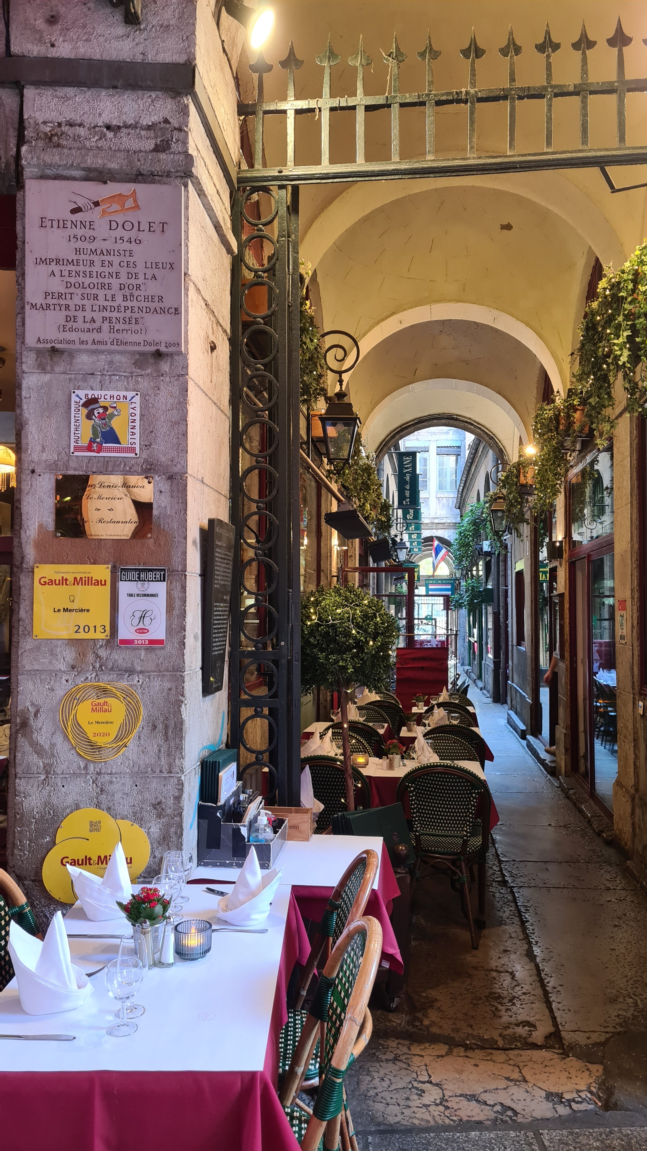 Nous avons eu de la chance d avoir une table dans la traboule en ce dimanche veille de lundi férié. La nourriture était excellente. En face, un bar faisant une soirée privée qui nous a gâché un peu notre soirée ( bruits assourdissants). Un des serveurs a chaque passage bourrait mon mari dans le dos. Le même serveur se permettait de finir l assiette des clients en cuisine. Pas très pro