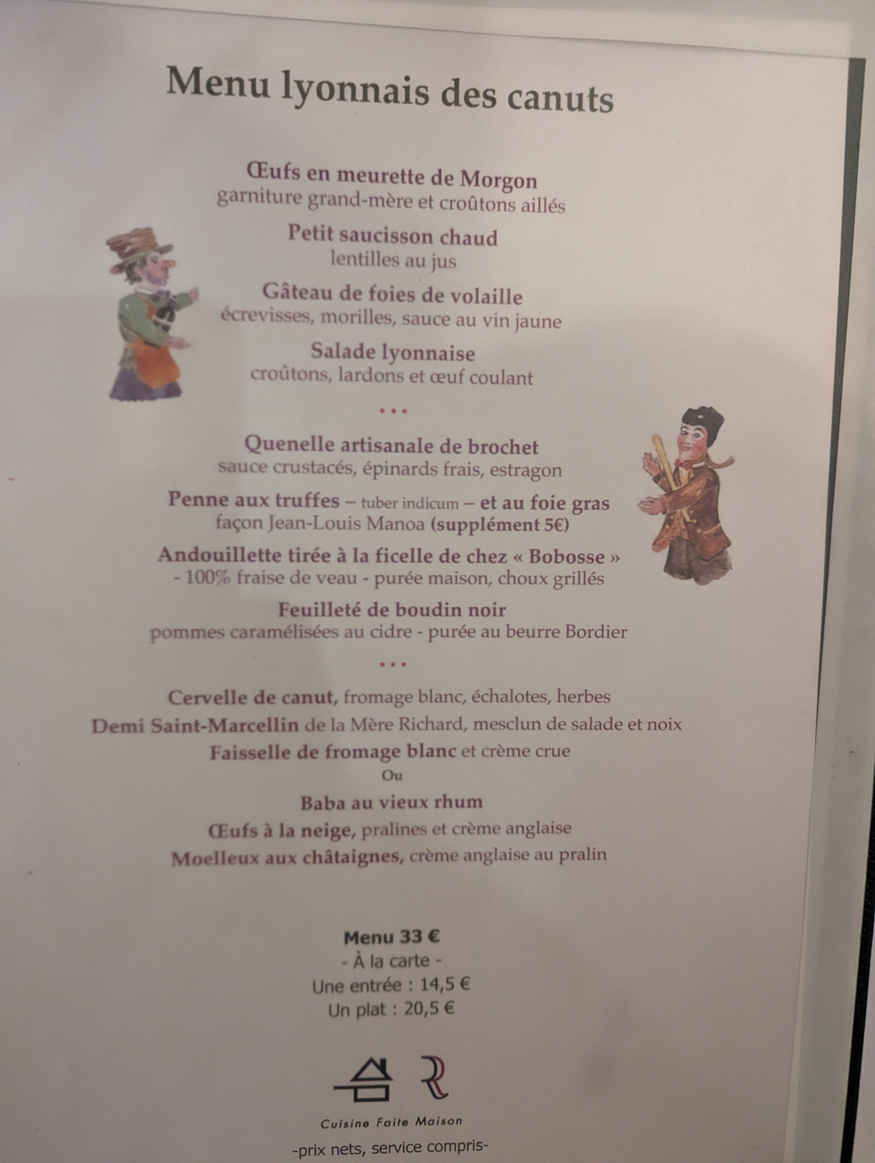 Excellente soirée dans ce véritable bouchon lyonnais. Les plats sont copieux et très bons. Le personnel est très gentil. Nous recommandons sans réserve !