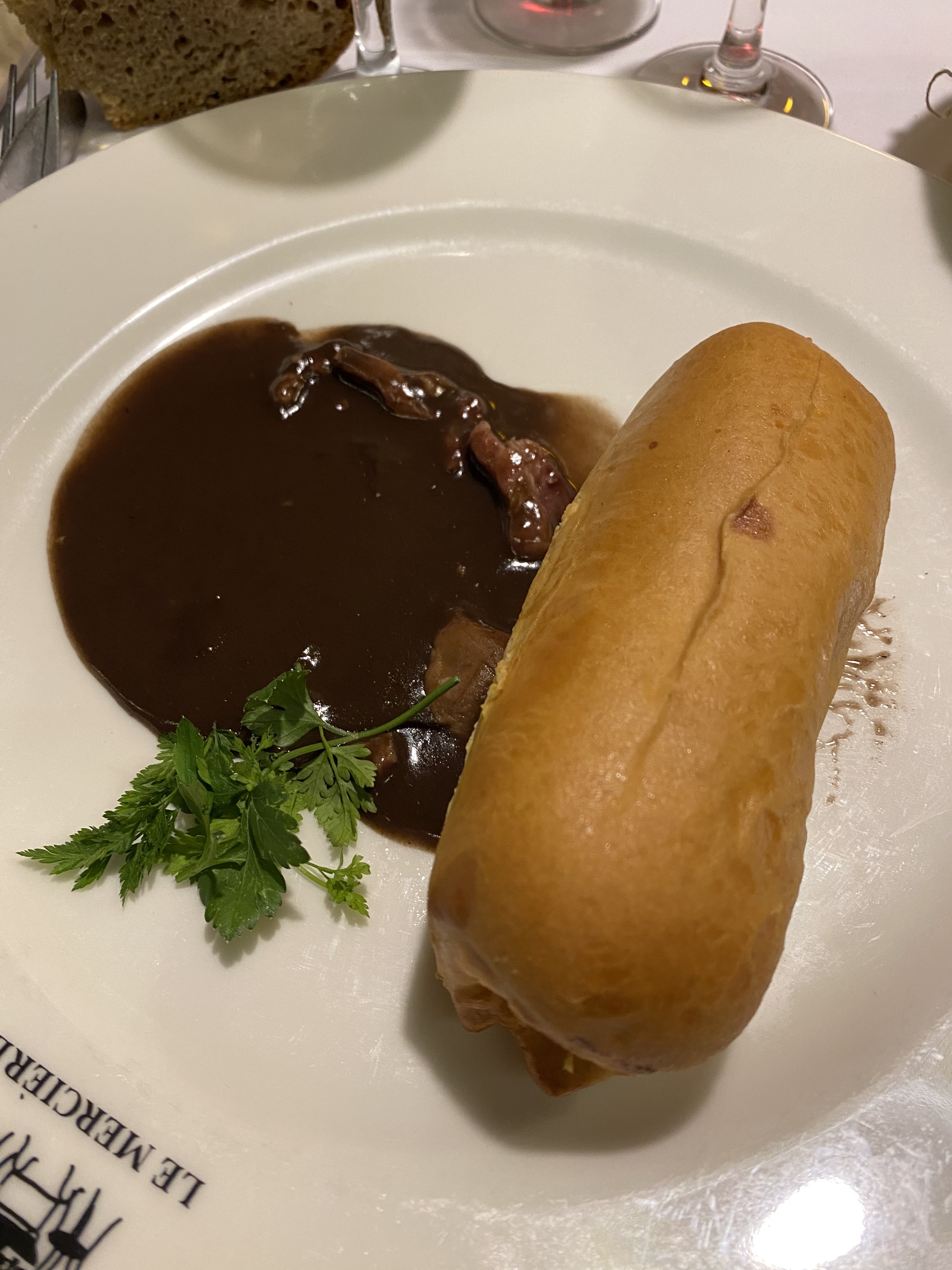 Service satisfaisant mais pas de carafe d’eau à table. Le tablier de sapeur très moyen et trop épais, la cervelle de canut beaucoup trop vinaigrée. L’onglet a quant à lui une cuisson parfaite et le gratin accompagnant le tablier était également très bon