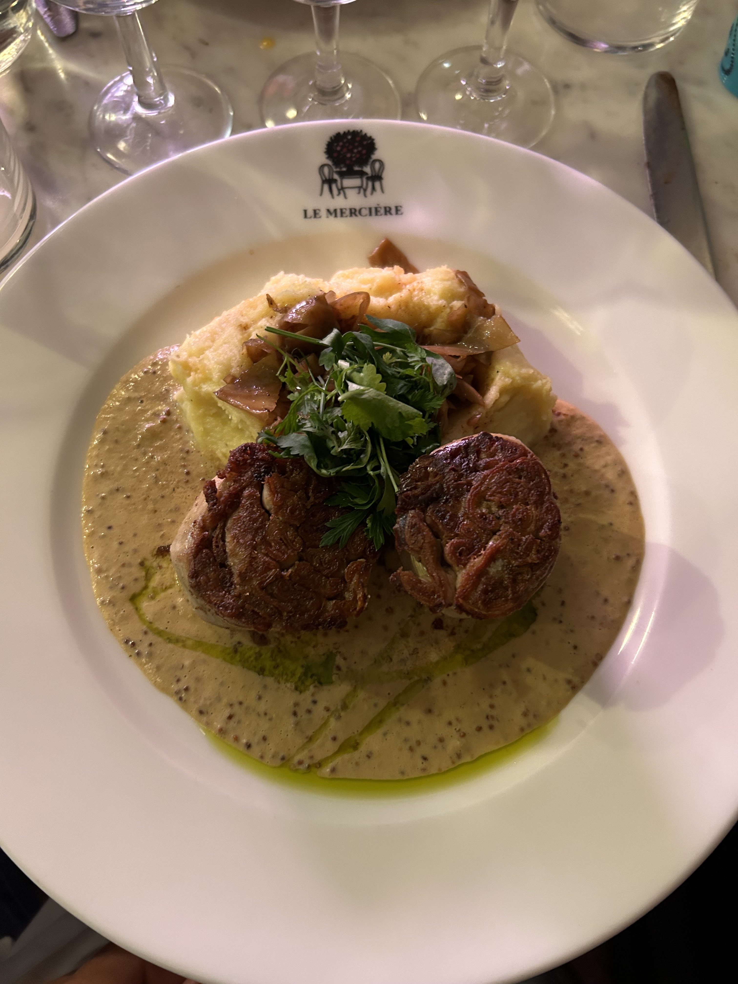 Meilleur bouchon Lyonnais 🤌🏼 Très bon accueil. Nous avons été chouchouté par la barmaid et notre serveur. Vous le comprendrez, service excellent tout comme chacun de nos plats jusqu’au dessert. Aucune fausse note. Merci Le Mercière, à bientôt! Adresse à recommander les yeux fermés. Ci-contre en image : Poulpe snacké, risotto à l’encre de seiche, poivrons et petits pois + Œufs à la neige, pralines et crème anglaise.