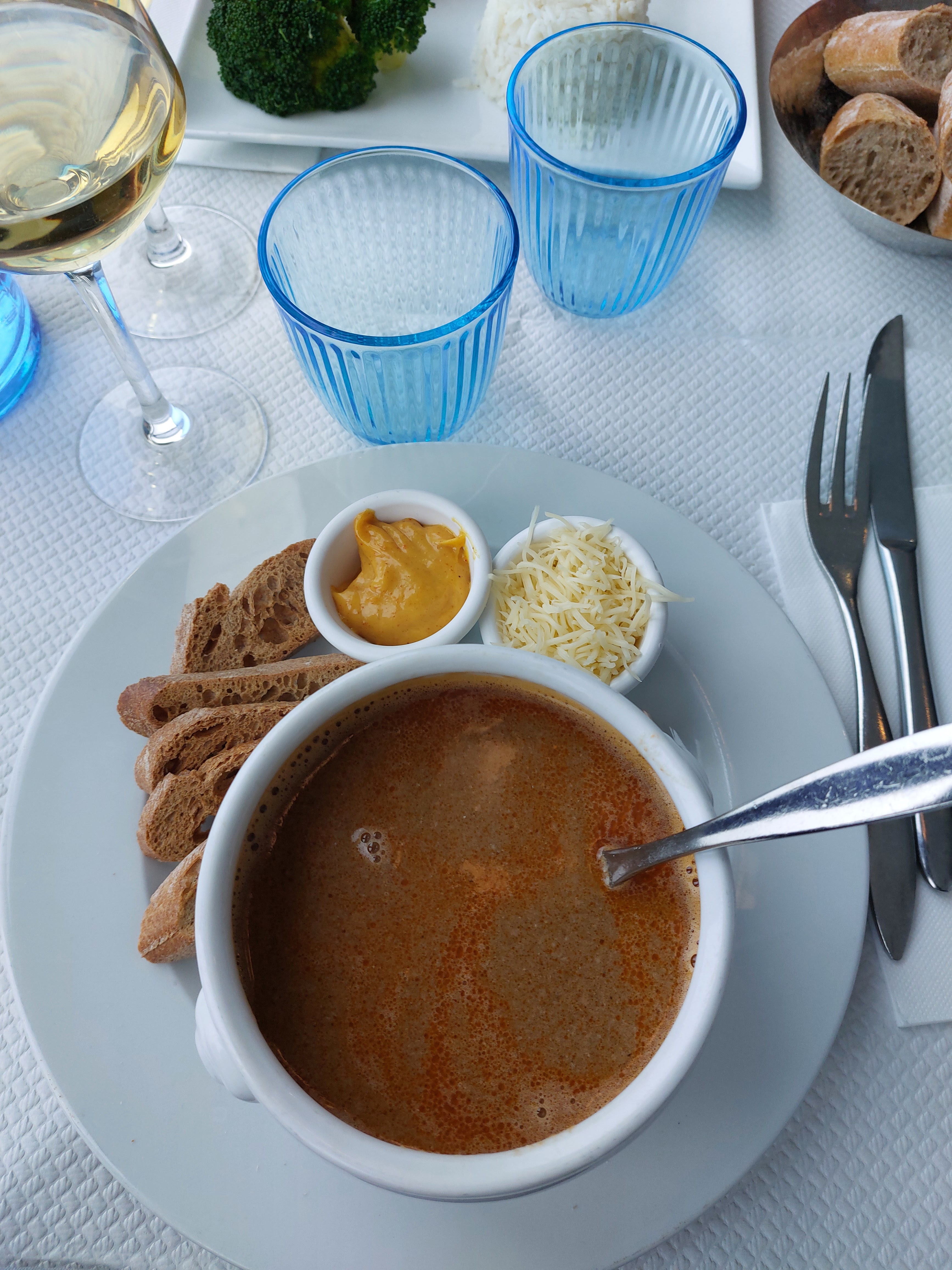 La soupe de poisson au top Les moules super sauf les frites, dommage que ce soit pas des frites maison. En dessert, nous avons pris une glace chocolat liégeois et malheureusement la coupe était remplie à moitié ! C'est dommage pour le prix !