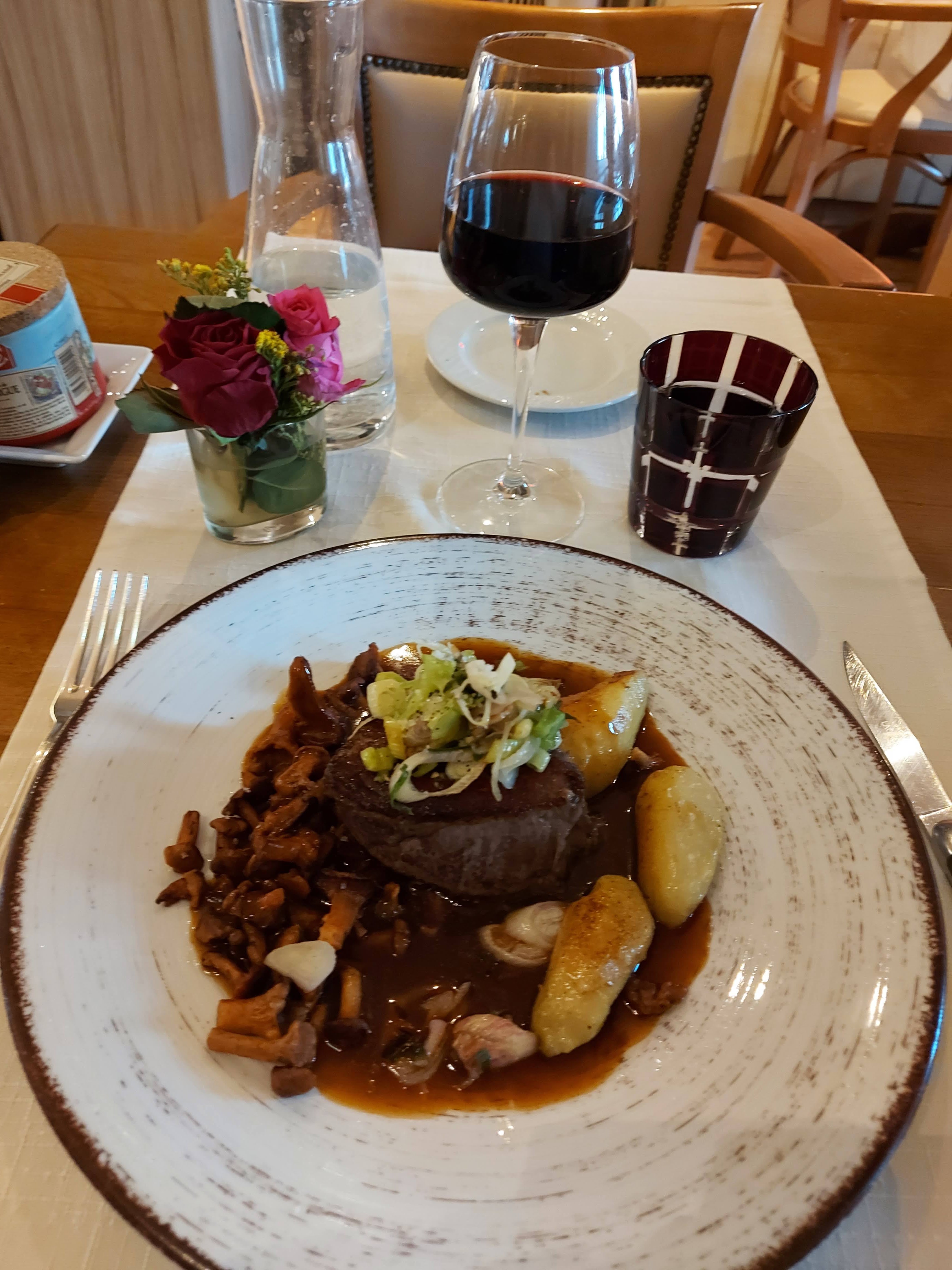Décevant. Très bonne soupe aux champignons avec du pain sec. Pâté de foie de canard. Bonne viande, parfaitement cuite. Baies en conserve pour le dessert. J'ai commandé une bouteille de vin rouge et elle a été servie froide au réfrigérateur