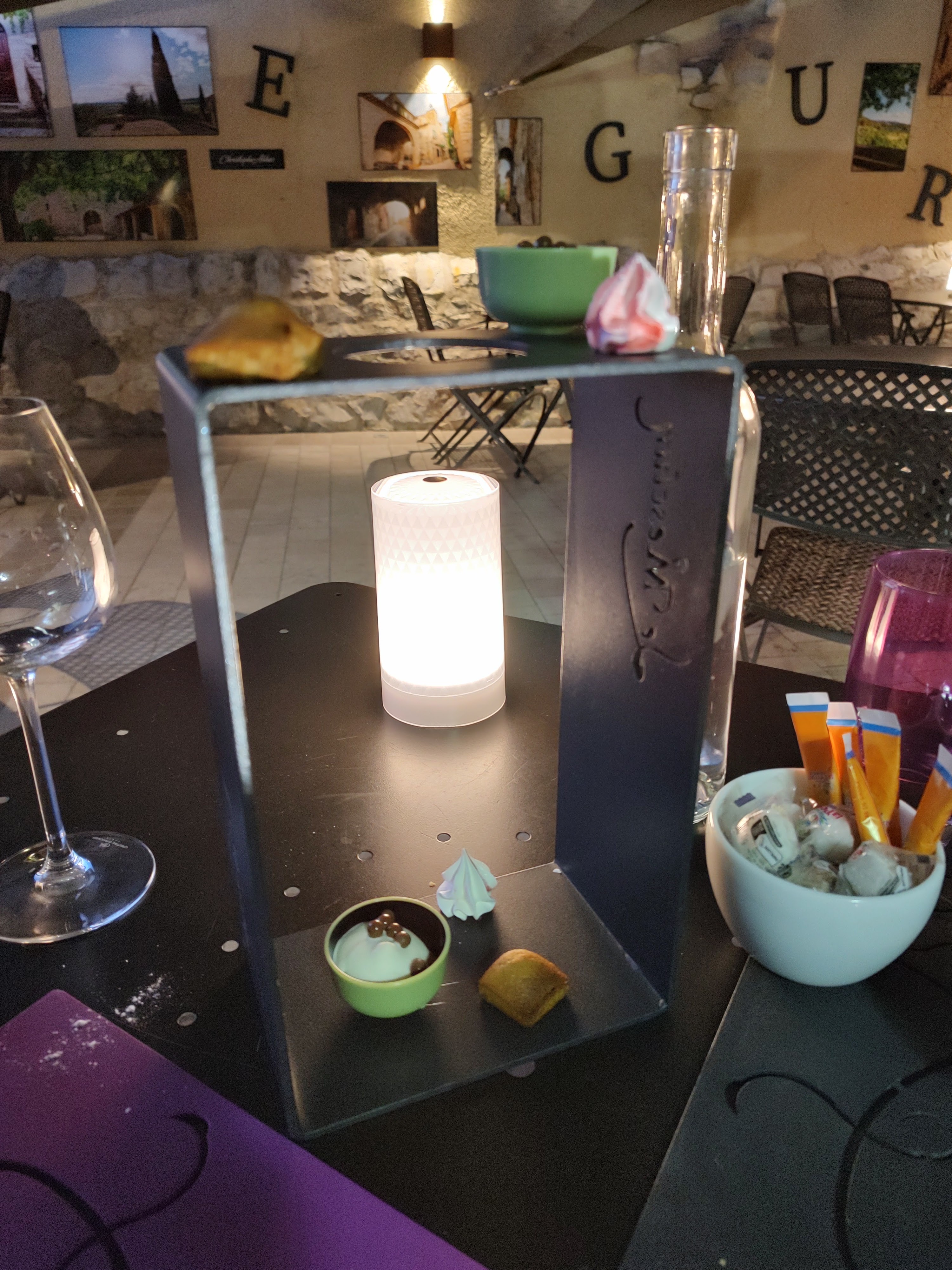 Plats très bien présentés, très beau cadre, mais au final on reste sur sa faim, car les quantités sont très légères, surtout pour les desserts. Enfin, les petites douceurs pour accompagner le café sont incongrues (chamallow, chantilly et un autre que j'ai oublié) au pays du nougat, des amandes, des fruits,... Bref, pas mal mais pas inoubliable.