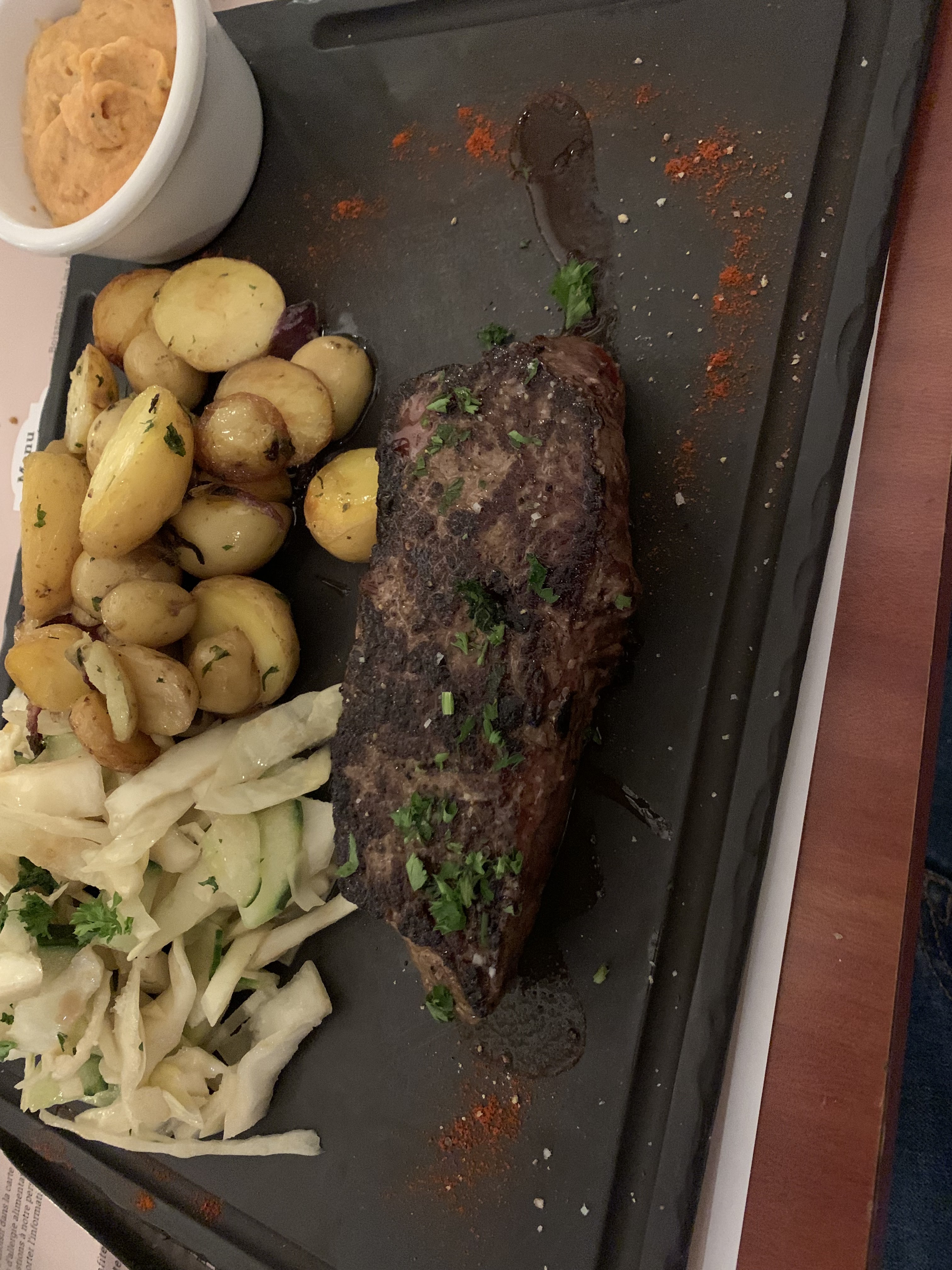 Une amie m’a recommandé ce restaurant pour son tartare coupé au couteau! C’est servi avec la sauce séparée et un peu de cognac pour mélanger avec la viande. C’est vraiment particulier! Je recommande!