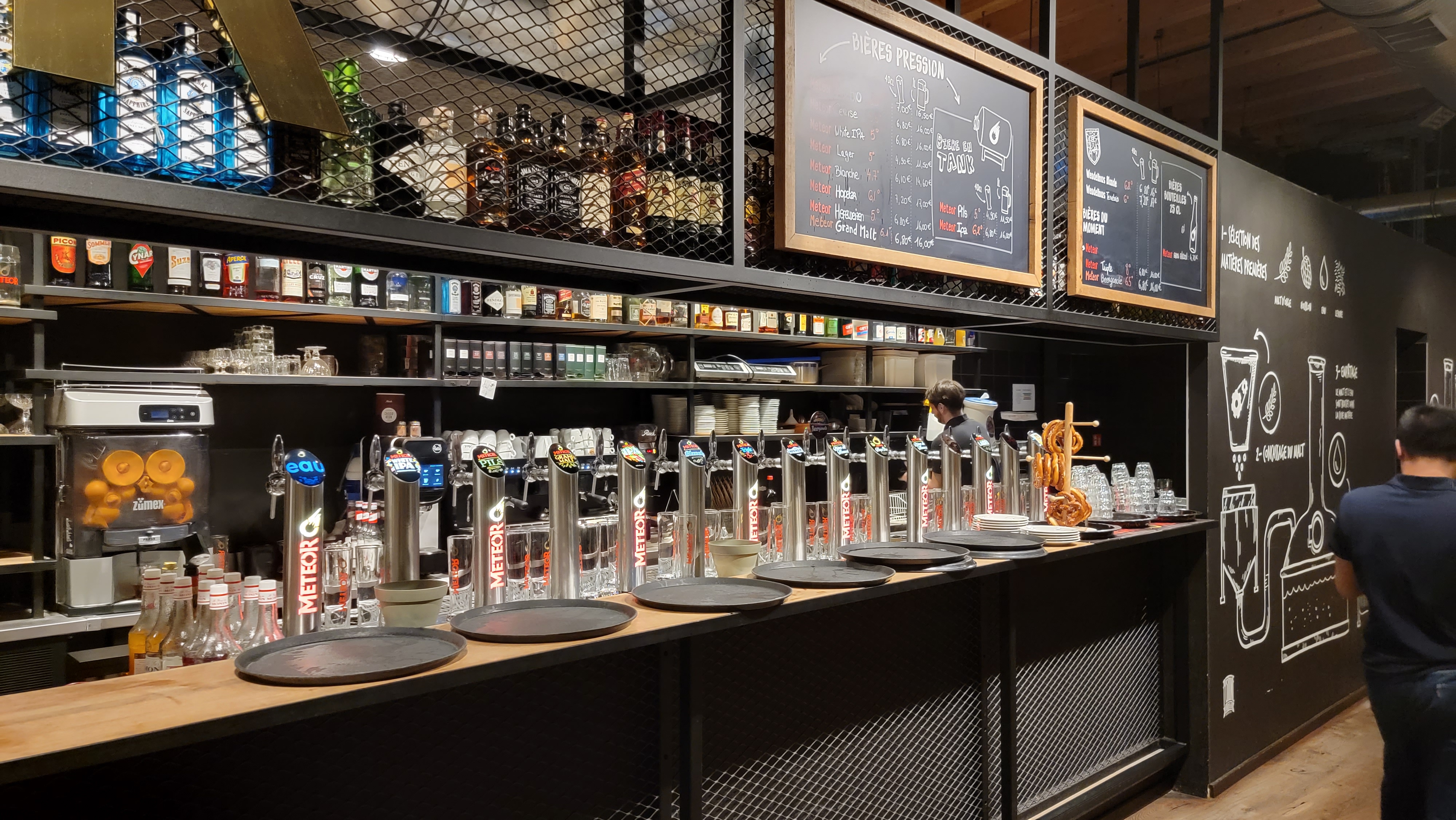 Un restaurant et bar d'une entreprise originaire d'Alsace. Une décoration sublime et qui nous plonge dans l'univers de la bière. Des flammekueches délicieuses, cuites au feux de bois. Serveurs très sympathiques. Superbe moment chez Meteor