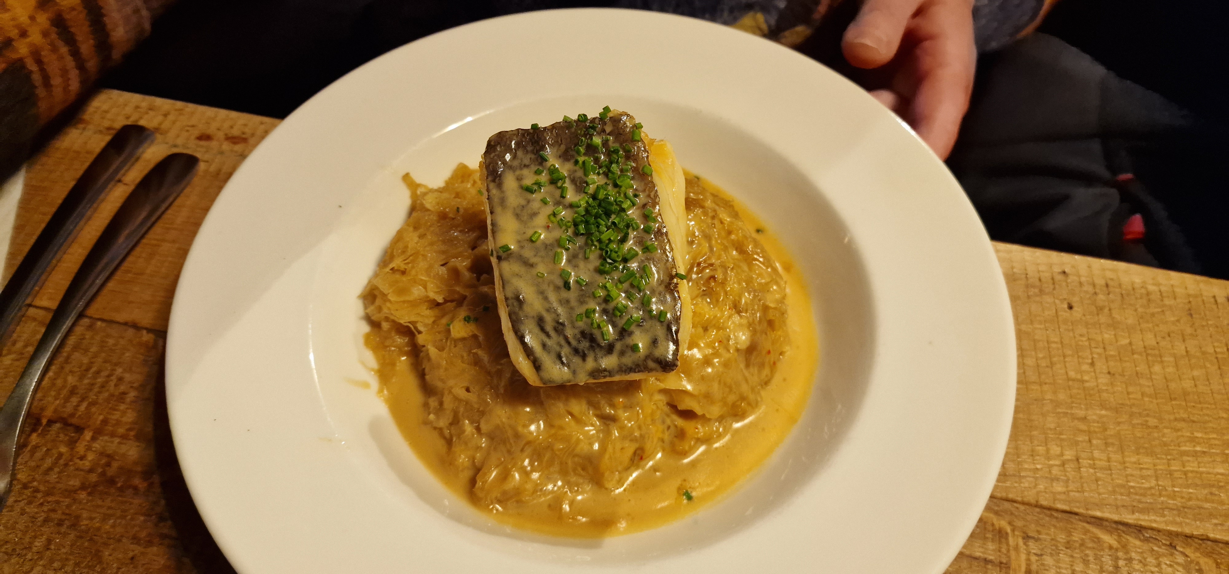 Tarte flambée excellente, étant alsacienne je sais de quoi je parle ☺️, pour la choucroute qui est très bien servie, je préconiserai à donner plus de goût au chou que j'ai trouvé très fade, mais toute la viande est très bonne. Musique de noël en fond un peu trop forte, on avait du nous répéter plusieurs fois pour parler ensemble (nous étions 2), il faut dire que l'un des faut parleur était au dessus de notre table. Sinon, pour une première on a bien aimé, je reviendrai pour la tarte flambée 👍.