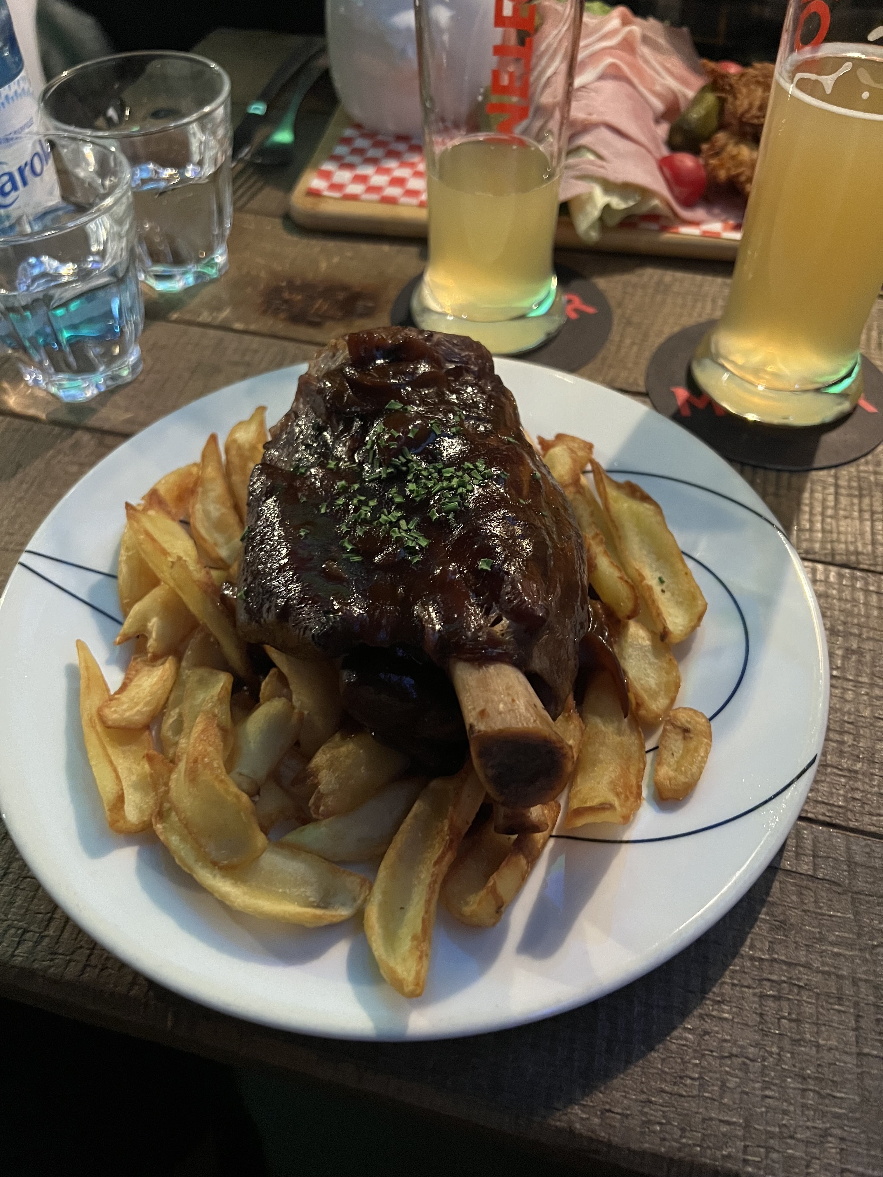 Je ne suis pas habitué au service français, donc c'est probablement plus une question de moi. Il est très lent d'obtenir des boissons supplémentaires. Le personnel est sympathique et prend une éternité pour revenir si vous voulez plus de boissons/nourriture. Maintenant, la nourriture - des portions incroyables et très bonnes ! Le jarret de porc, ou quel que soit son nom, était si énorme qu'il nous a fallu trois pour le manger ! Ça vaut vraiment le coup. Les bières sont solides - assez simples à déguster mais ne vous épateront pas !! Dans l'ensemble, ce n'est pas un mauvais endroit.