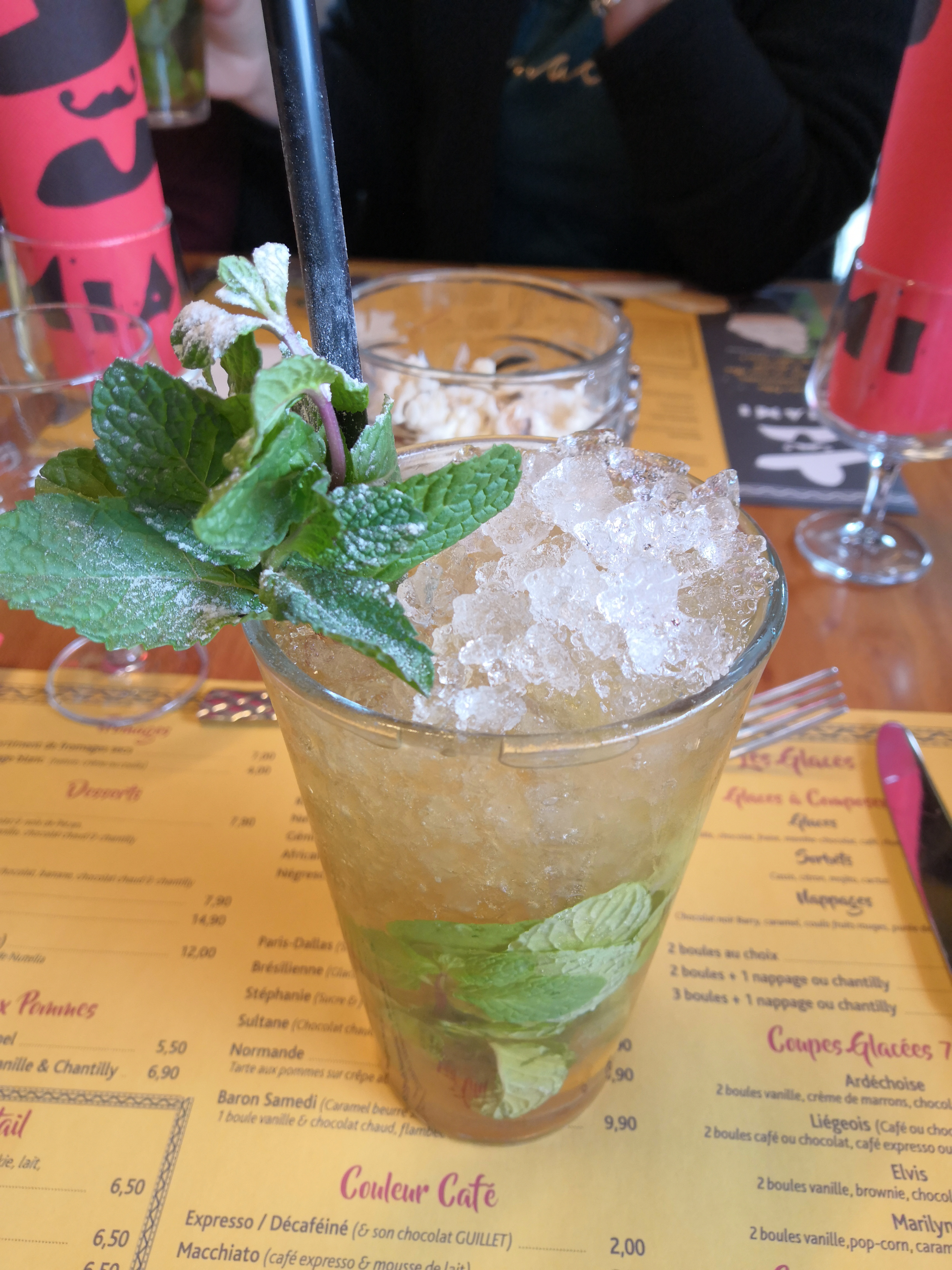 Repas du midi, nous étions 7, service assez rapide. Plats copieux et bons. Mojito excellent ! Desserts également copieux et bons. Très bon accueil, déco au top ! Le petit bémol je dirais prix un peu élevés. (en photos mojito et enchiladas)