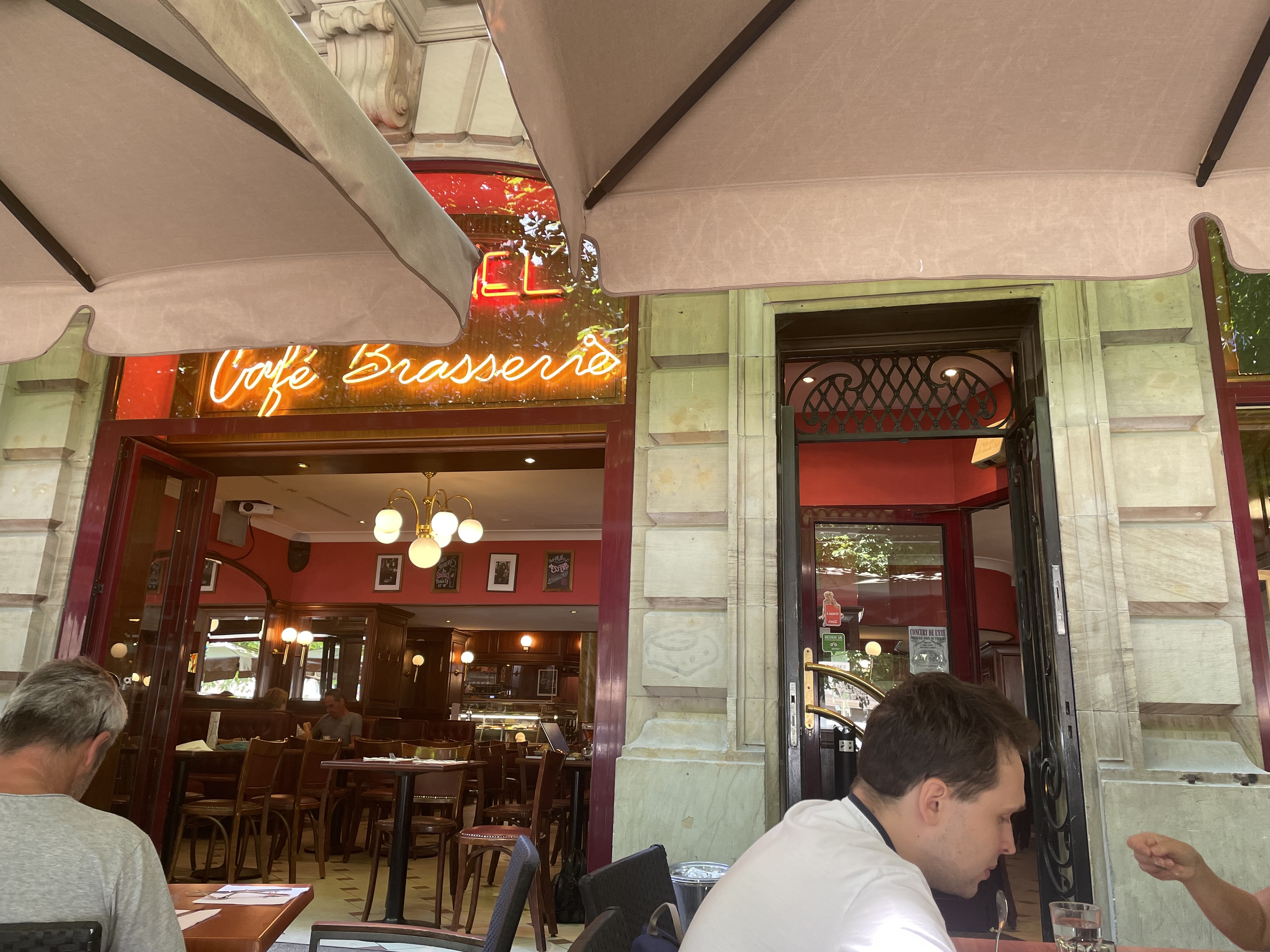 Lieu parfois un peu bruyant mais au charme certain. On peut s'y poser pour un court moment ou pour travailler sur son portable ! Service professionnel. J'aime le coté historique et traditionnel. La petite terrasse coté trottoir est un peu limite : on a l'impression d'être coincé entre le tram, la piste cyclable et les piétons qui passent... Cuisine classique dans ce type d'espace mais on ne vient pas que pour ça !