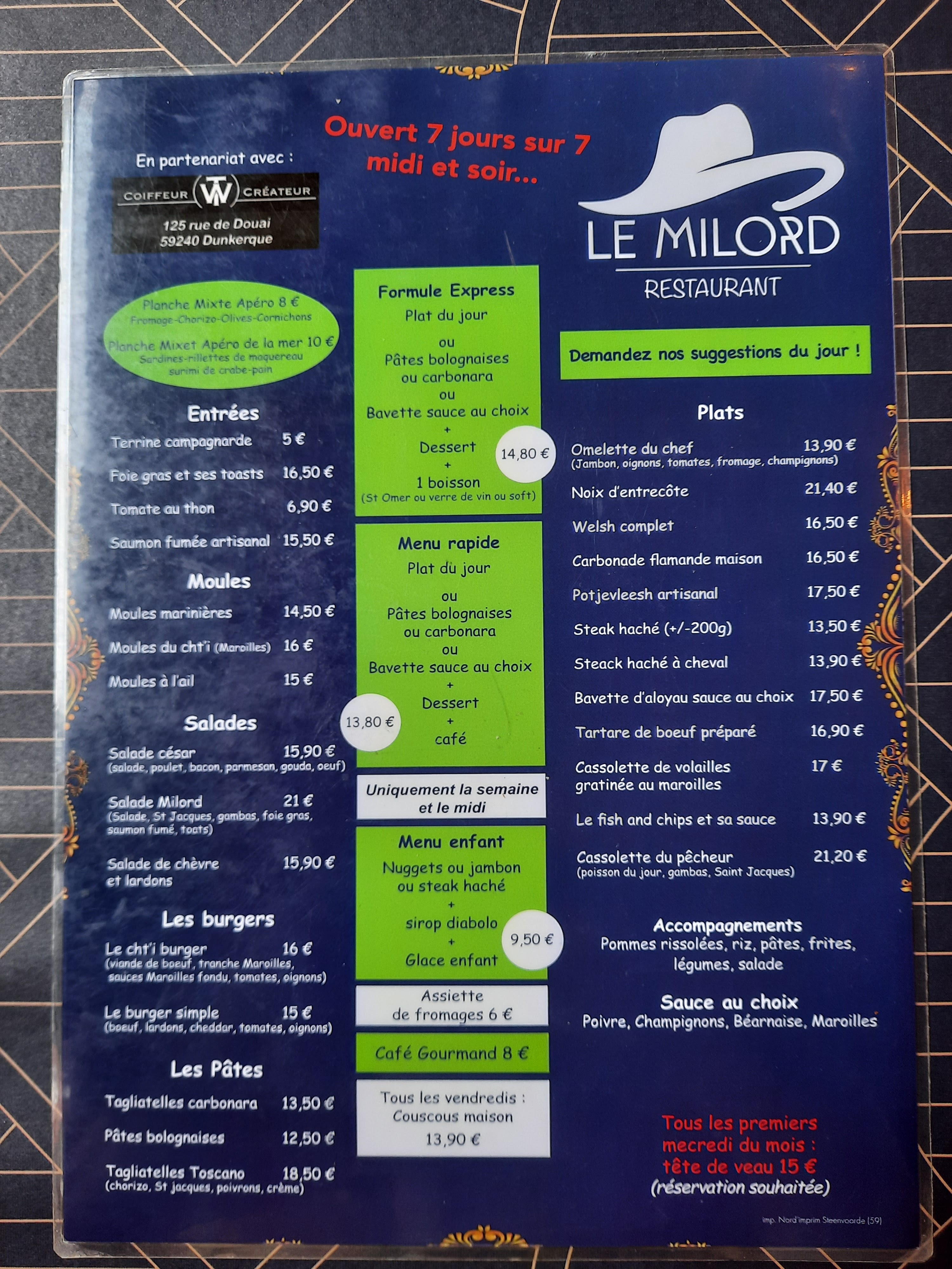 Nous avons été déçus par le milord. Le lieu n'est pas bien entretenu, moquette à revoir, branchement électrique inquiétant.. Nous n'avons pas eu le choix sur la carte car ils n'avaient plus rien, le service était limite, obligé de demander X fois la commande des boissons, le repas est copieux mais n'est pas du tout à la hauteur du prix affiché ! 15e pour un tartare de bœuf, sans câpres, sans jaune d'œuf, sans Tabasco, avec 1/2 échalote et des frites congelés qui ne font même pas illusion ! Je déconseille d'aller manger là-bas, c'est juste bien pour boire un verre mais il ne faut surtout pas y manger !! Il y a de bien meilleurs restaurants sur Dunkerque, chez qui on se régale et on passe un bien meilleur moment pour un prix similaire ! Je désapprouve complètement !