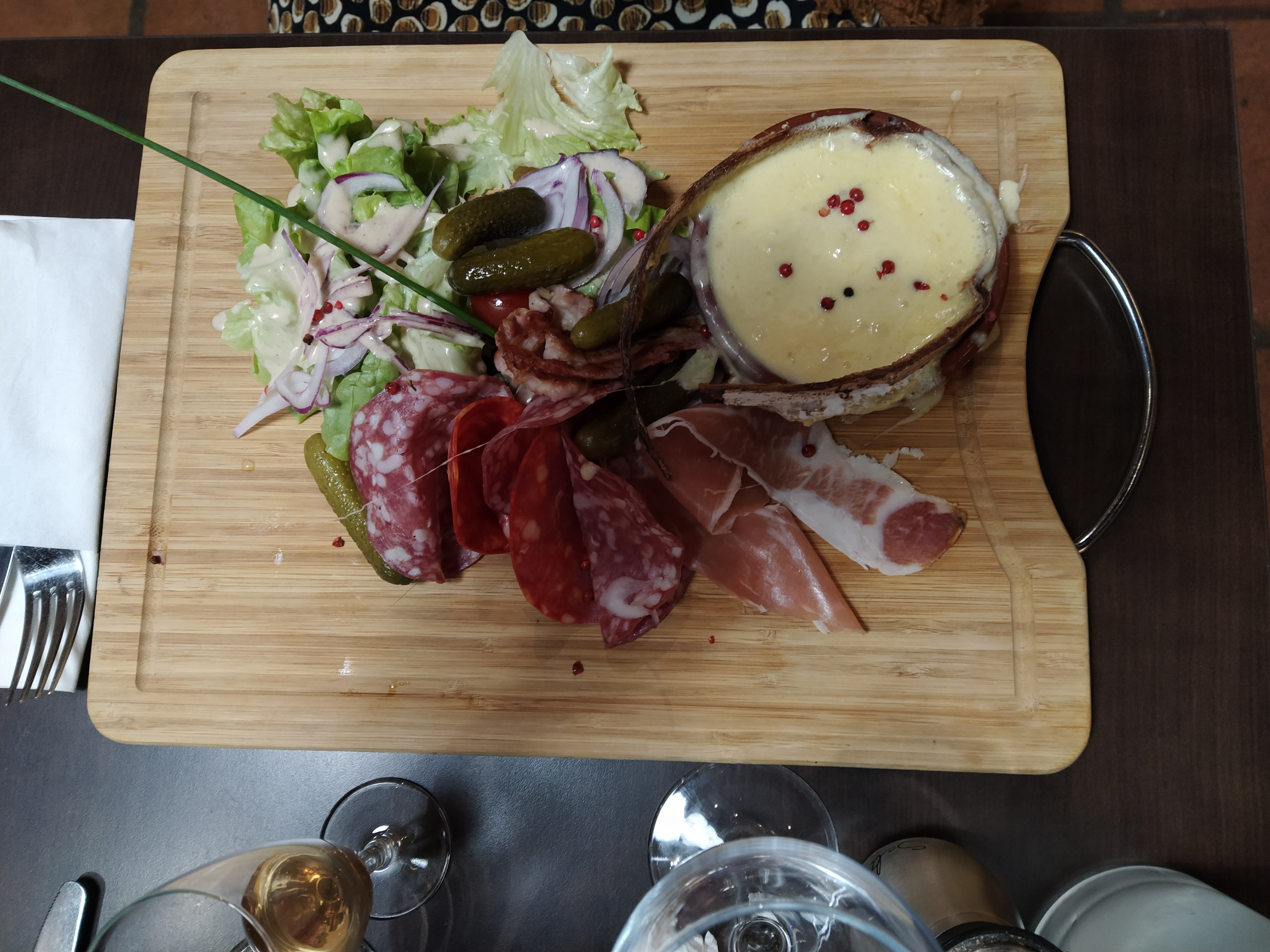 Gardiane de taureau délicieux. Par contre pour les Francs Comtois, le Mont d'or décevant. On a dû réclamer les pommes de terres et le pain. On nous a apporté un plat avec une petite pompe de terre, le Mont d'or tiède.On ne nous a pas demandé si on voulaient boire du vin avec nos plats. On a bien senti que nos remarques avec le sourire ont carrément gavé un serveur. 😕