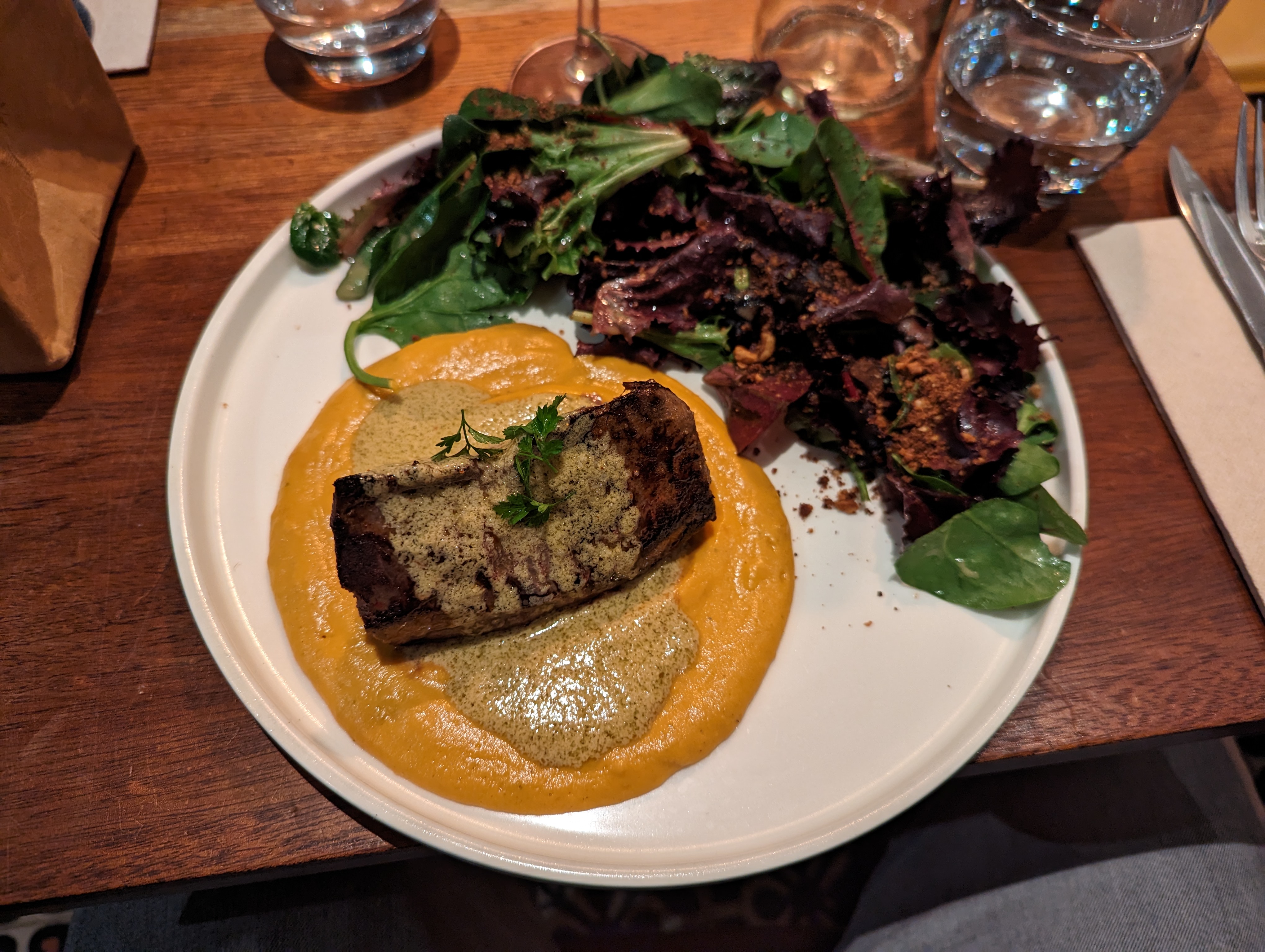 Personnel charmant et accueillant et ambiance conviviale et animée. Seulement 3 étoiles, cependant, car le steak était assez dur avec des cartilages non comestibles. Le menu en ligne montre du rumsteck, mais le plat du soir était du steak de paleron. Je suppose que, comme toute entreprise, ils sont aux prises avec la crise du coût de la vie et, plutôt que d’augmenter les prix, ont pris la décision de proposer une coupe de viande de qualité inférieure pour le même prix. Compréhensible, mais dommage, car le paleron est, à vrai dire, plus adapté aux cuissons longues et lentes comme le tressage au four.