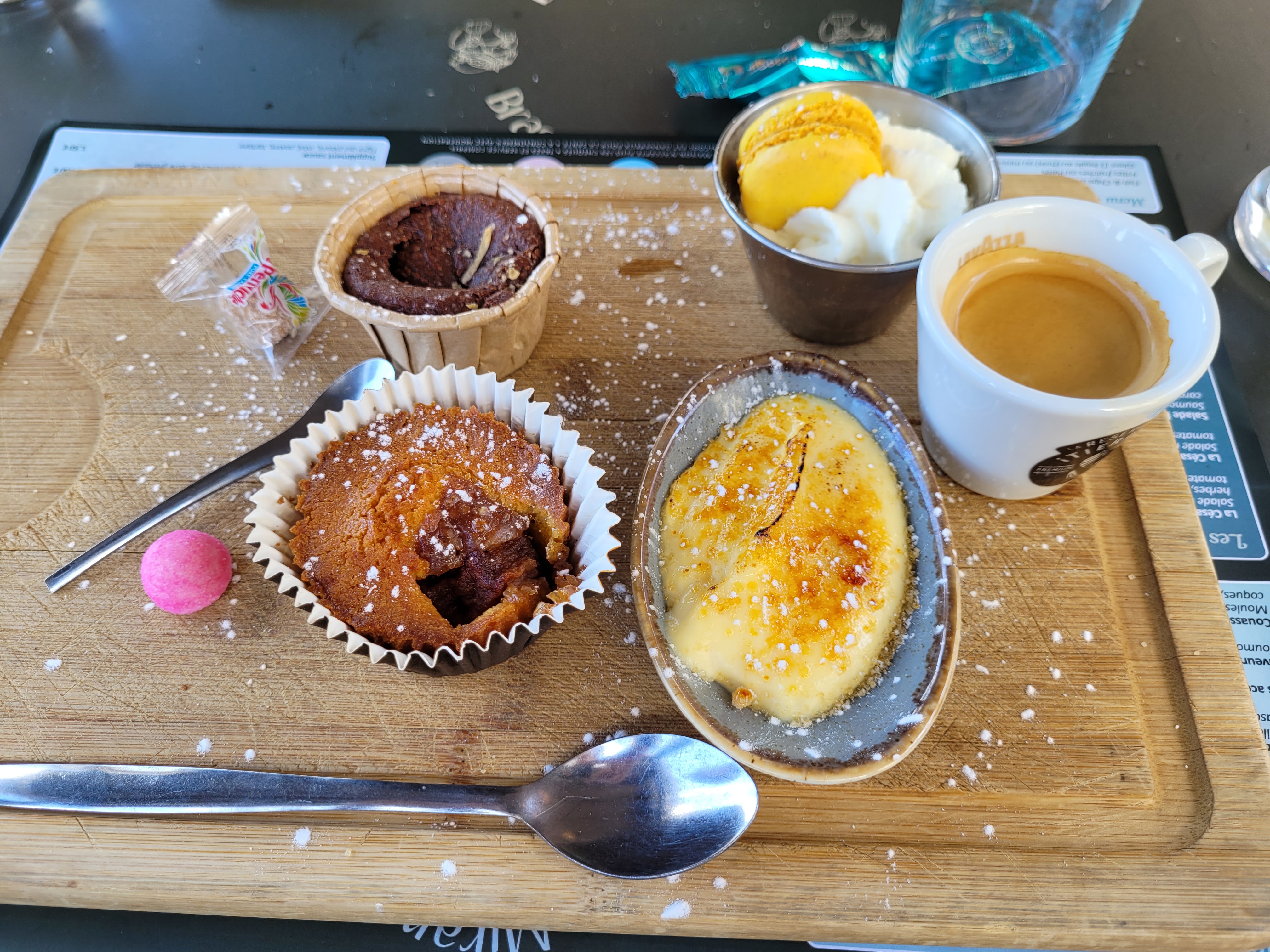 Le restaurant est sympa,original dans sa décoration. Le service impeccable, les serveurs et la serveuse très agréables. Les plats sont copieux et très bons ,et nous les avions pris à partager. Nous n'avons pas pu finir le dessert,la crème catalane copieuse super bonne,et le café gourmand copieux aussi. Le seul bémol, c'était les moucherons envahissants, mais là ce n'est pas leur faute. Je le recommande, vous ne serez pas déçus.