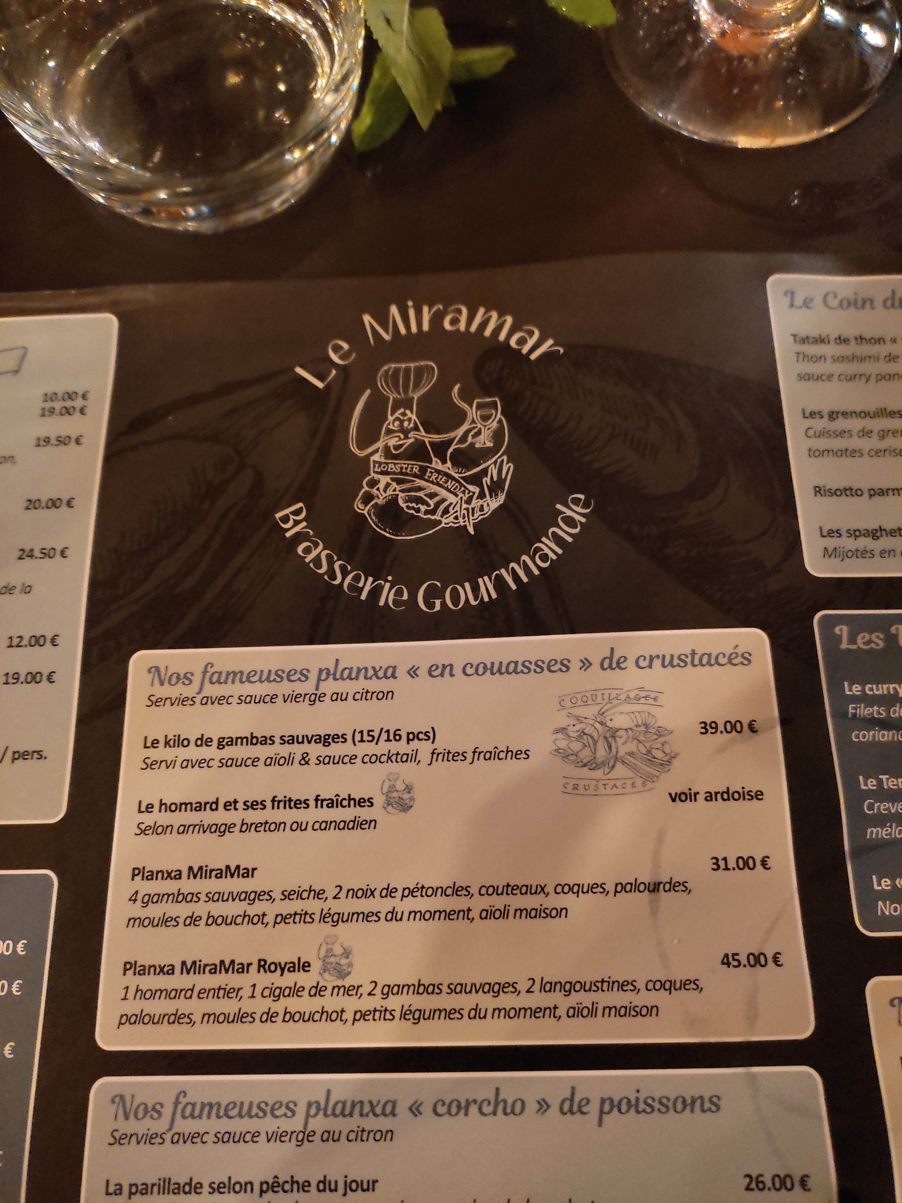 Un peu déçue. Nous connaissons depuis des années le restaurant le Miramar. Il y avait une carte de qualité, des produits de la mer frais et cuisinés de façon simple mais goûteuse. On pouvait y manger les meilleurs moules marinières. La carte a bien changé et maintenant les plats sont trop élaborés, épicés, cuisine du monde. Je n'ai pas compris. J'ai mis du temps à trouver mon plat. C'est dommage, ils ont perdu en authenticité. De plus, le serveur nous avez oublié pour la carafe d'eau et nos verres de rosé. Je ne lui en veux pas, beaucoup trop de monde.