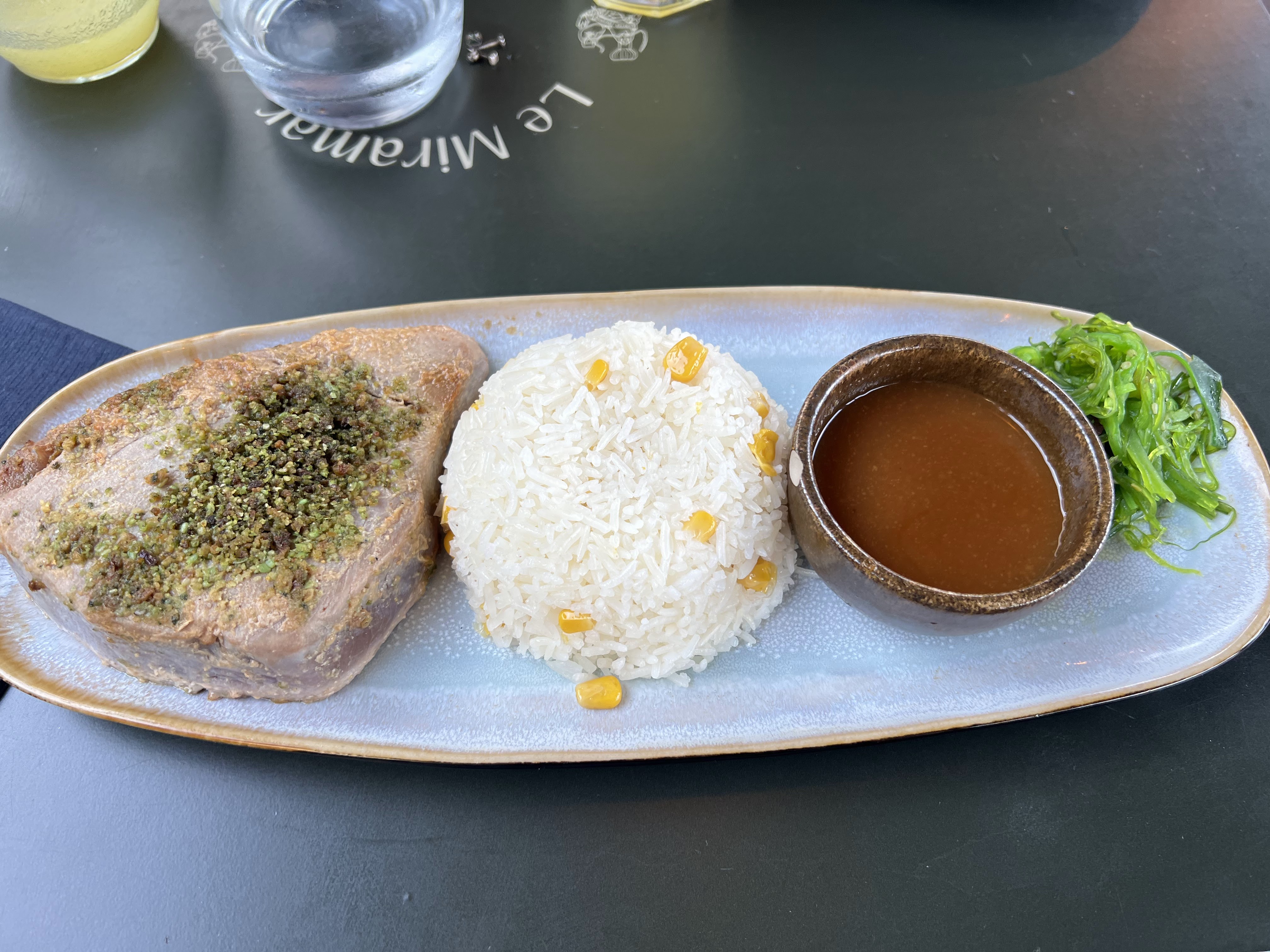 Arnaque de plage Commandé le « tigre qui pleure » à 24€ qui est une pièce de bœuf accompagnée de son riz thaï 5 morceaux de viande ( à tout casser) et super fins Riz avec maïs dedans (???) sans compter les sauces périmées qu’on nous a données, et le fait qu’on doive interpeller les serveurs car sinon pas d’eau Bref, cuisine médiocre, service qui laisse à désirer, passez votre chemin