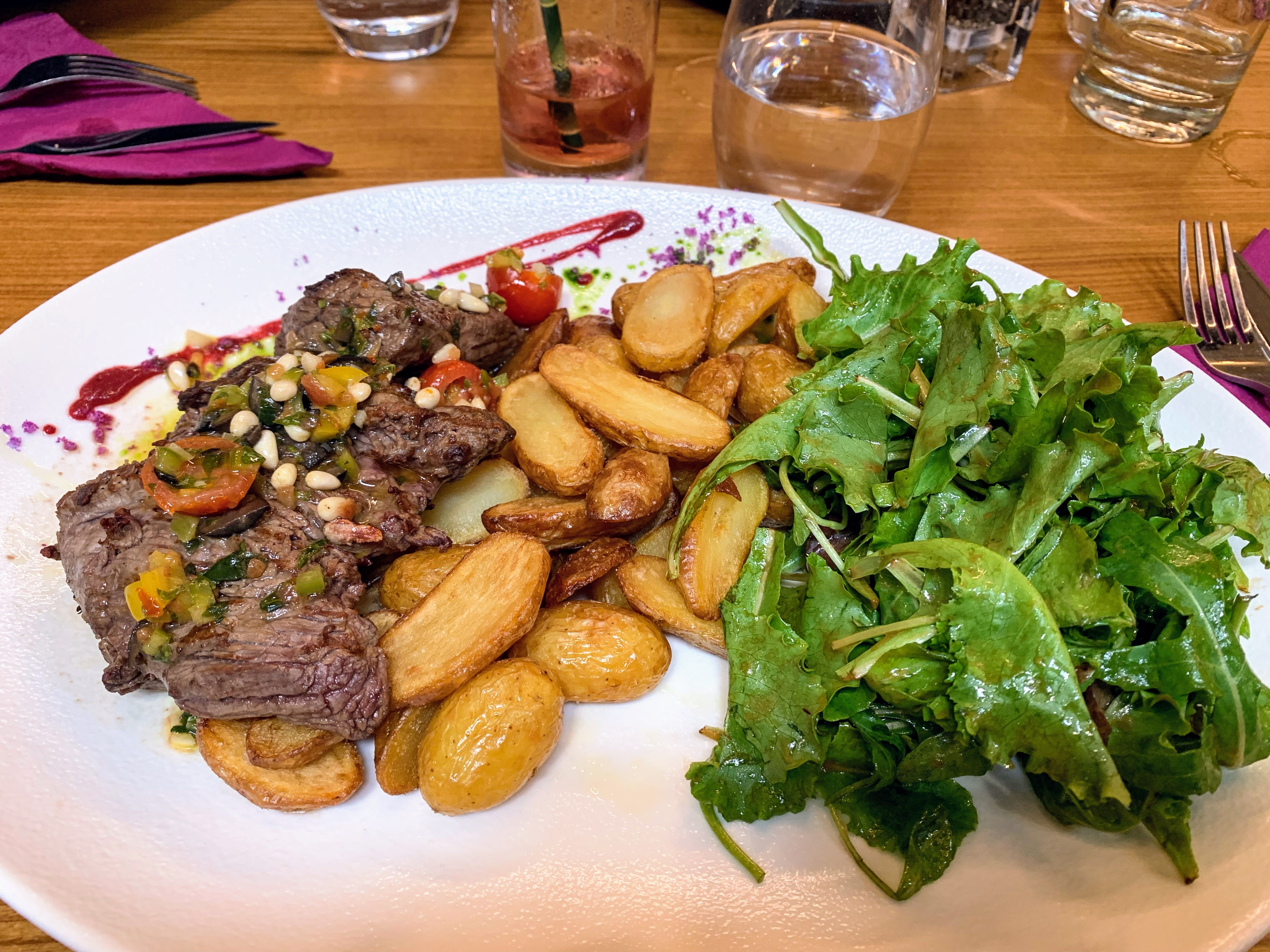 Serveur sympathique et cocktail bien frais ! Entrée plutôt copieuse. A la réception de mon plat, la viande était tiède. Sans plus dirais-je pour la qualité des plats par rapport aux différents prix.